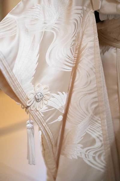 生地はたて糸と、よこ糸共に撚りをかけない生糸を使い羽二重となっており、またたて糸は2本使用することで光沢感をだしています。躍動感ある飛翔鶴がデザインされており、平安貴族の十二単をイメージした「八重仕立て」となっています。「八重」とは幸せを重ねる、という意味があります。