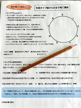 先生のお人柄だと思いますが、本当に分かりやすく、楽しく参加出来ました。私もこっそりタイプ診断をやって、親子関係・対人関係でエニアグラムを楽しめるように使ってみたいと思います。先生がエニアグラムの知識を使い、生き生きと人と接している姿がとても素敵でした。ありがとうございました。(エニアグラム性格タイプ論から見る子育て講座)
