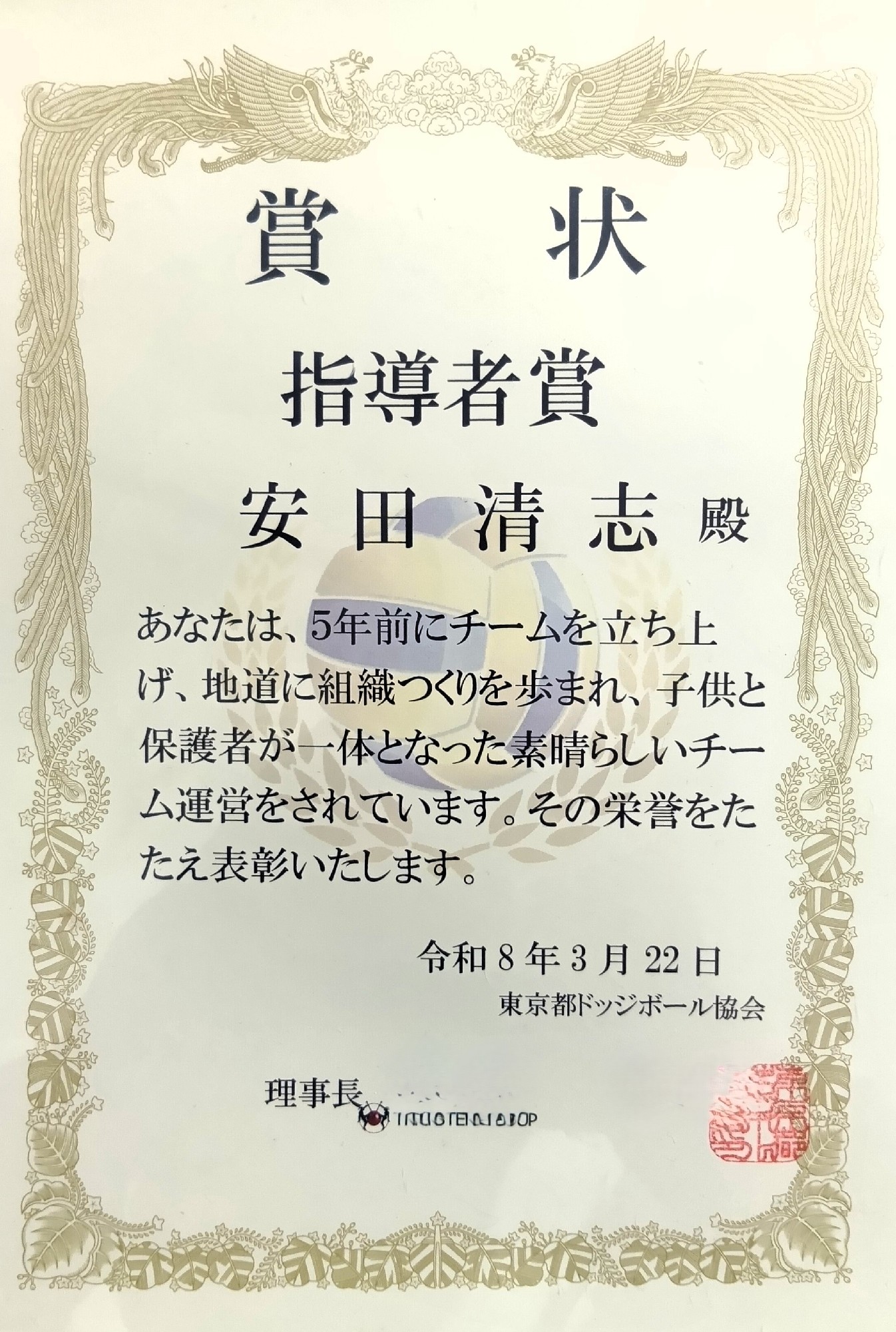 このたび、指導者賞という大変光栄な賞をいただきました。