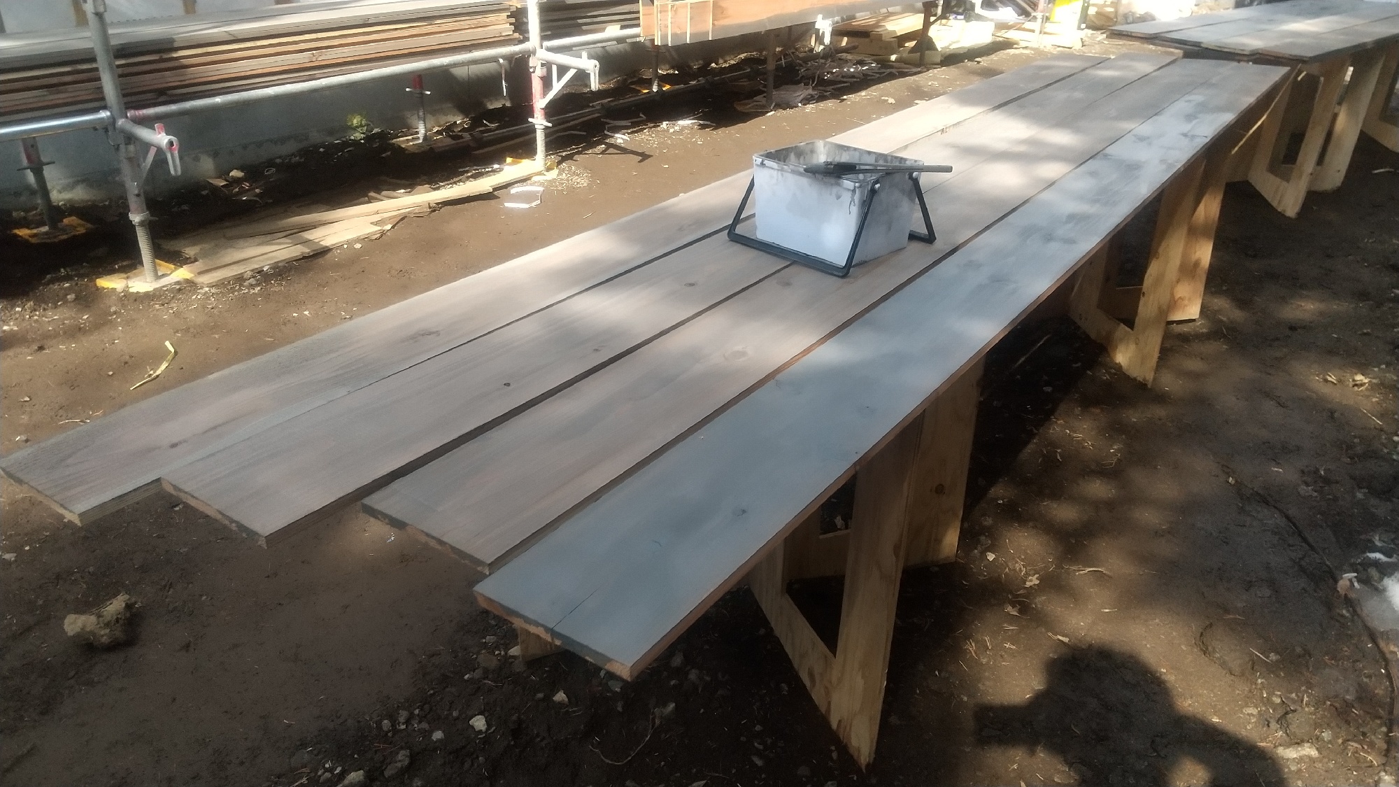 現在、外壁である無垢の杉板に外部用塗料を2度塗りしている最中です。