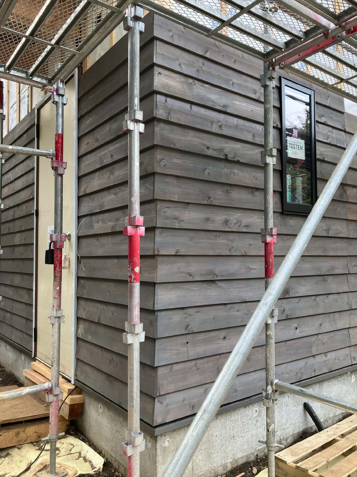 先日投稿した杉板の塗装を行い、ある程度乾燥した板を貼っています。