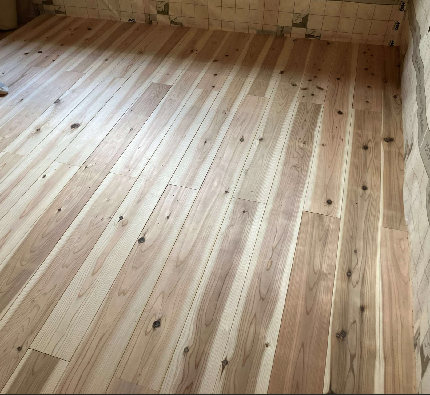 某産地の杉フローリングを採用することになり、現在床貼り作業を行っています。