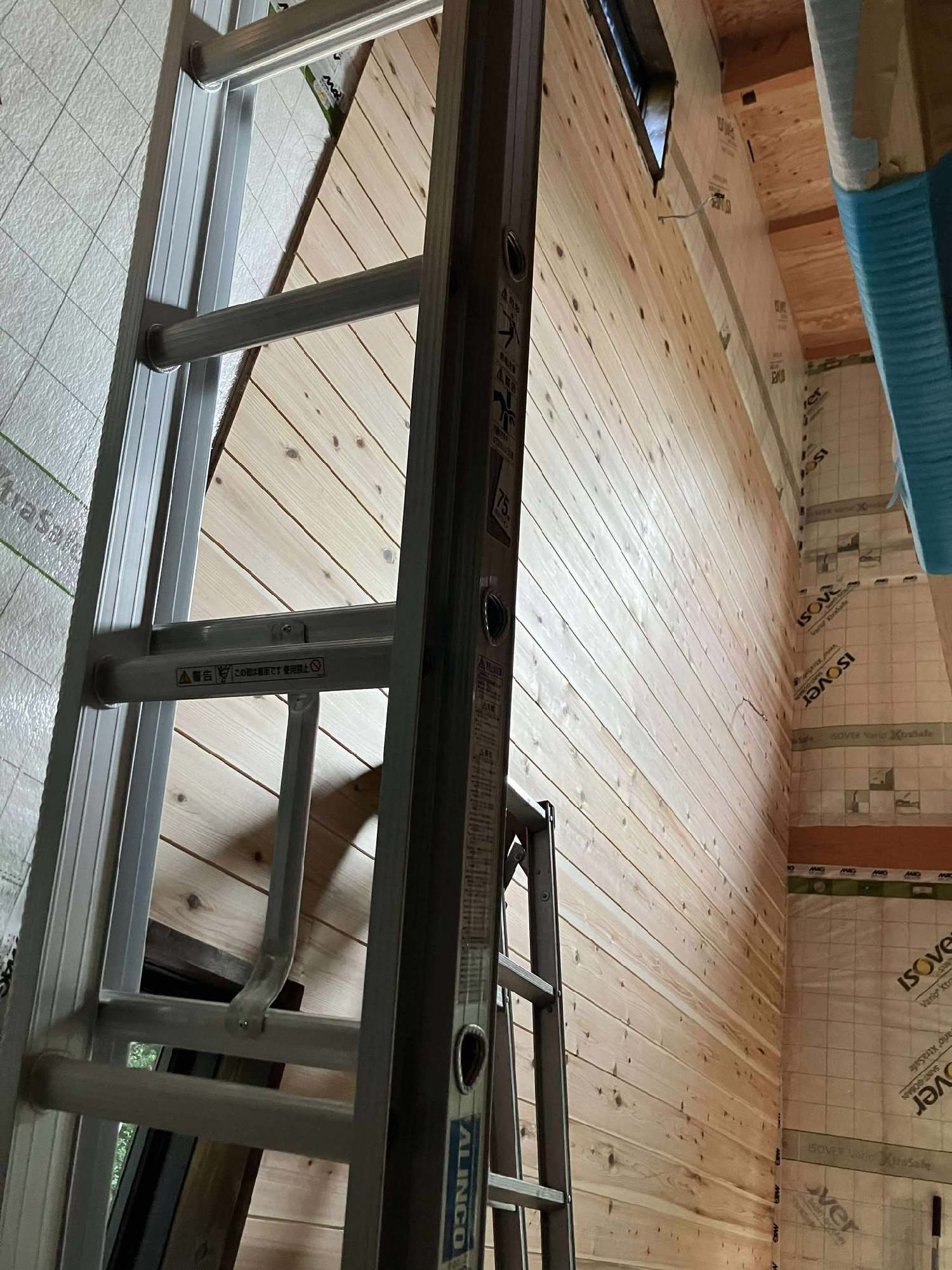 ただいまリビングの吹き抜けの壁面を貼っている最中です。