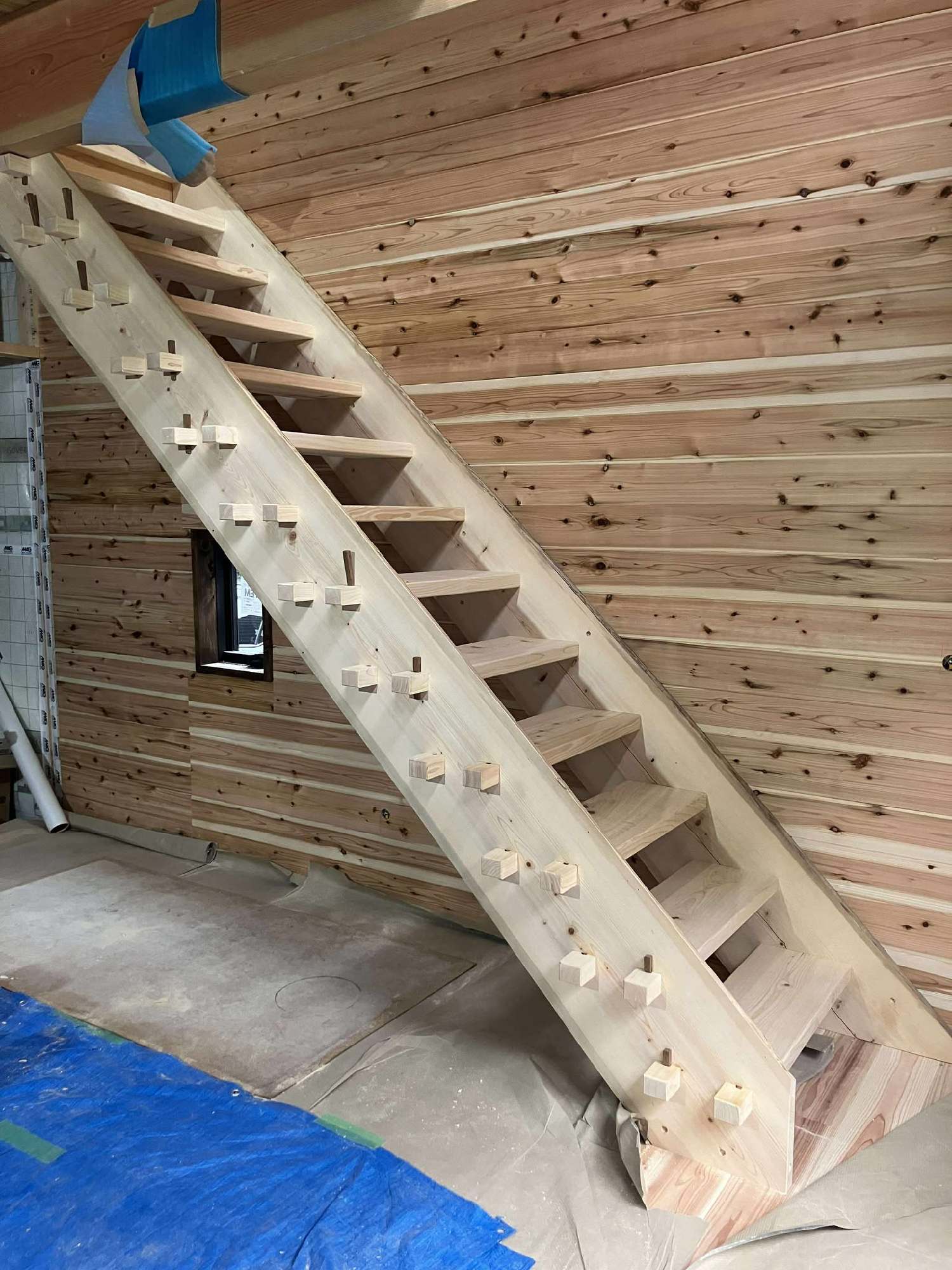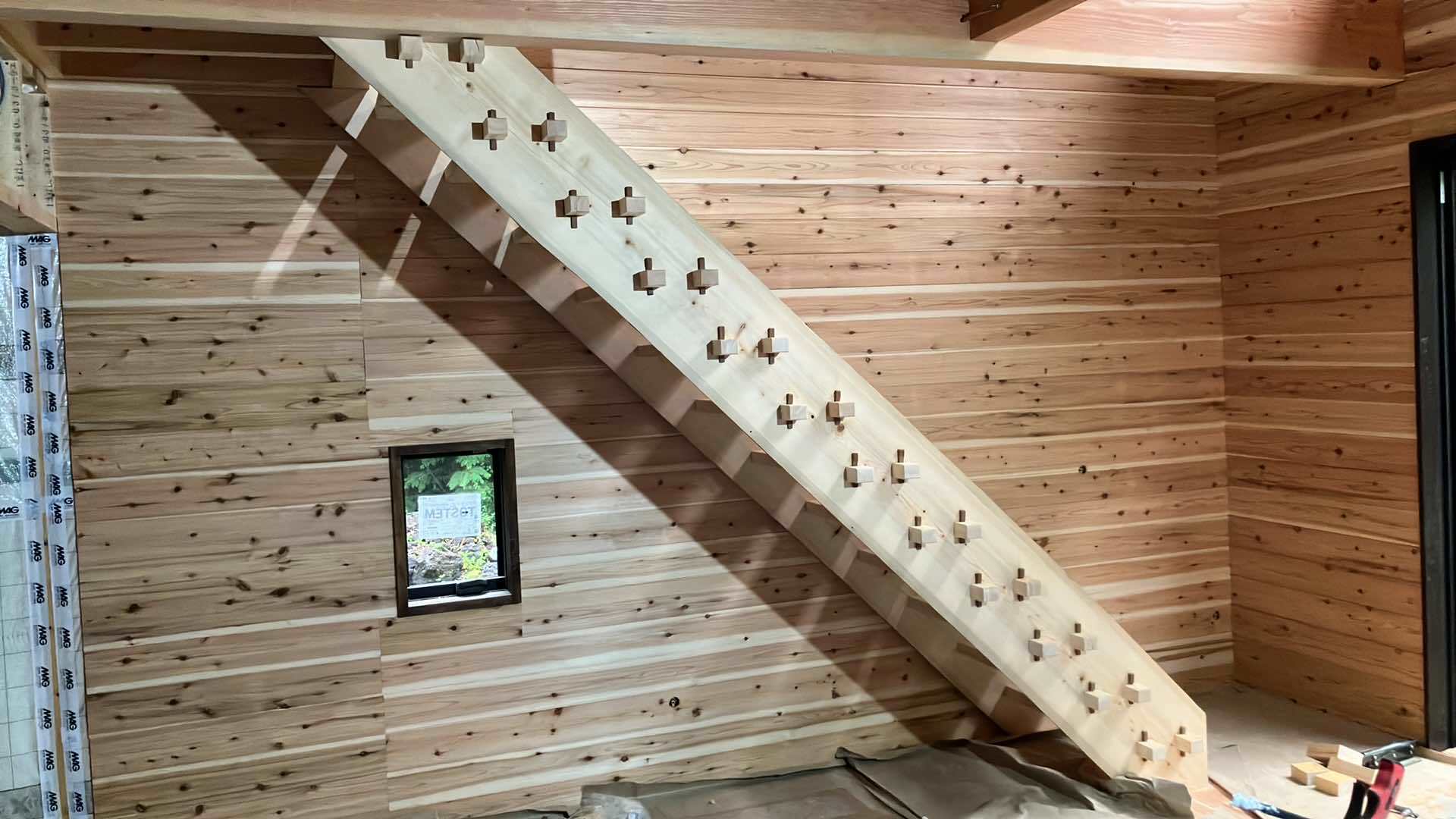 乾燥と共に桧が縮むので固定に緩みがでてきますが、それに伴い楔を打ち込むことで階段の緩みを抑えることができます。