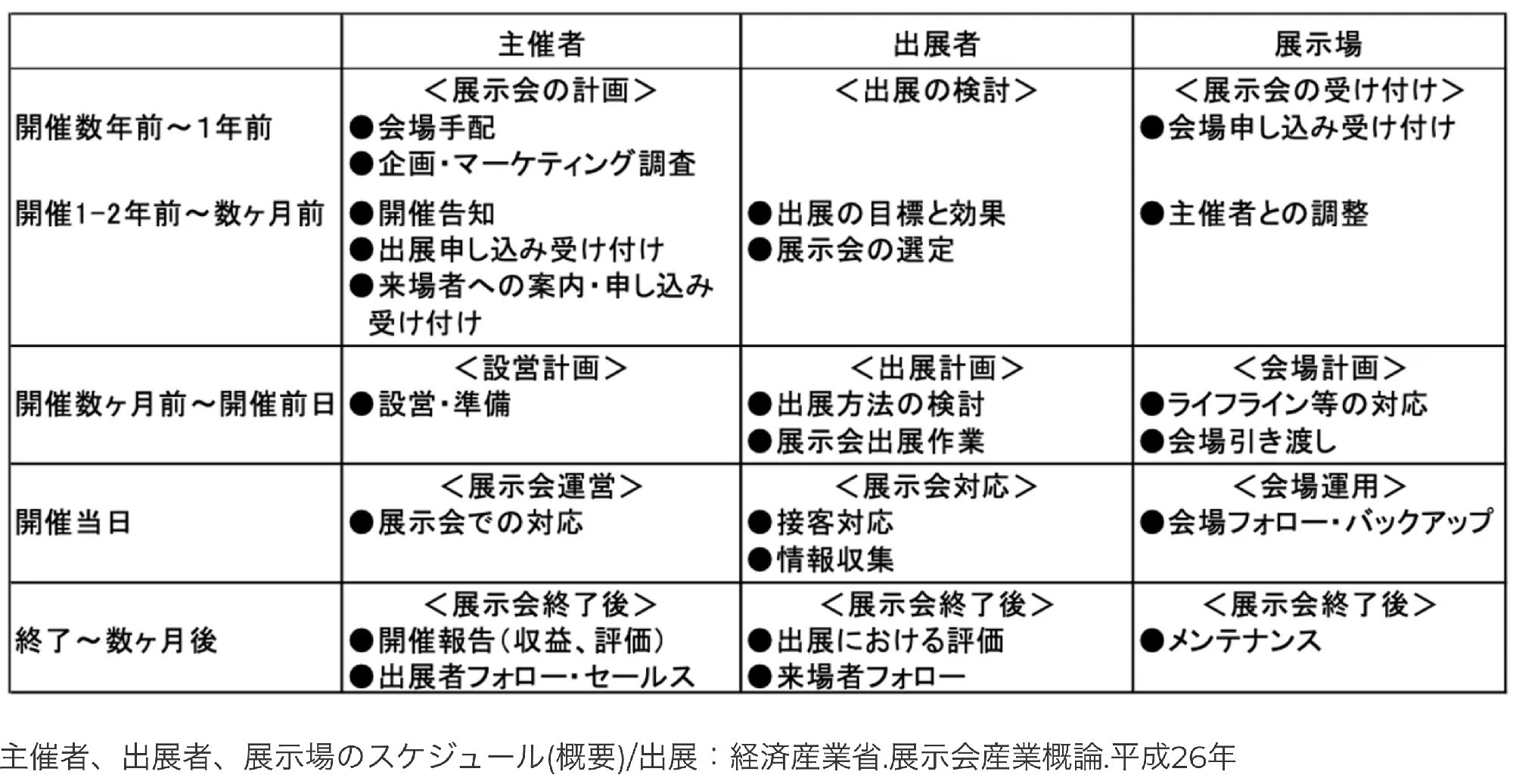 展示会に関わるプレイヤーは、主に主催、出展者、来場者、展示場となります。主催者、出展者、展示場の概ねのスケジュールは次のようになっています。