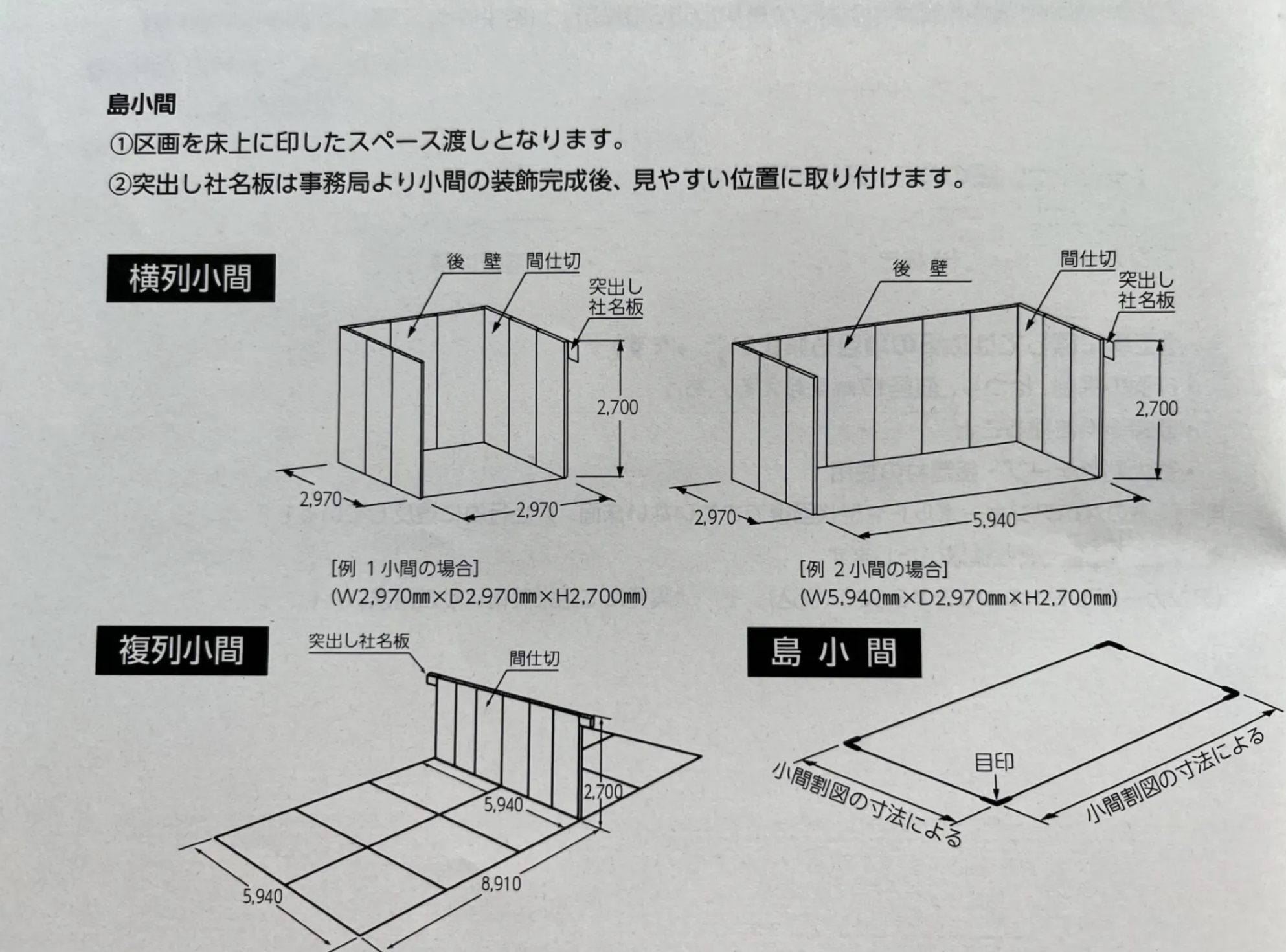 小間は、1 小間が最小(RXJapan 主催は 0.5 小間)で、幅 2〜3m 奥行き 2〜3m 程度となります。4小間の場合は1小間の4倍の面積となりますが、1小間が横に並んだ1×4小間や、正方形に近い 2×2小間など、場合によって変わることがあります。