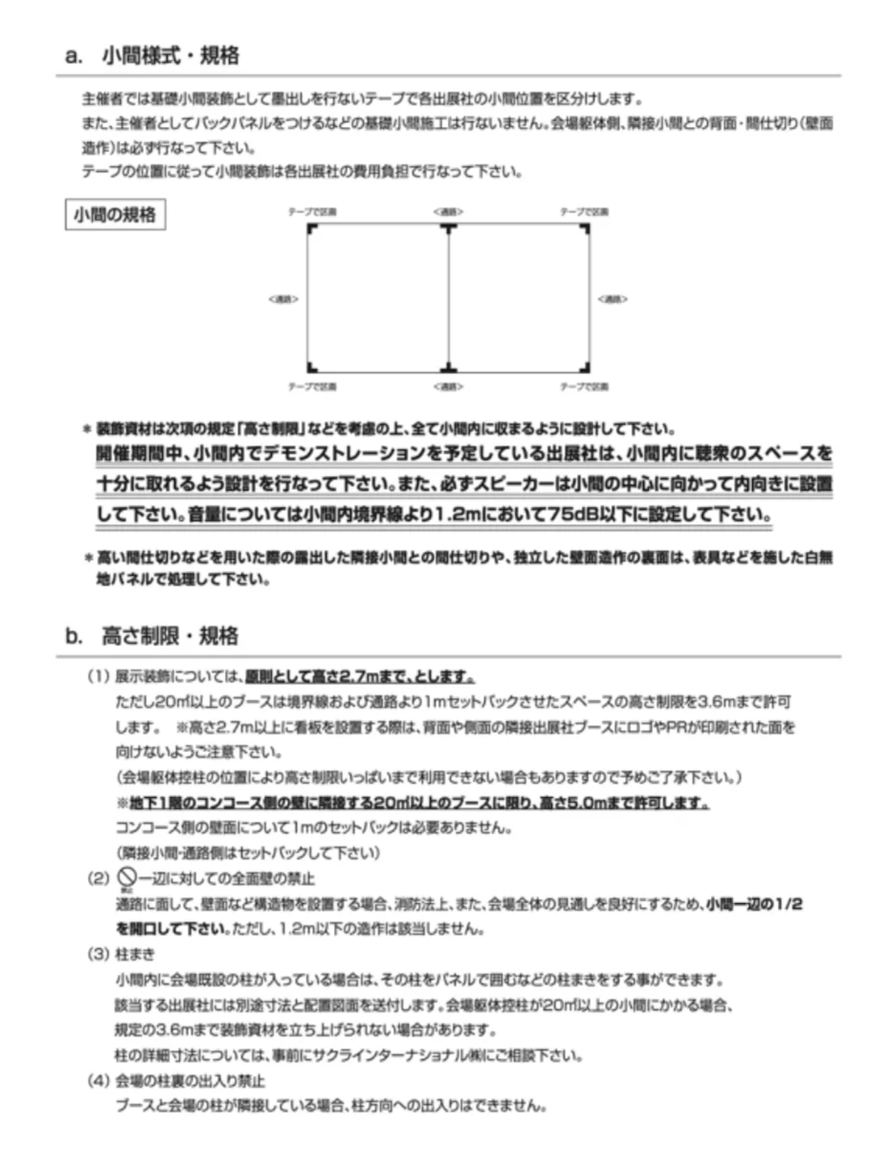 展示会には出展マニュアルが必ずあります。出展マニュアルでは展示会の概要、全体スケジュール、 災害時対応など様々なことが書かれています。展示会ブースの計画については装飾規定が定められ ており、ブースの幅、奥行き、高さなどのブースサイズの制限、会期中に出して良い音の音量、火気の 使用可否などが記載されています。もし規則を破ったブースを設置した場合、主催者から撤去の指示 が出されることもあるので、注意が必要です。