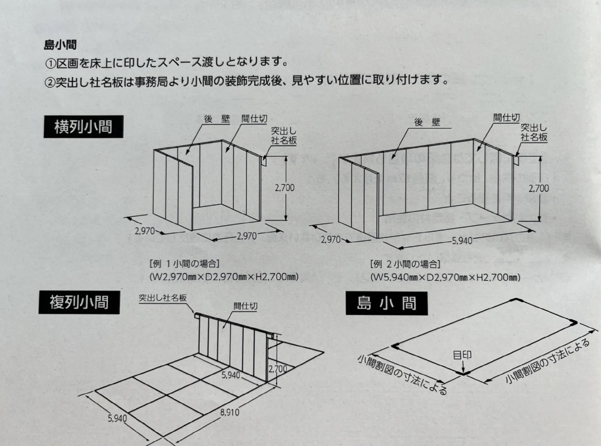 ブースの小間には基礎パネルやパンチカーペット、照明器具などがあらかじめ含まれている場合や、 これらが含まれていない、スペース渡しと呼ばれる場所だけを貸し出される場合があります。