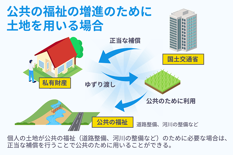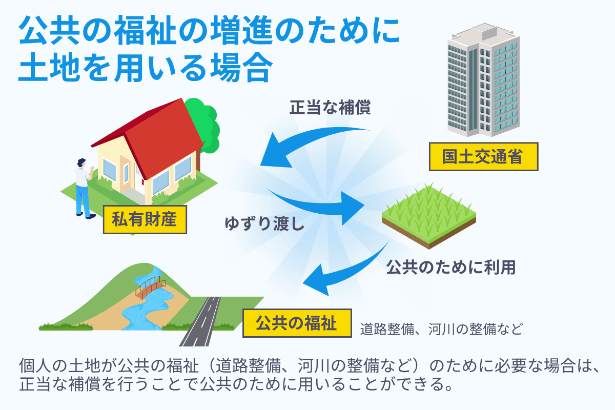 「公共の福祉の実現」を優先すれば、土地所有者は土地を手放すことになり、「私有財産に対する財産権」が侵害されるおそれがあります。