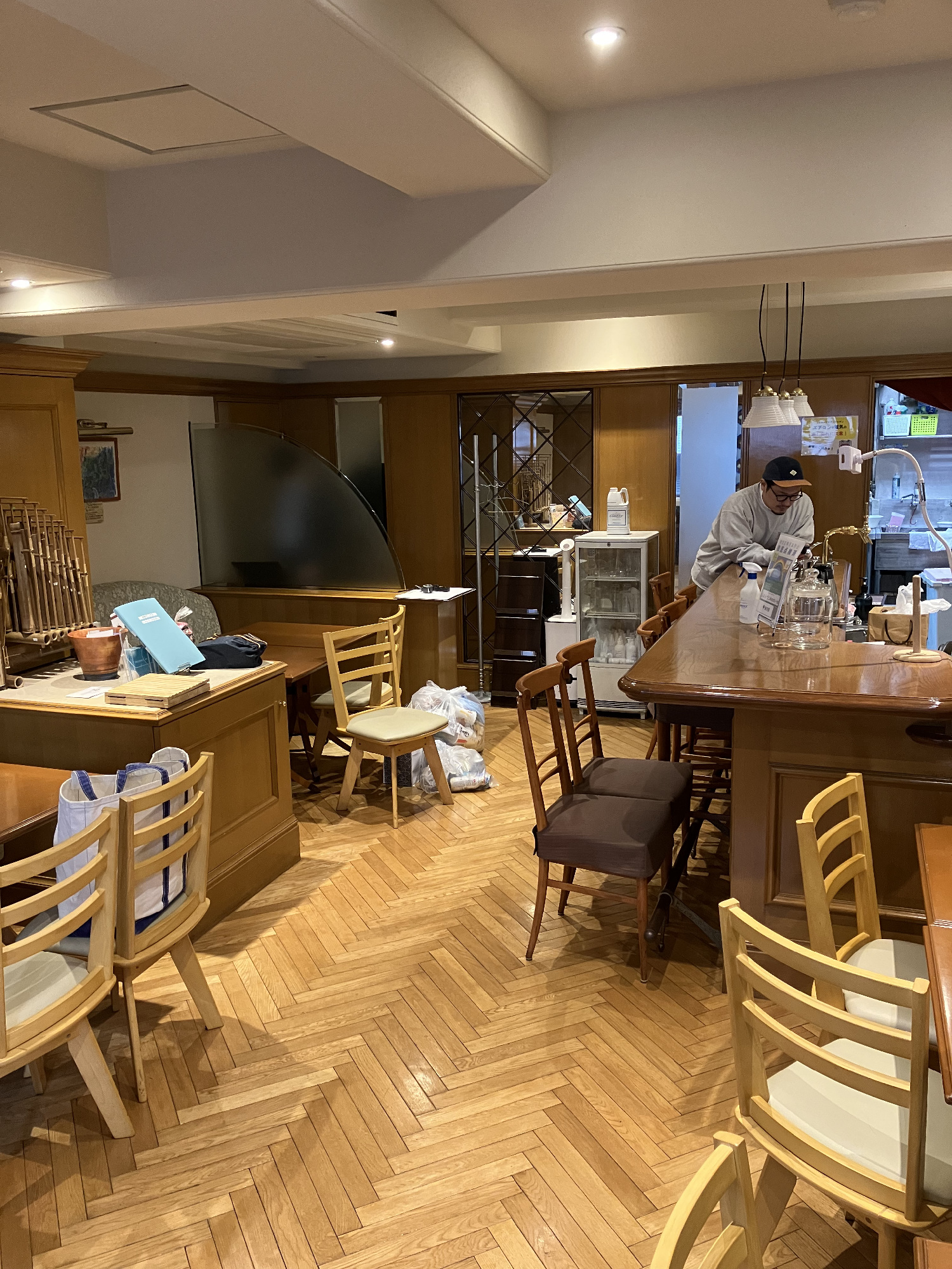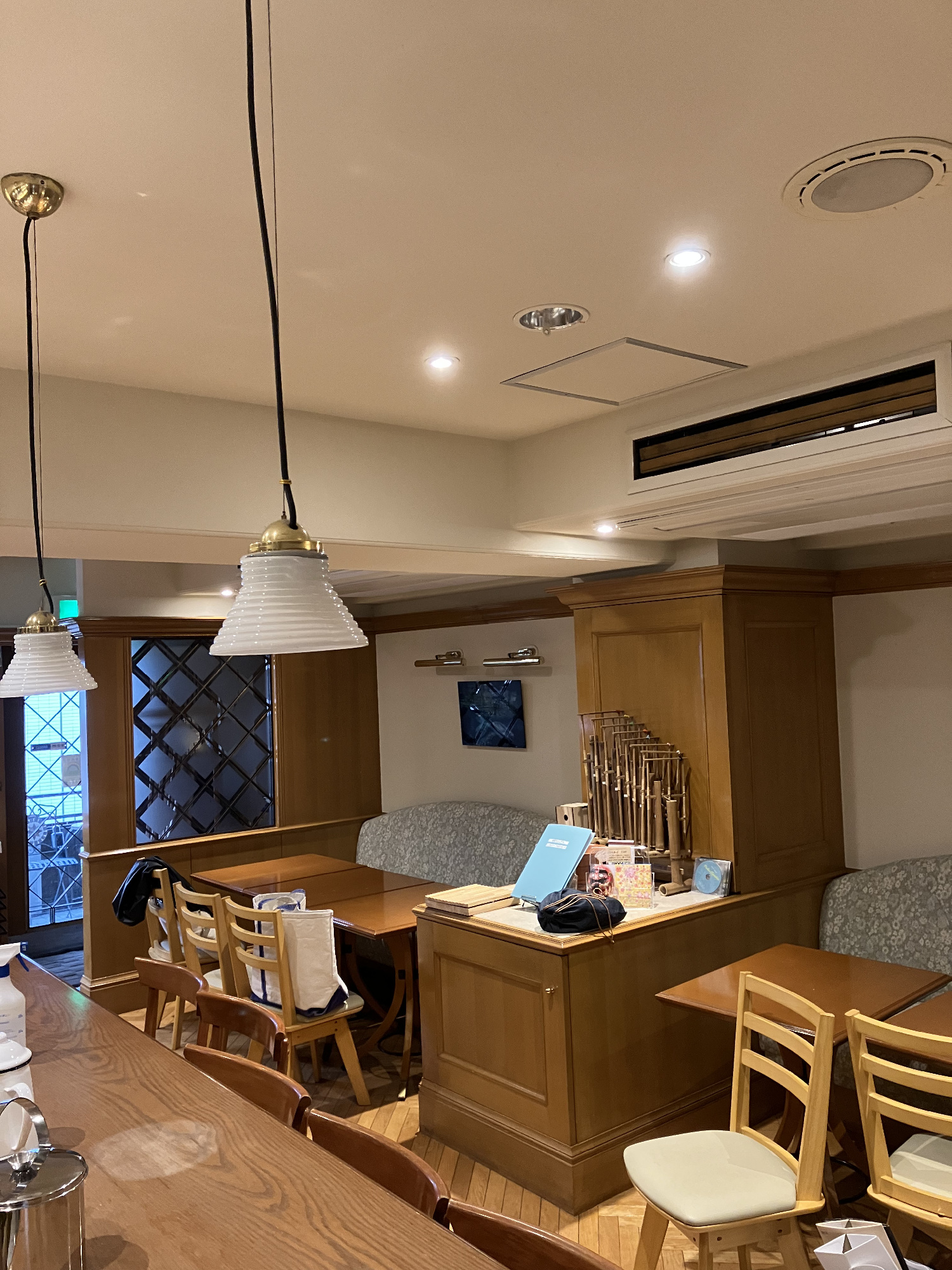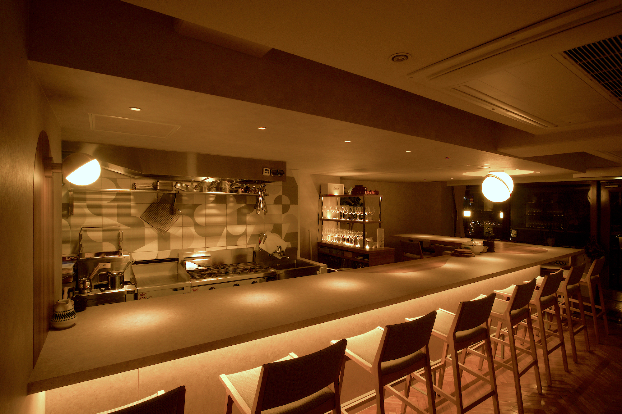 建築構造で天井の大梁にはよく悩まさせられます。いろいろな考えがありますが、お店に食事を行った際には非日常を味わいたいと思う方は多いと思います。その一つお店の空間として天井が高く開放的な印象はとても良いですね。天井が低くて圧迫感が出てくるのは、その逆なので嫌がる方が多いのかなとも思います。ただ仕方ないことですが天井の大梁が多くとても低くなってくるテナントもよくあります。このプロジェクトもそうでした。写真のように元の時は梁を囲い空間を縮めぬ様に最小限の施工でした。勿論、この形状を利用するデザインもありますが今回は思い切って最低高さで低い天井を作りました。アイコニックな照明、カウンターの変形木目柄、キッチン壁のデザインタイルやグラスに間接照明を当て込んで目線や意識がそちらへ向かう様にデザインする事で低さを感じさせない意図ですがうまく行ったように感じてます。