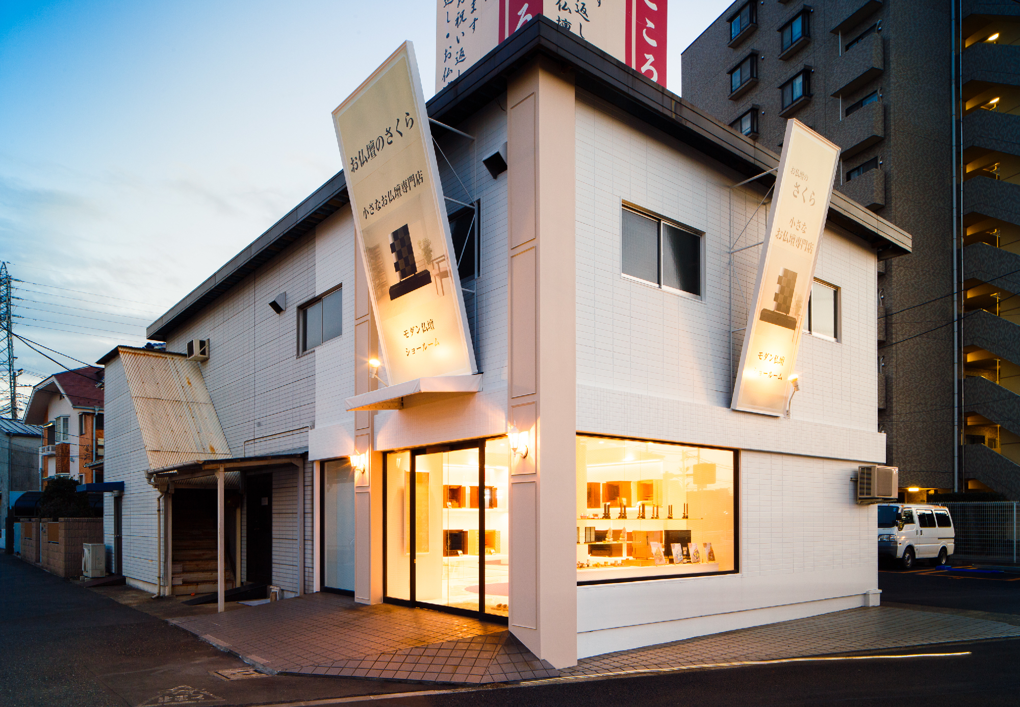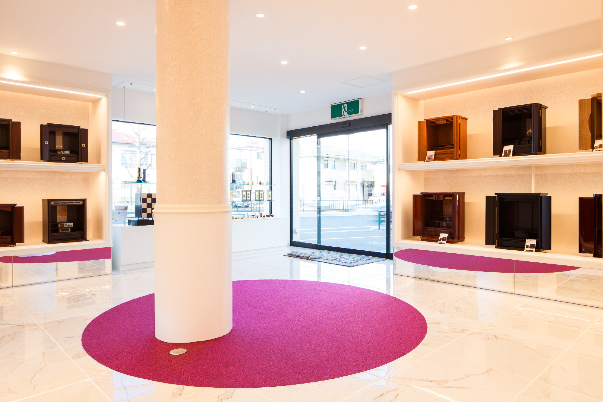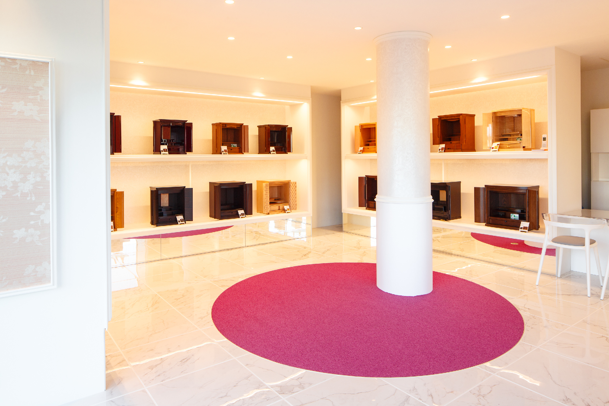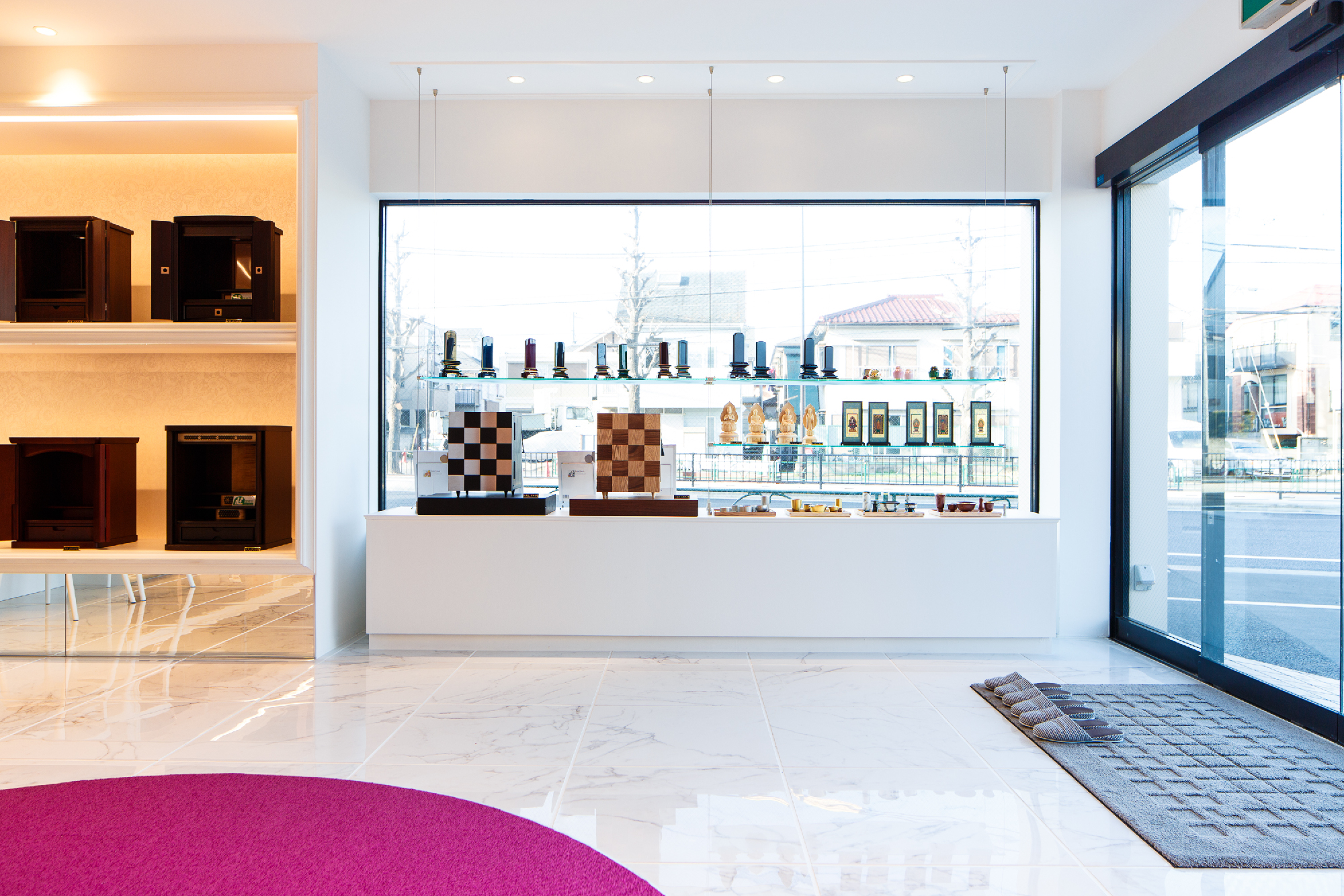 移り変わるお仏壇の需要性。その現代のお仏壇のショールーム。 今まで、これからと、「仏具」のイメージを抱かせない、そんなオーナー様の想いを落し込んだリノベーション。元は倉庫として使用していた場所を現代仏壇のショールームへ。商材は木工クラフトのクリエイターなどが製作するものが殆ど。アート作品として捉え、それらを飾るスペースは美術館、ギャラリーをイメージしながらもスペース自体にも高級感溢れ、清楚で落ち着いた印象を求められた。モールディング・輸入壁紙・ミラーなど色味を統一しながら各所に配置。床材はホワイトマーブルの大判タイルにホワイト目地を使い細部に至るところまで白を使い、混じり気を排除し、清楚感を。そんな中に鮮やかなパープルを入れることで清楚感の中にも高貴な印象を与えてくれることを意図している。