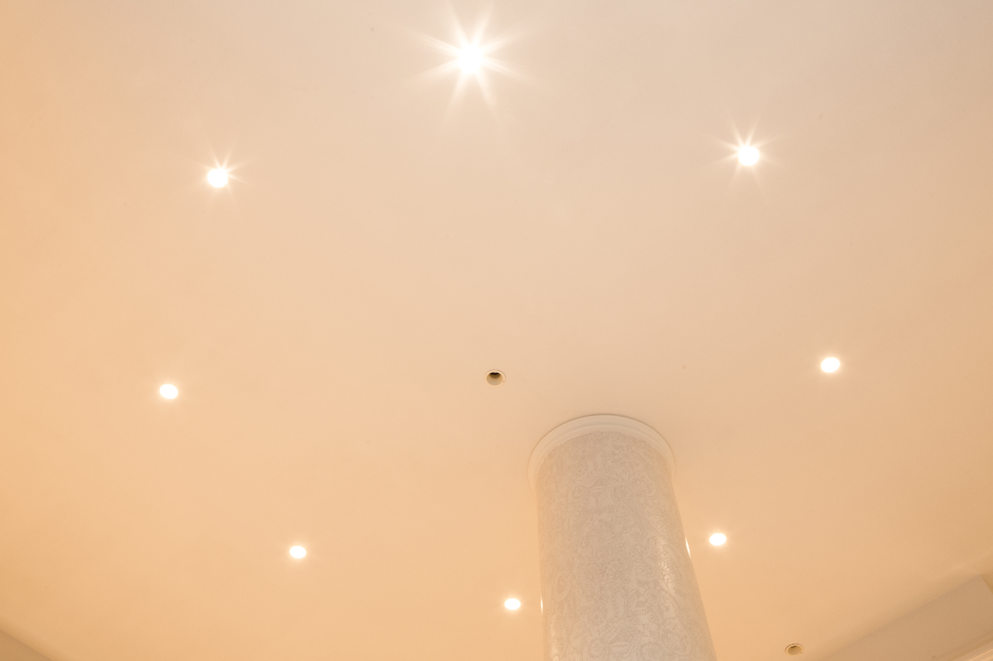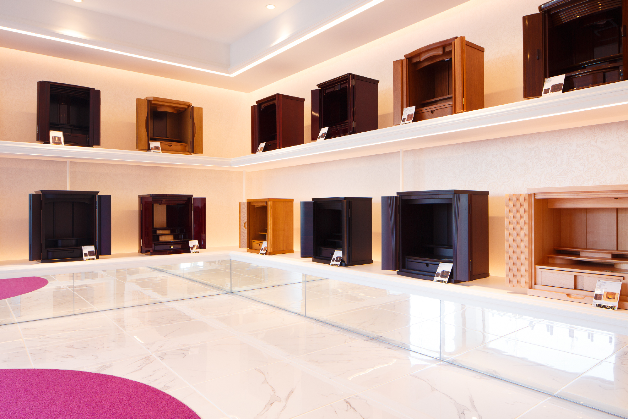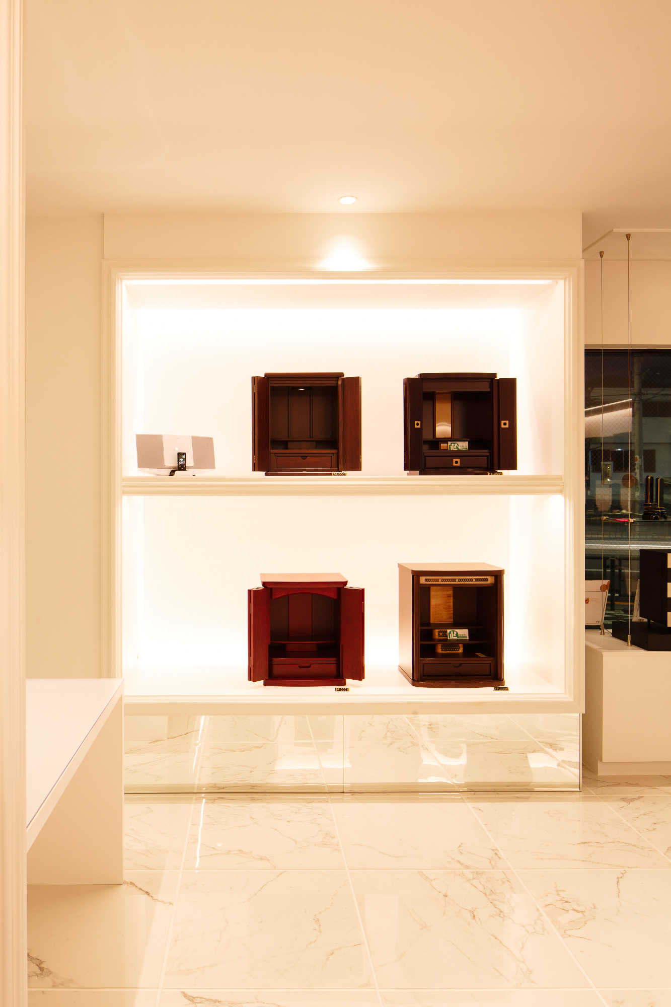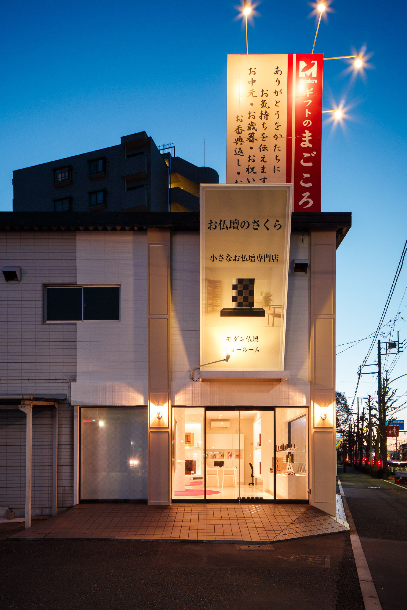 移り変わるお仏壇の需要性。その現代のお仏壇のショールーム。 今まで、これからと、「仏具」のイメージを抱かせない、そんなオーナー様の想いを落し込んだリノベーション。元は倉庫として使用していた場所を現代仏壇のショールームへ。商材は木工クラフトのクリエイターなどが製作するものが殆ど。アート作品として捉え、それらを飾るスペースは美術館、ギャラリーをイメージしながらもスペース自体にも高級感溢れ、清楚で落ち着いた印象を求められた。モールディング・輸入壁紙・ミラーなど色味を統一しながら各所に配置。床材はホワイトマーブルの大判タイルにホワイト目地を使い細部に至るところまで白を使い、混じり気を排除し、清楚感を。そんな中に鮮やかなパープルを入れることで清楚感の中にも高貴な印象を与えてくれることを意図している。