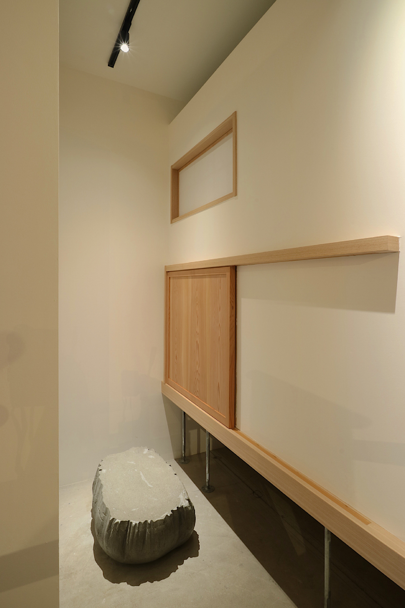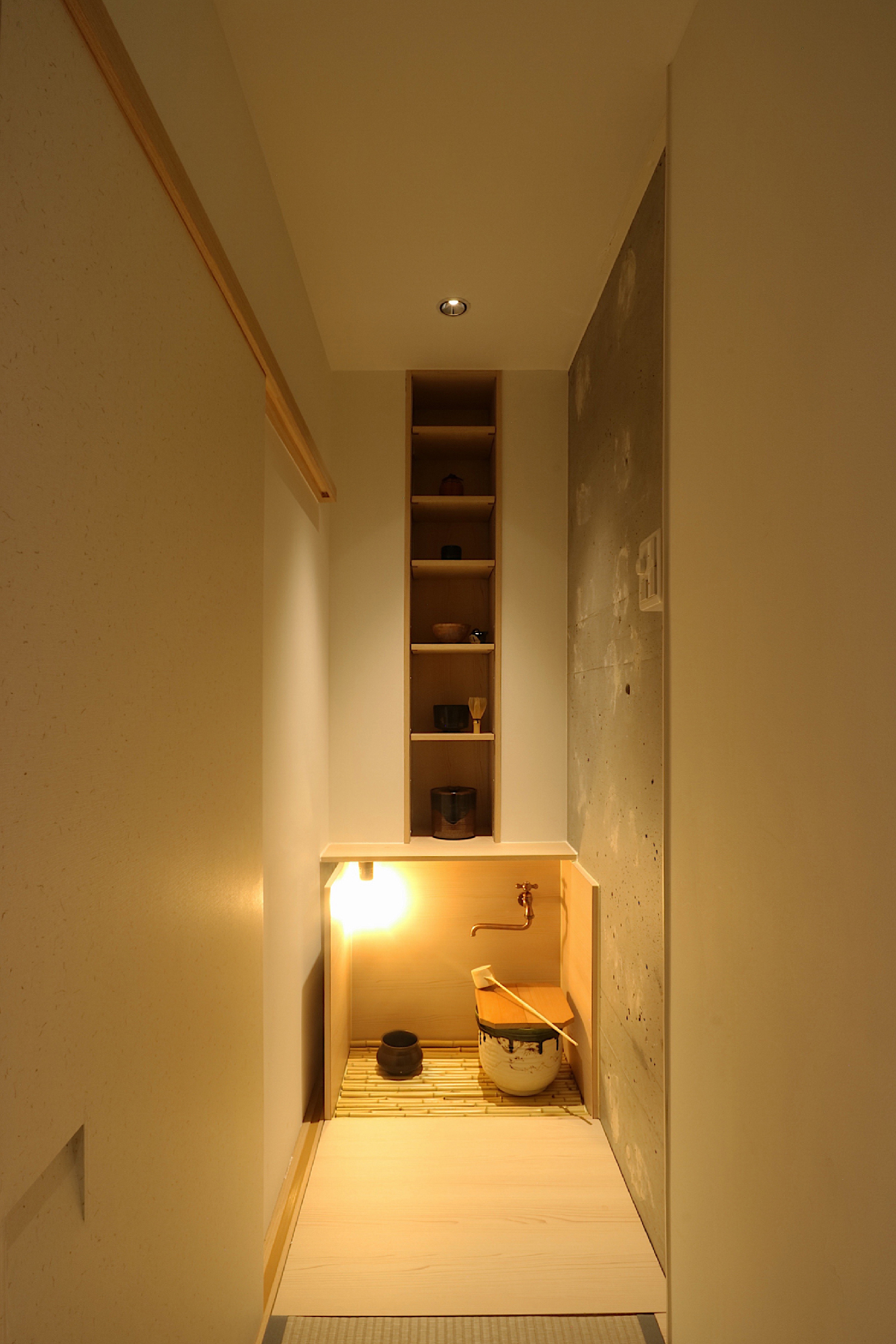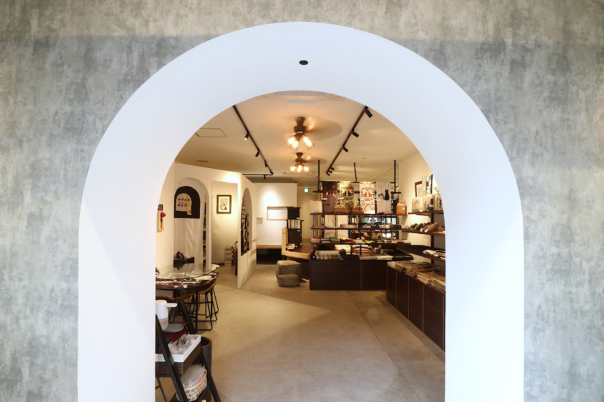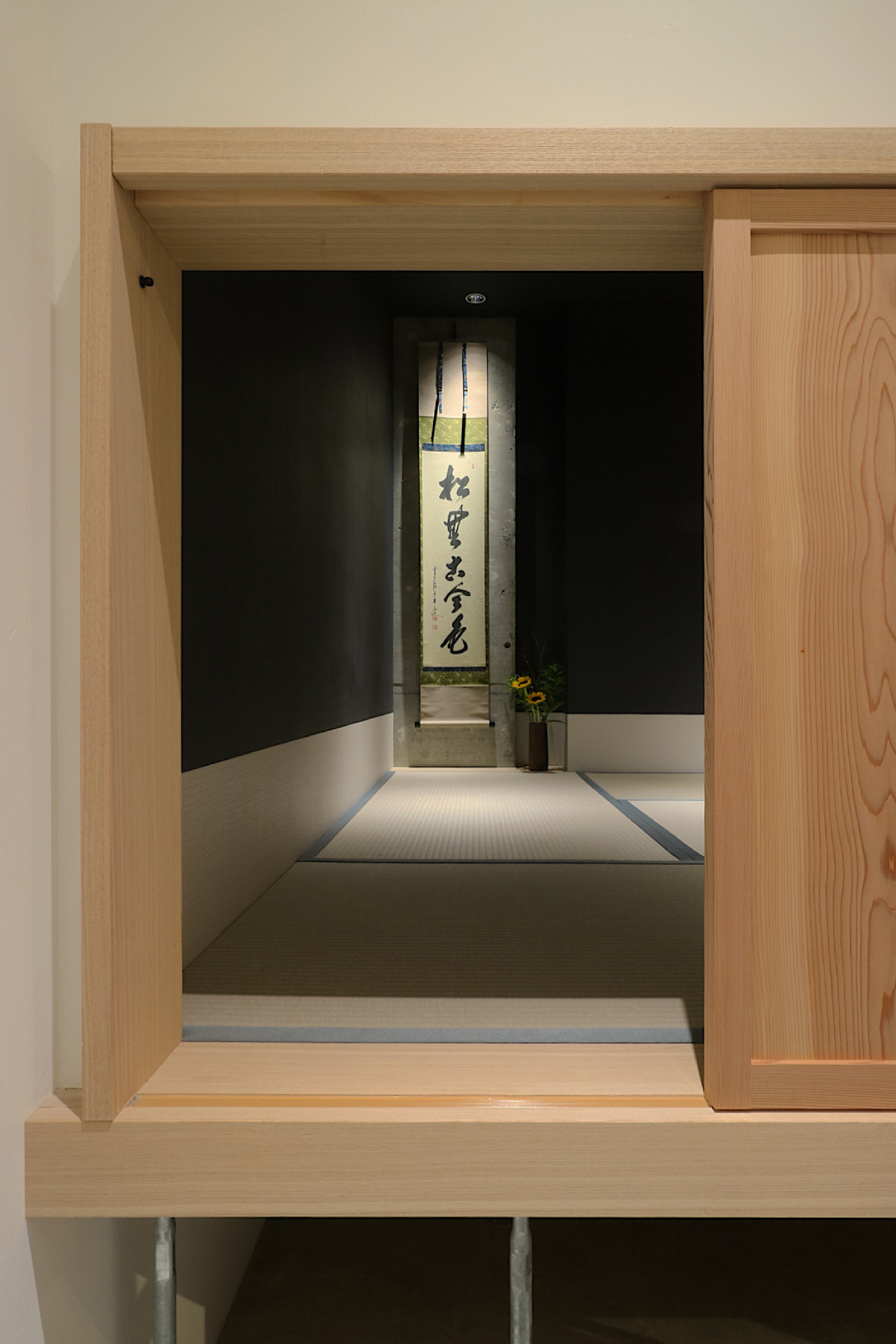 この物件に決まった時、施主様みずからがエクセルを活用して平面プランをご持参されていました。そこには呉服販売スペースの他にステージがあったり、茶室があったりと、、、。それはお打ち合わせを重ねて行くごとに繋がって行きました。ステージに関しては「歌舞伎・能・狂言」の役者さんとしてもご活躍されている施主様がイベントを出来るようにという事と着付けする際のスペースという役割がある。そしてその横に通路分を残してバックヤードを設け、茶室への入口が店舗入り口からは敢えて隠れるように茶室を奥側にレイアウトしている。よく考えられているなぁ、、と感心した。茶室は何故?というと奥様が茶道をしている事、着物を購入していただいたお客様が着用を楽しむ機会を演出したいとの事から。アーチ形状をデザインのポイントにしたのは施主様が通っていた服飾学校の建築へオマージュから。施主様のプラン・想いをサポートさせていただきました。
