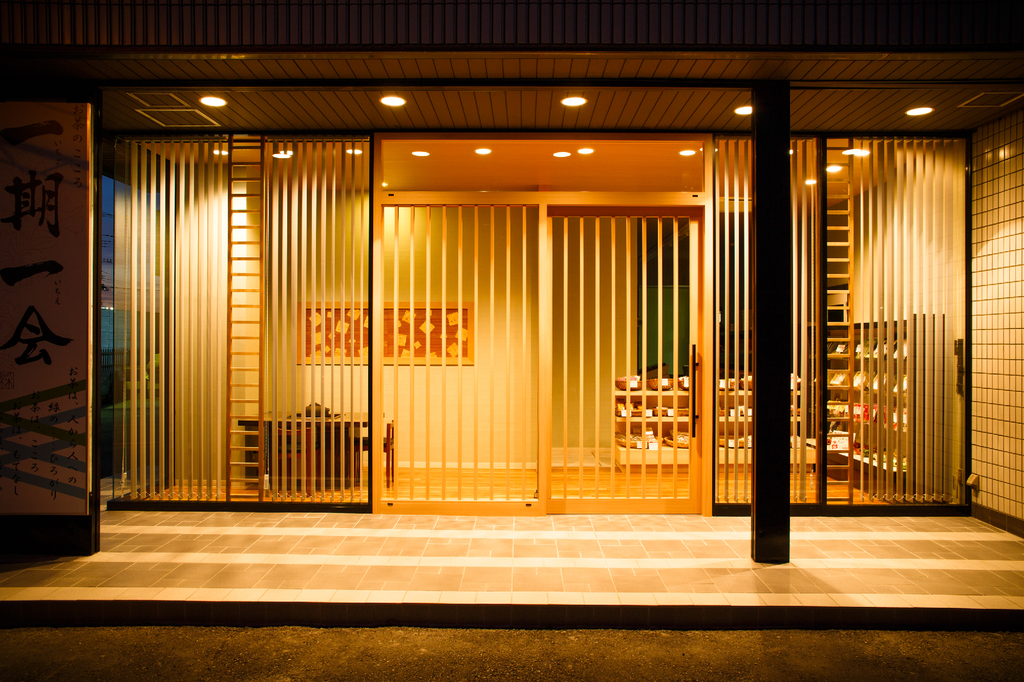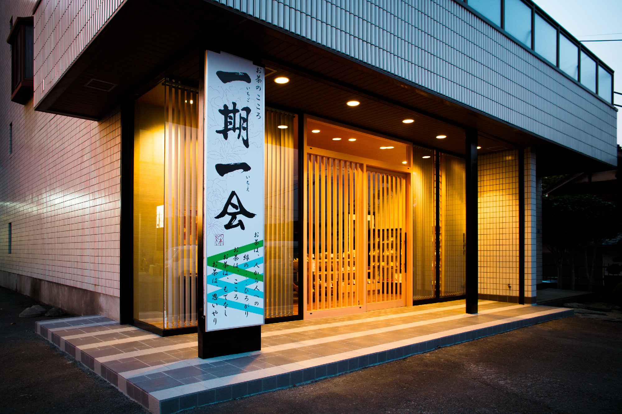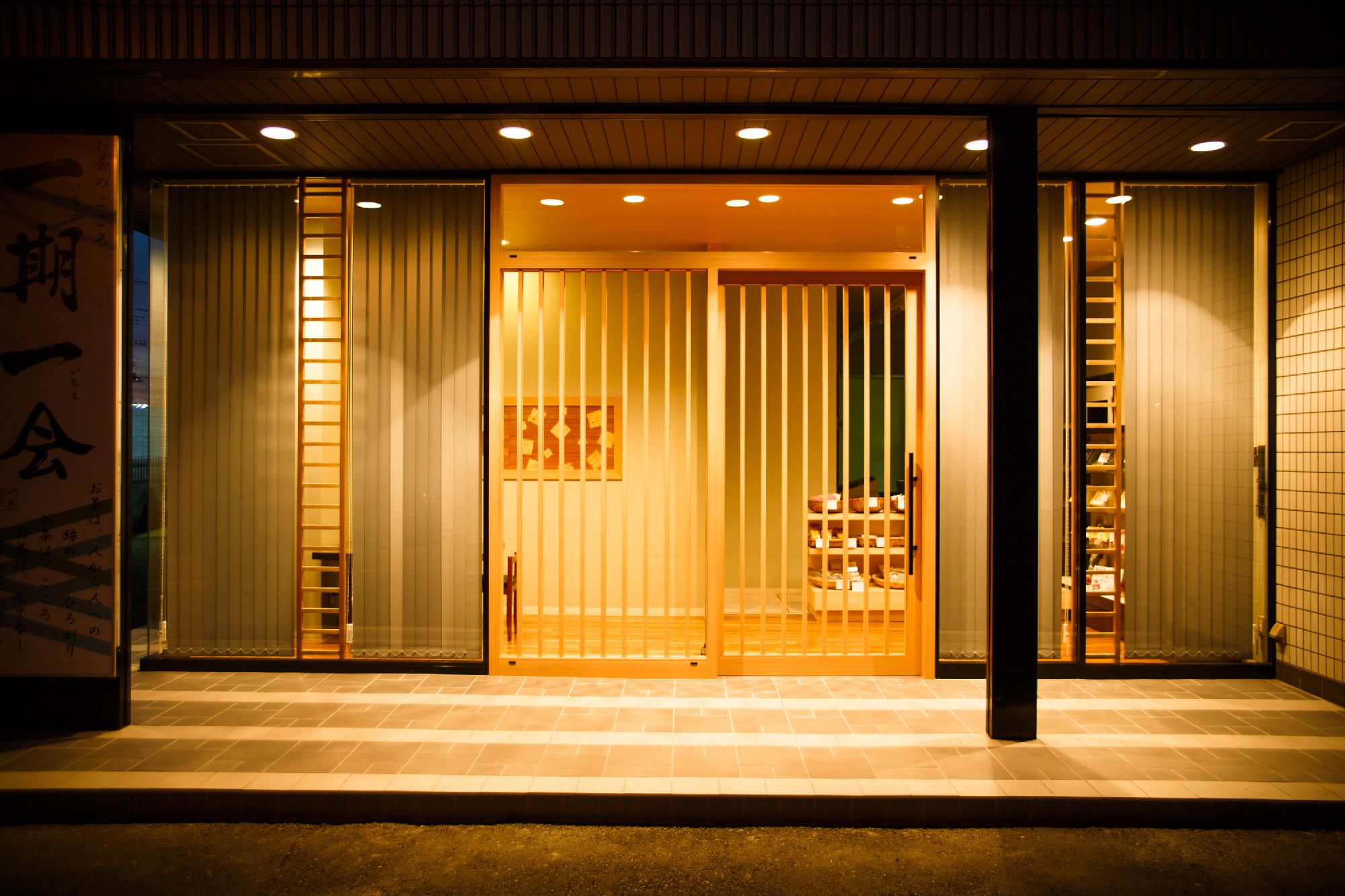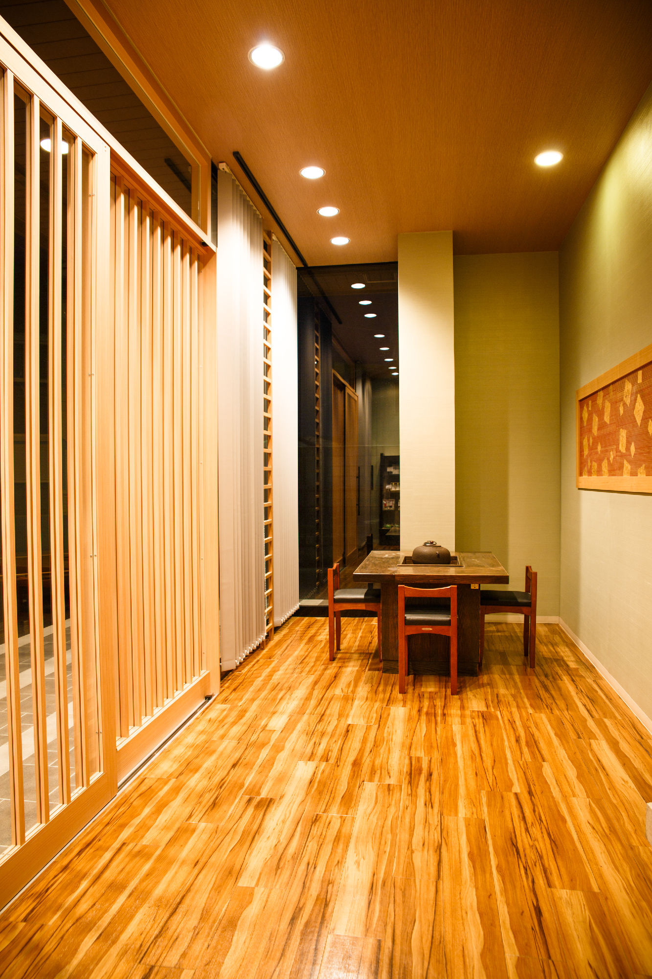 老舗であるからこその格式と現代性を持たせることに注意した。シンプルな縦のラインで格子をイメージ付けているのは、バーチカルブラインド。日射を遮ることと日射がない時間帯ではルーバーを回転させることで格子が出現する。格子扉は高さ2m30近くあるサイズで実際に目の前に立つと、その大きさに老舗である格式というか威厳というか何かを感じることができる。一見、シンプルな中にサイズ感や機能性で格式と現代性を表現した。爽やかなグリーンの壁紙にアクセントでタモ材の額装に和紙貼りと入り口のパターン貼りのタイルが、デザイン性を演出しシンプルな、だけではない印象を与えてくれる。
