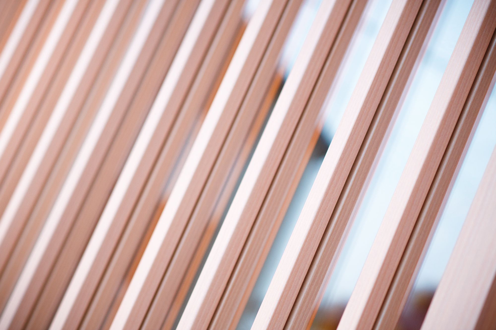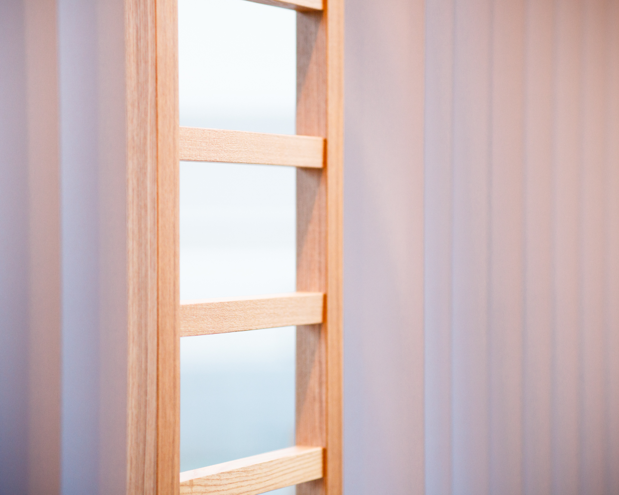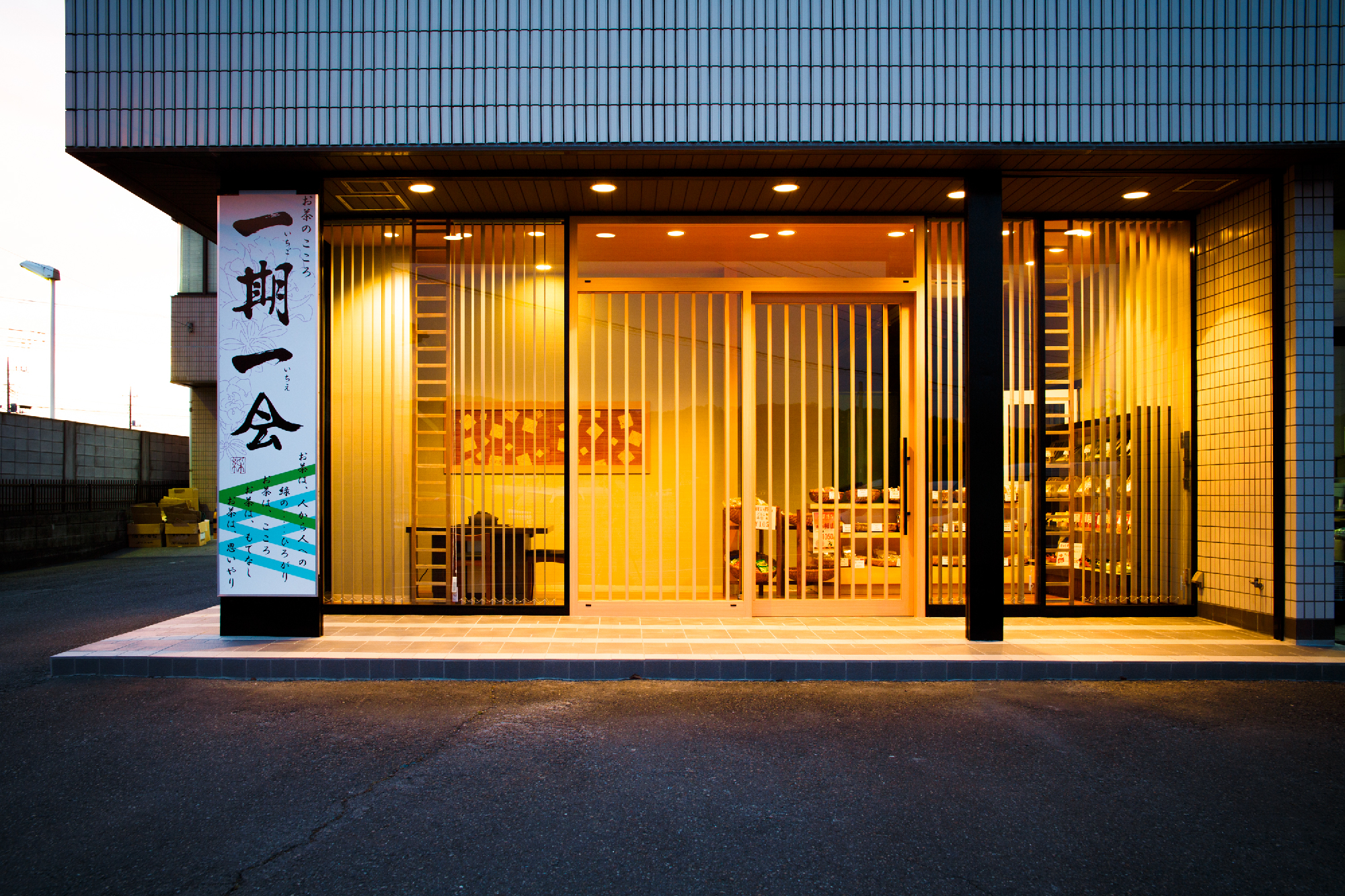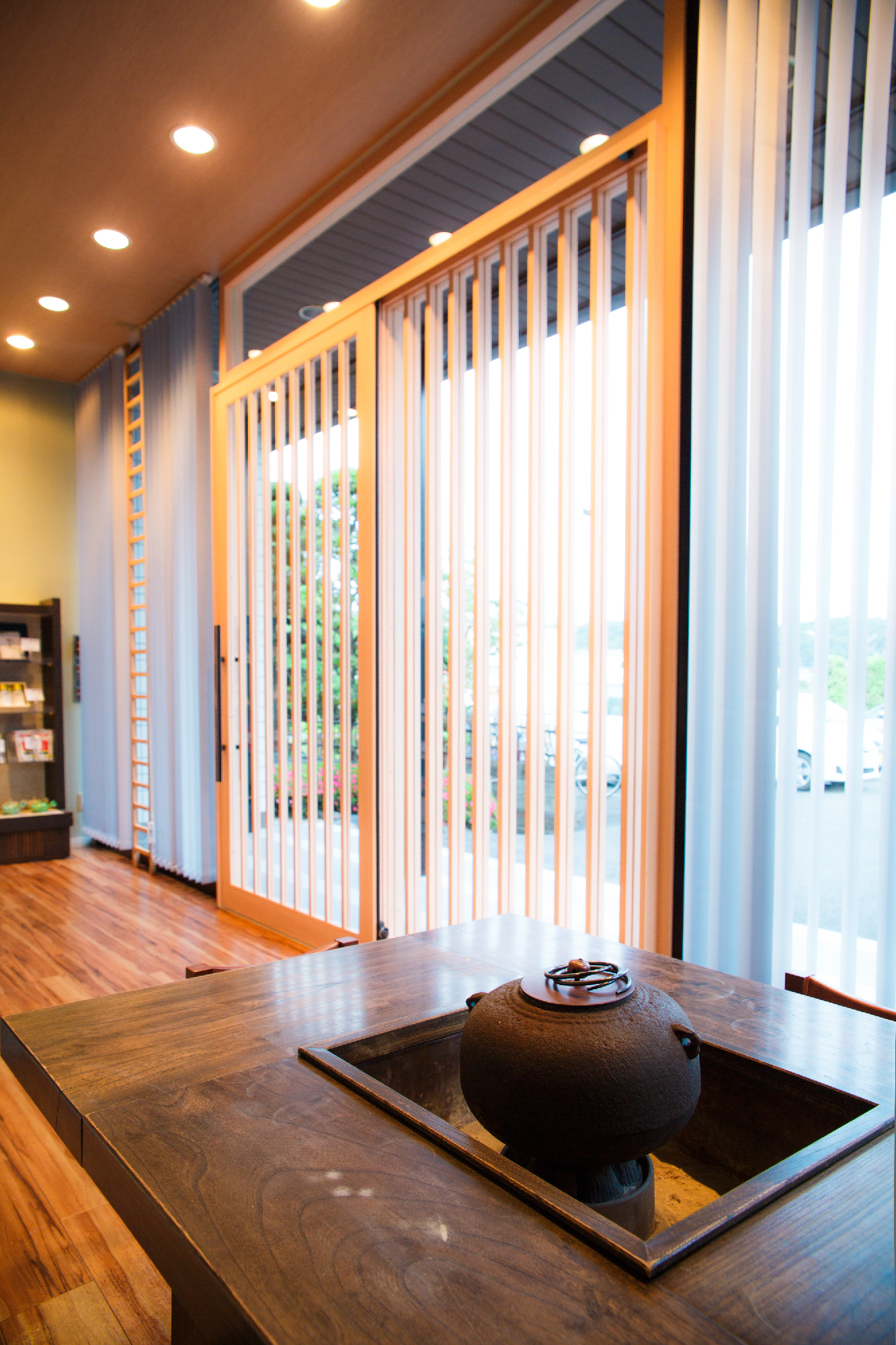 老舗であるからこその格式と現代性を持たせることに注意した。シンプルな縦のラインで格子をイメージ付けているのは、バーチカルブラインド。日射を遮ることと日射がない時間帯ではルーバーを回転させることで格子が出現する。格子扉は高さ2m30近くあるサイズで実際に目の前に立つと、その大きさに老舗である格式というか威厳というか何かを感じることができる。一見、シンプルな中にサイズ感や機能性で格式と現代性を表現した。爽やかなグリーンの壁紙にアクセントでタモ材の額装に和紙貼りと入り口のパターン貼りのタイルが、デザイン性を演出しシンプルな、だけではない印象を与えてくれる。