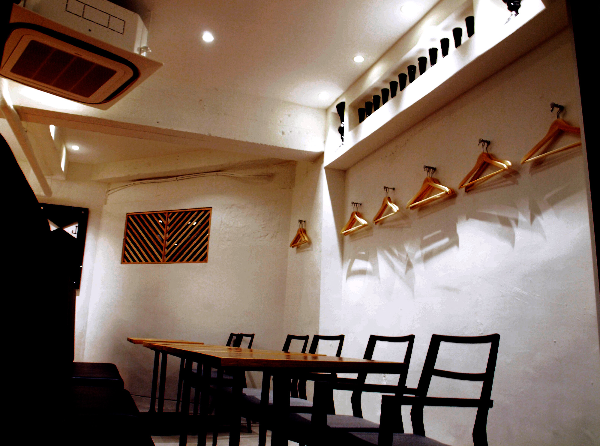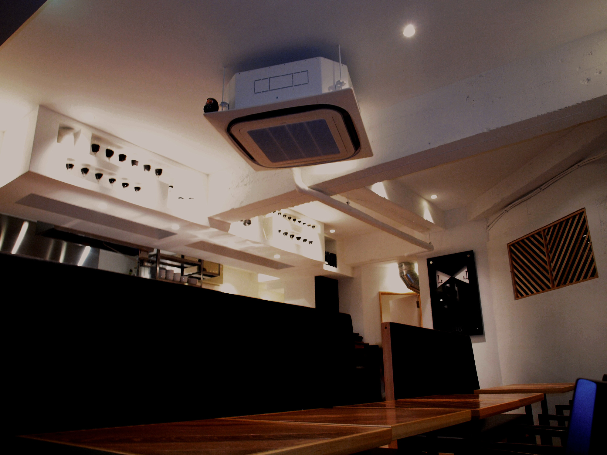 五反田から住宅街へ抜ける一歩手前の立地にオープンした串焼きとワインが堪能できるお店。元は事務所だった物件だったため排気ダクト、排水取り出し位置、給水増量や事務所感満載のファサード部と大掛かりなリニューアルが必要となった。ビルオーナー様と協議を重ね、ダクトを屋上まで、給水増量をオーナー様側で、排水取り出しの為に床の削り(少しだけ)、ファサードサッシの全面取り替え、動力電気の直引きなどなどなど、、。となるとコスト面での調整がかなり重くなり、これまたかなりの部分でDIY作戦が発令された。ほぼ毎日のうような感じで現場へ出向き、親方の手伝いをしながら、各業者さんの手伝いもしながら、自分たちの手で製作するものも増えながら何とか創り上げる事ができたお店です。シンプルなデザインですが、静かな通りに面し、開放感あふれる面持ちと赤の三角が二つの印象的なロゴが映える暖簾が良い感じに見えるお店が出来上がりました。