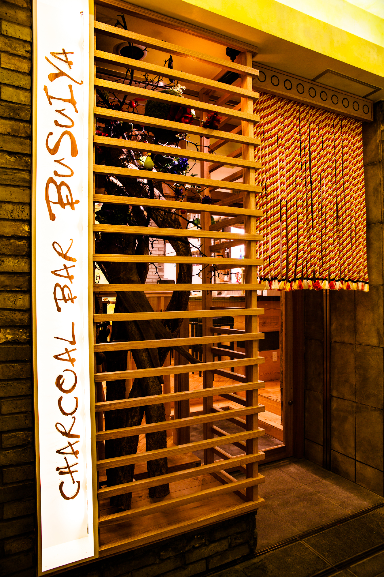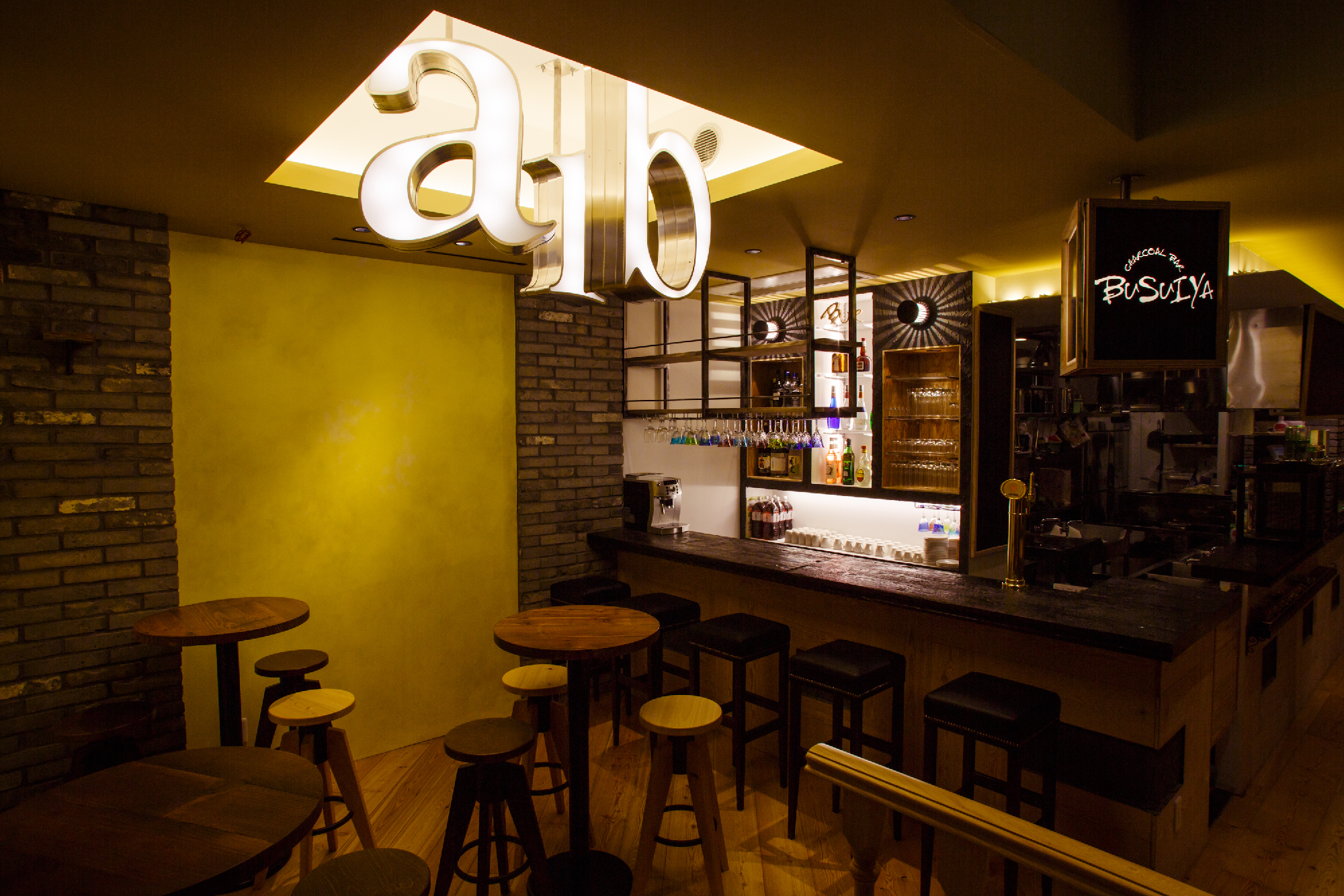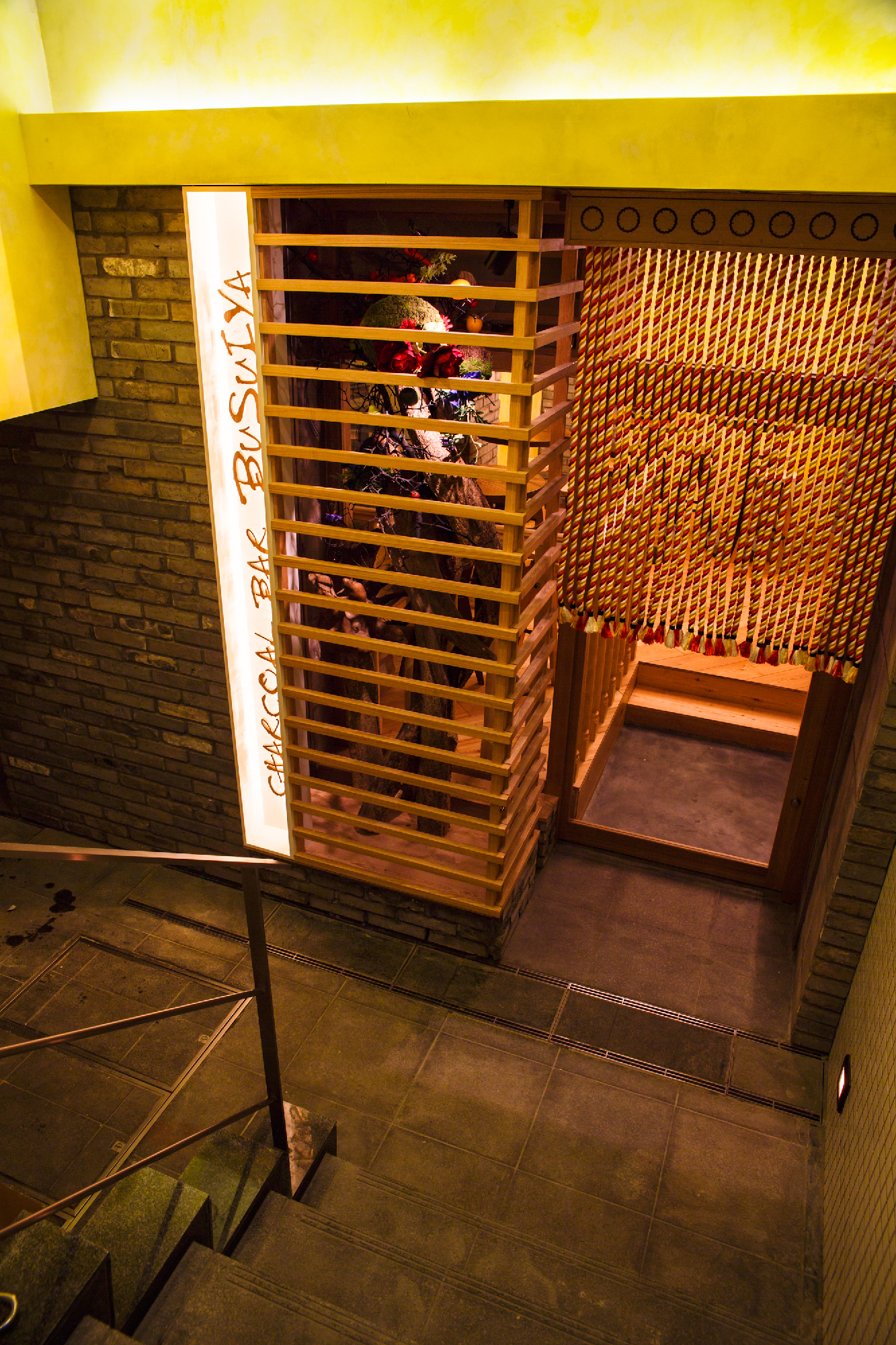 炭火の串焼き、小皿料理、豊富なワインをお手軽な値段で提供する「charcoal bar busuiya」。 丁寧な下処理と絶妙なアレンジで多国籍な味をかもしだすいろいろな料理。そんな料理を提供する空間も多国籍でいて非日常なイメージにと。空間構成をバーエリア、ダイニングエリア、プライベートエリアと3つに分け、それぞれでデザインコンセプトを変えている。ビルの入口からは創造出来ない空間が地下に広がっているギャップを演出した。