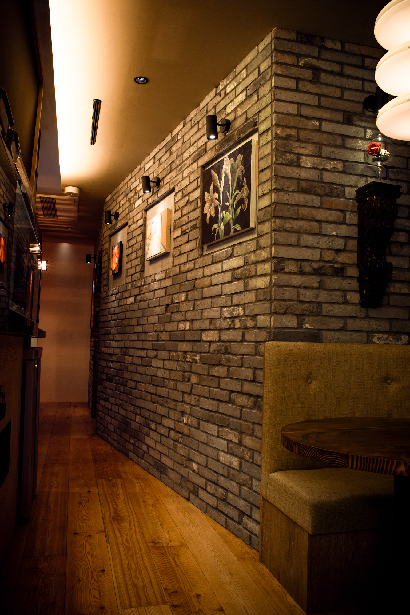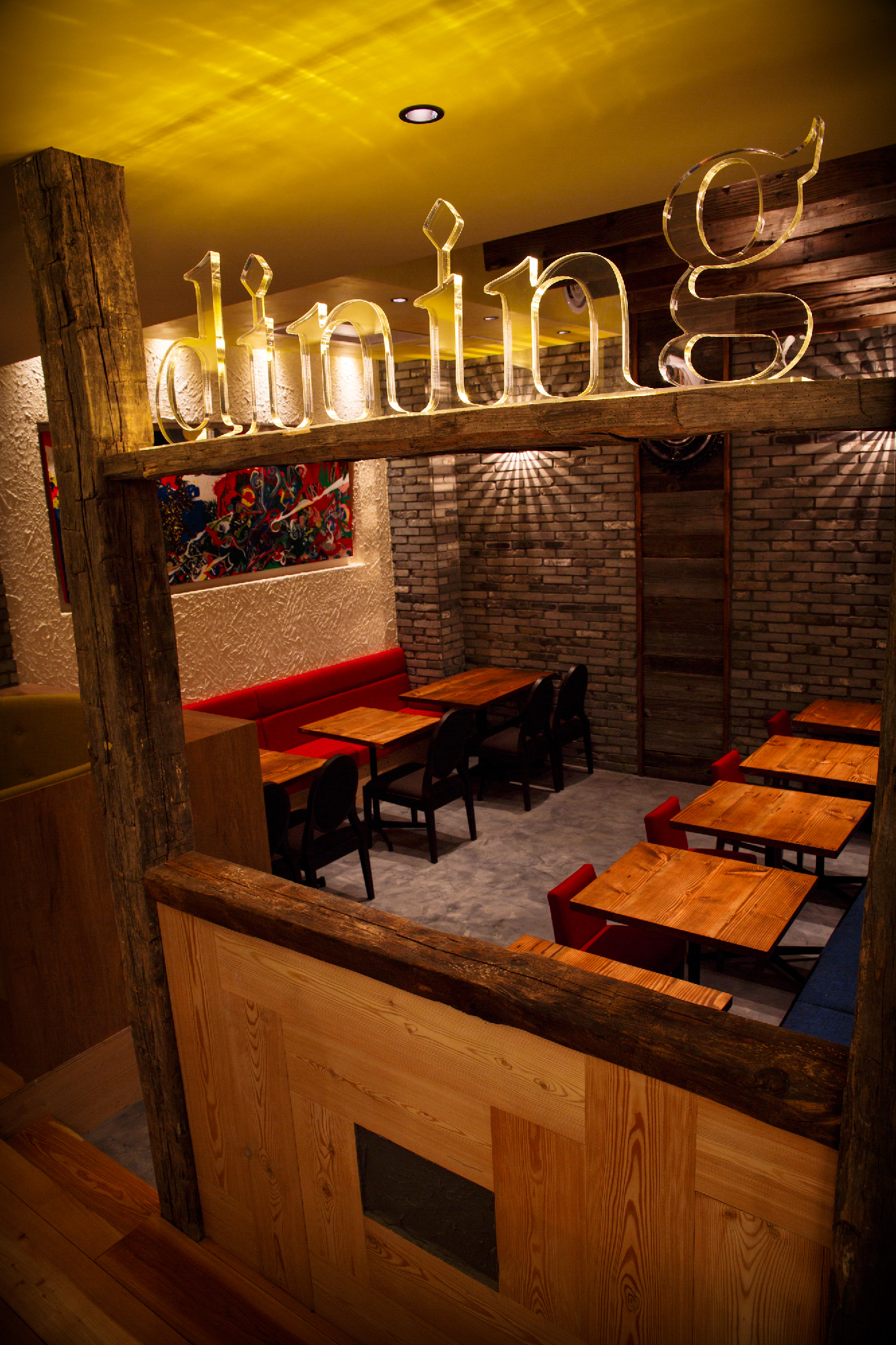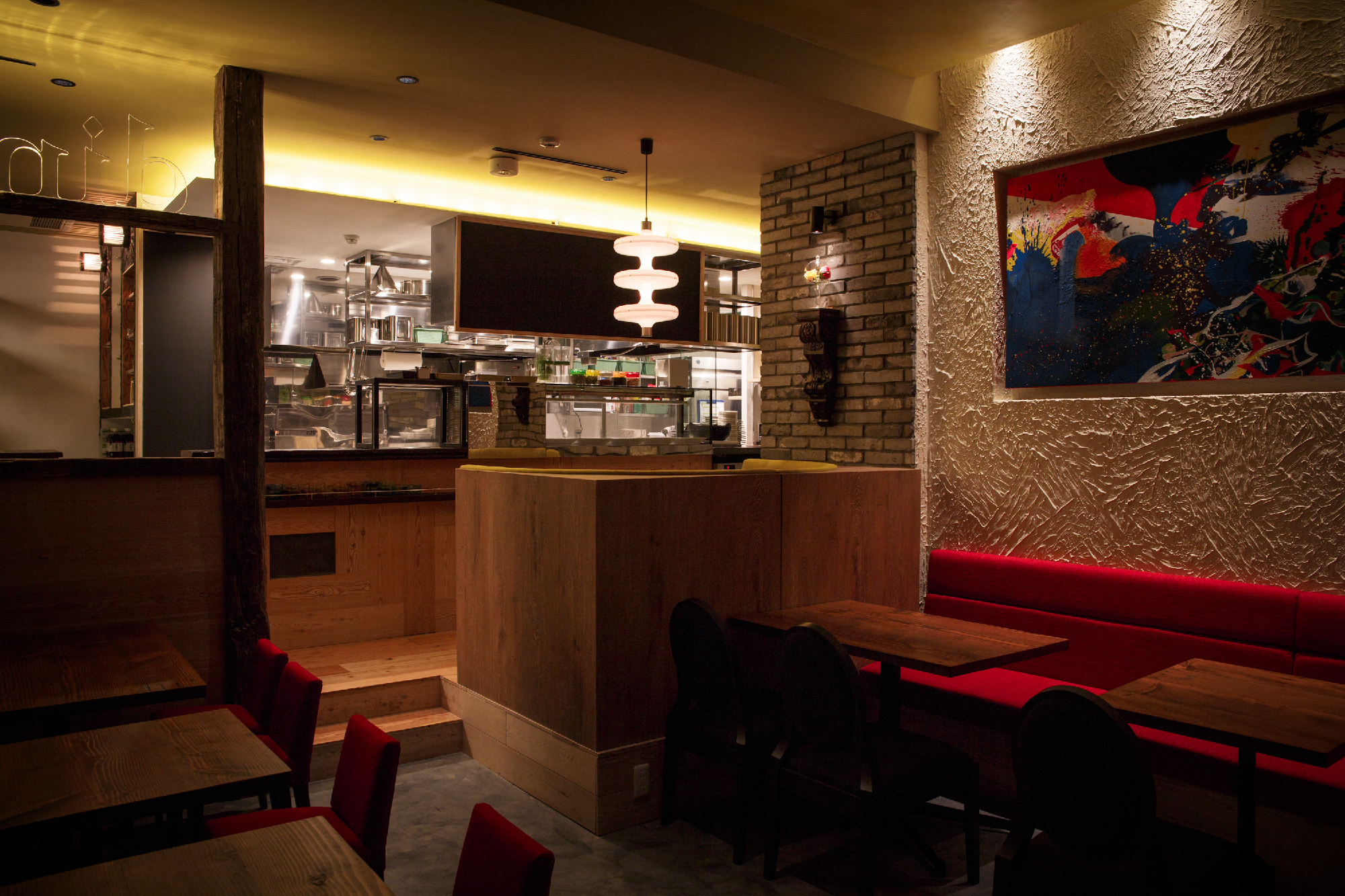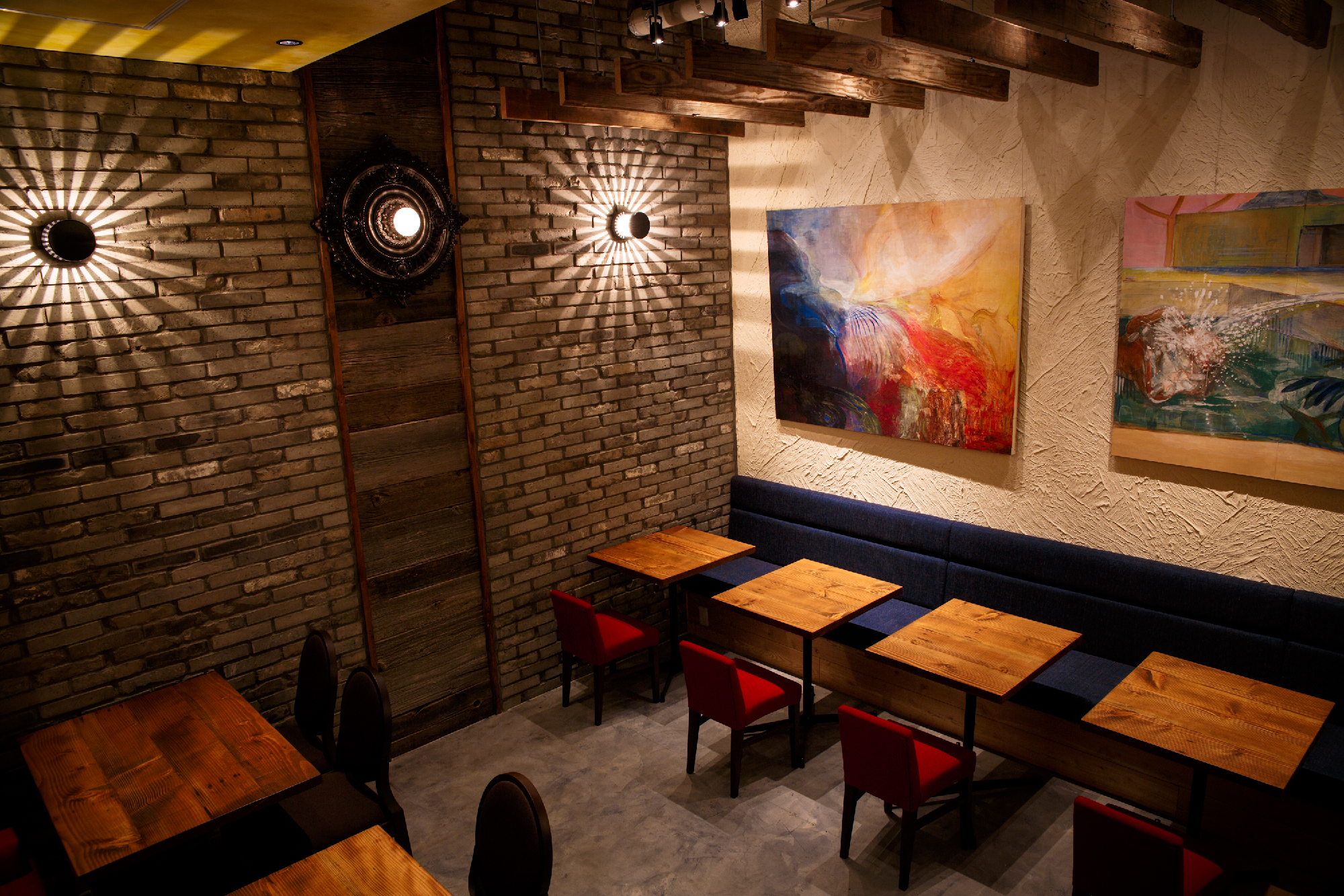 炭火の串焼き、小皿料理、豊富なワインをお手軽な値段で提供する「charcoal bar busuiya」。 丁寧な下処理と絶妙なアレンジで多国籍な味をかもしだすいろいろな料理。そんな料理を提供する空間も多国籍でいて非日常なイメージにと。空間構成をバーエリア、ダイニングエリア、プライベートエリアと3つに分け、それぞれでデザインコンセプトを変えている。ビルの入口からは創造出来ない空間が地下に広がっているギャップを演出した。