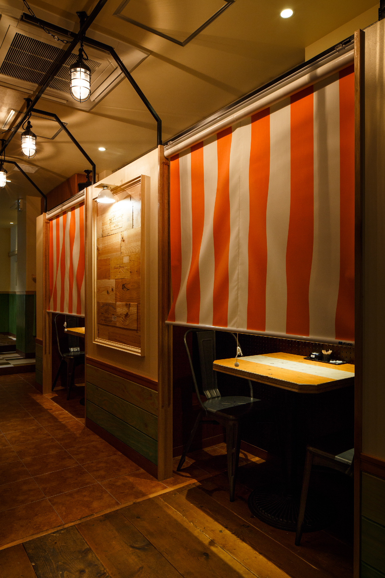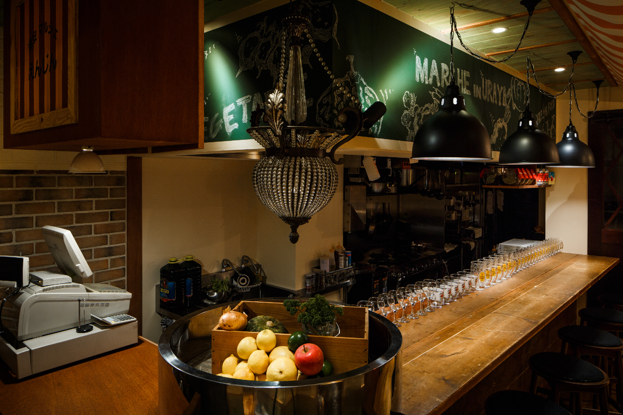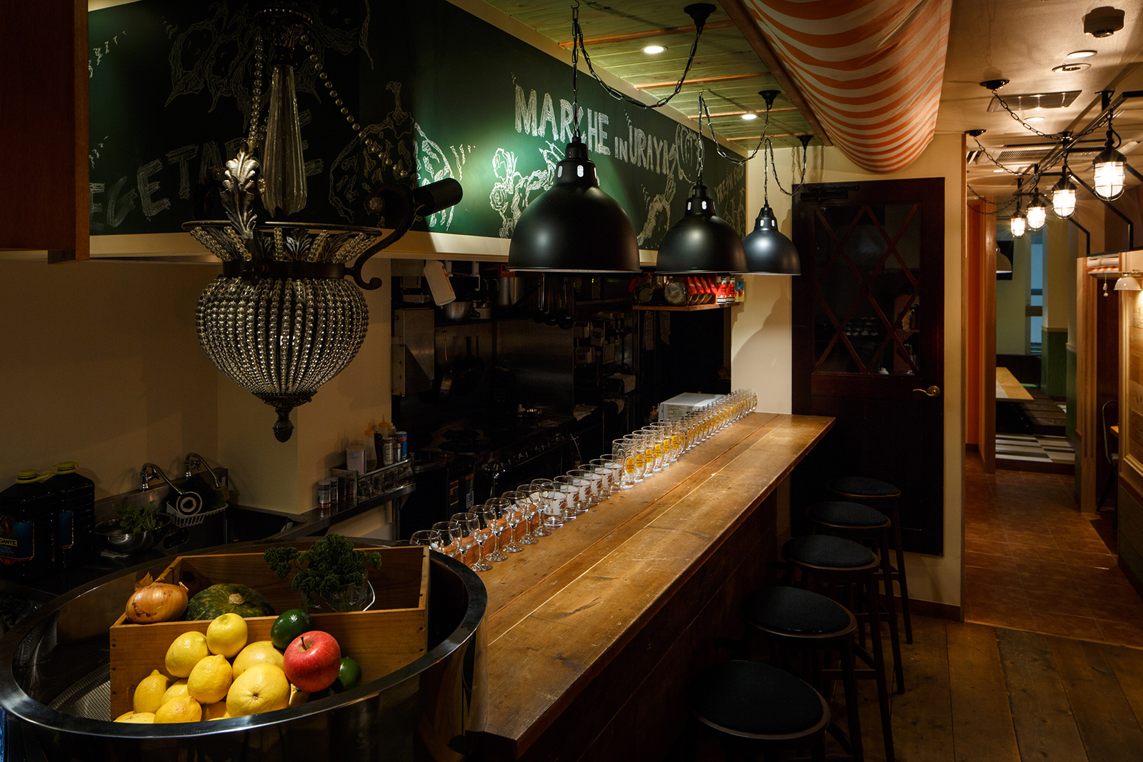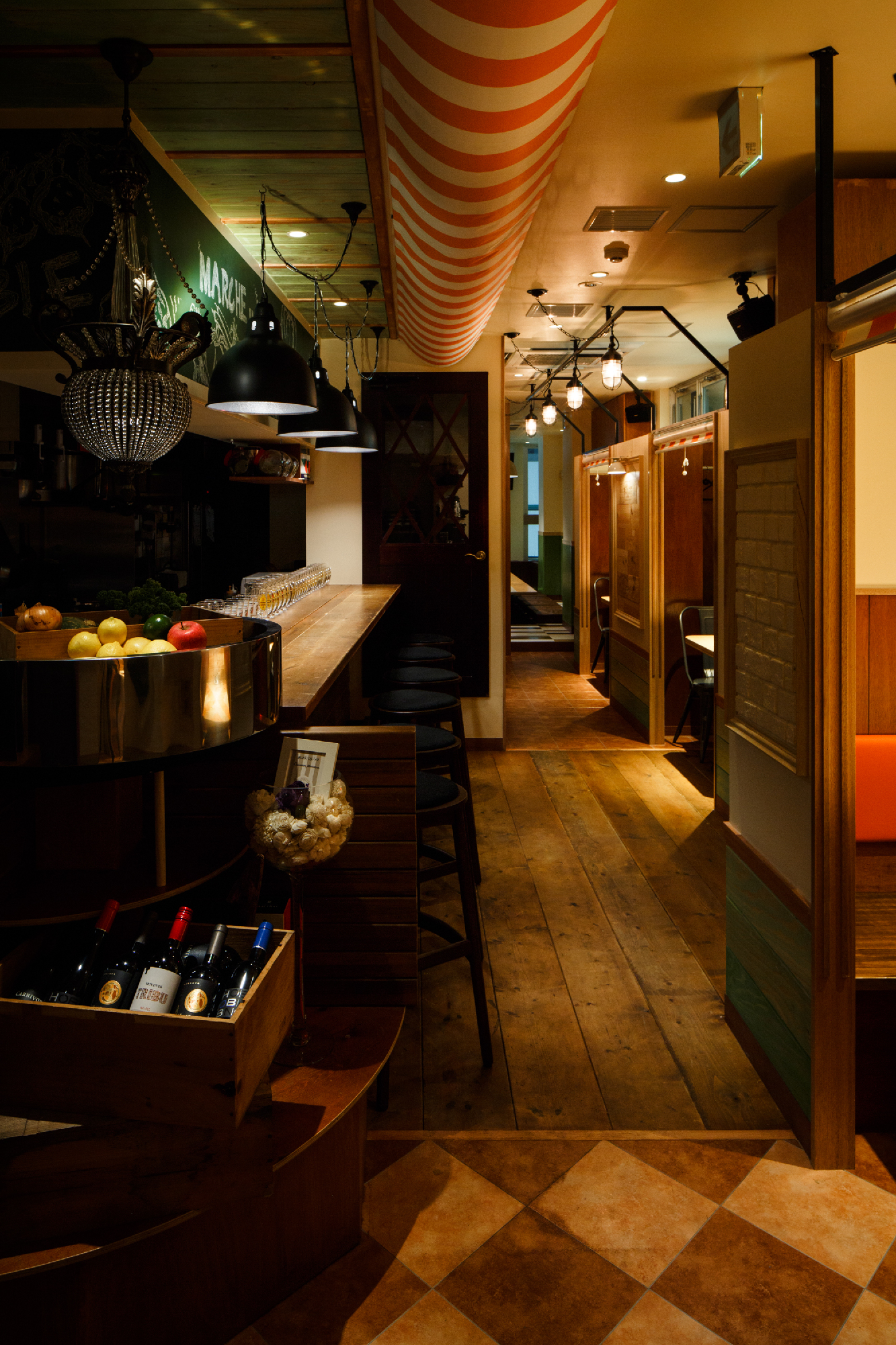 新鮮な食材を契約農家や漁師さんから直送するスタイルをもつお店。そんなことからオーナーは、マルシェ(市場)によって新鮮な食材を買って、そこでそのまま食すイメージでと。マルシェの雰囲気創りとして屋台売りのテント、使い古した木材 (神田にあった店舗からの移転ということで、床材やカウンター天板など元のお店の木材を引っ越ししている。4m近い木材をオーナー様含め、皆んなで夜な夜な非常階段で4階まで何十往復もして搬入した。それらを薄く研磨し、風合いを残しながらこちらの店舗でも使用している。)、構造材、鉄を用いて庶民的な素材構成とした。オレンジやグリーンと言った食材のもつカラーリングを直接使用する事で賑わいとしずる感を表現。細長い物件形状に席数確保に苦労しましたが、オーナー様と何回もプランを練り直し最良のプランでの店舗となったと思います。(平面Pの数は何十にも。)
