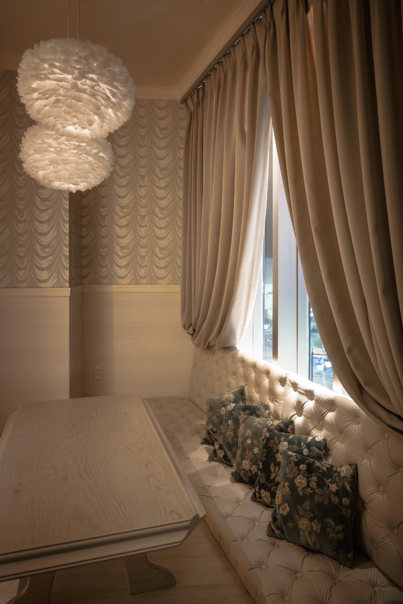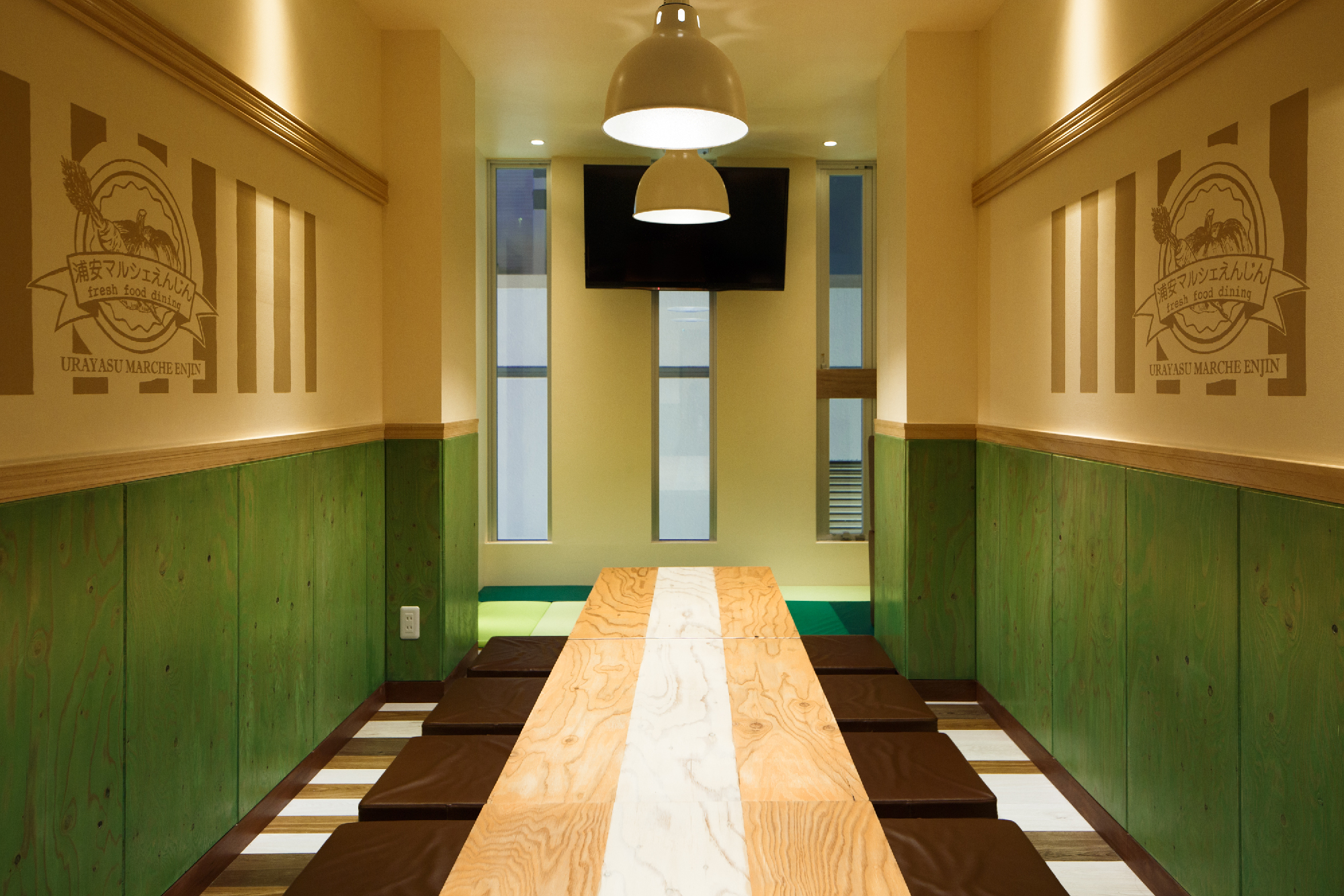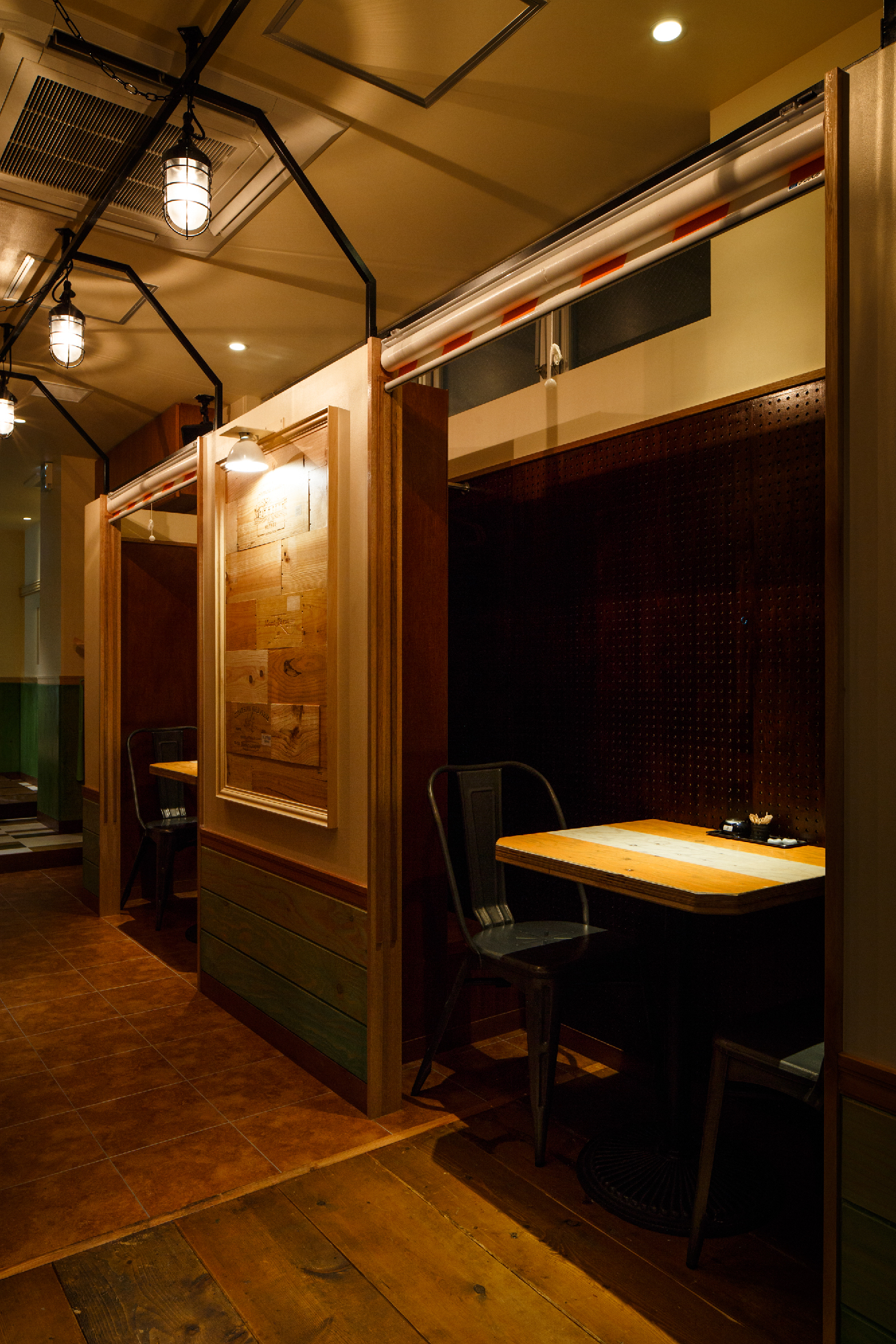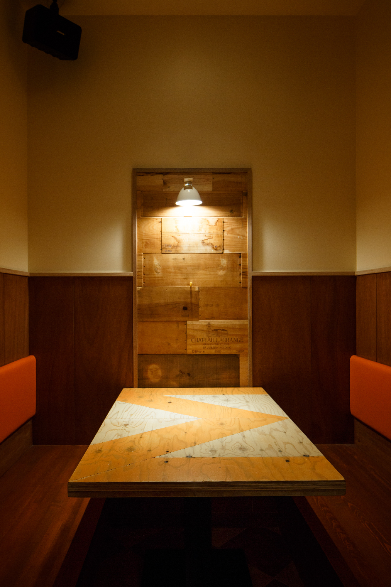 新鮮な食材を契約農家や漁師さんから直送するスタイルをもつお店。そんなことからオーナーは、マルシェ(市場)によって新鮮な食材を買って、そこでそのまま食すイメージでと。マルシェの雰囲気創りとして屋台売りのテント、使い古した木材 (神田にあった店舗からの移転ということで、床材やカウンター天板など元のお店の木材を引っ越ししている。4m近い木材をオーナー様含め、皆んなで夜な夜な非常階段で4階まで何十往復もして搬入した。それらを薄く研磨し、風合いを残しながらこちらの店舗でも使用している。)、構造材、鉄を用いて庶民的な素材構成とした。オレンジやグリーンと言った食材のもつカラーリングを直接使用する事で賑わいとしずる感を表現。細長い物件形状に席数確保に苦労しましたが、オーナー様と何回もプランを練り直し最良のプランでの店舗となったと思います。(平面Pの数は何十にも。)