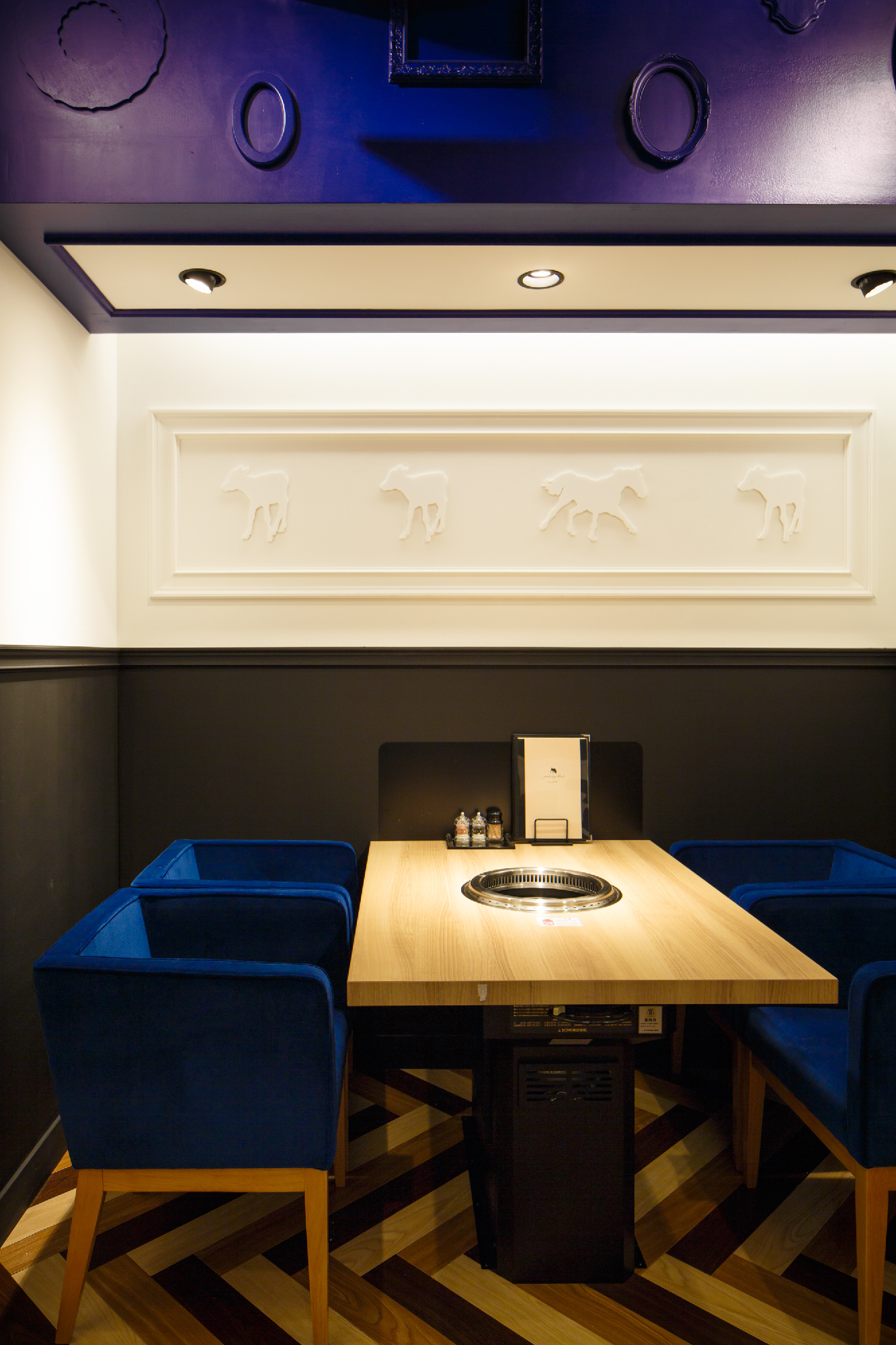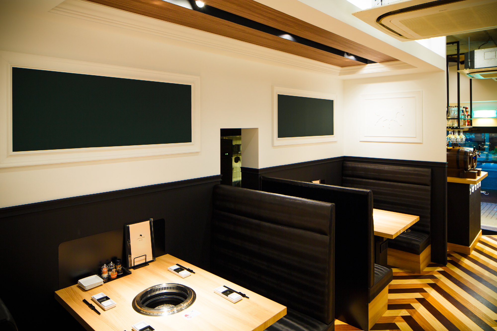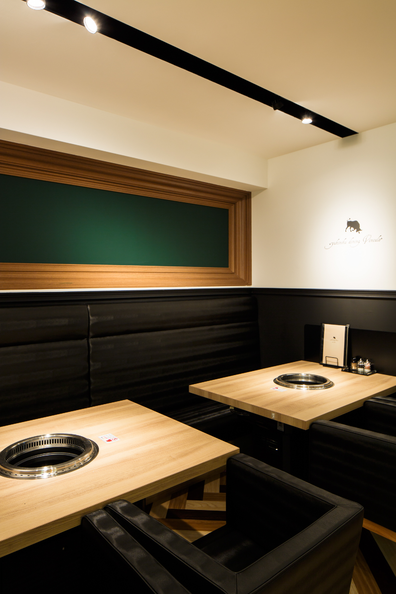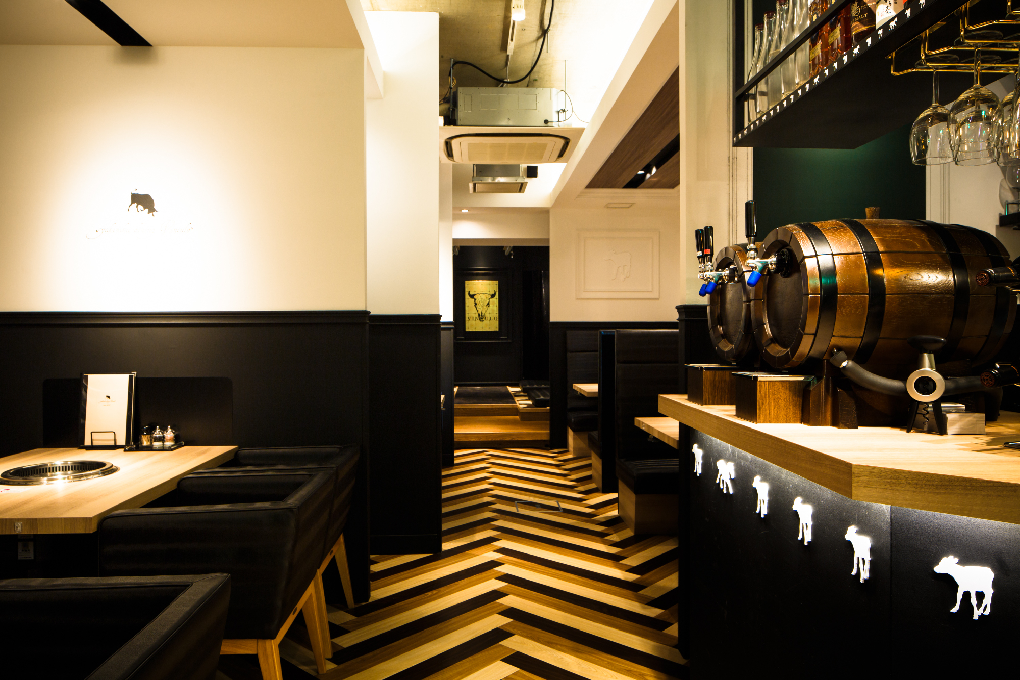 郊外の私鉄駅すぐ近くにカフェでもなくバーでもなく焼き肉店。ランクものの肉を郊外ならではの値段で食べてもらいたいというオーナーの願いがこもったお店。デザインは、カジュアルとアッパーとの間に位置し、焼肉店らしからぬイメージにと。木目、白、黒とシンプルな構成要素ながら、モールディングとアイキャッチな牛達により店内にいろいろな表情を持たせた。バーカウンターが入り口すぐのところにある為、工事中も「バーですか?ダイニングですか?」など聞かれる事も。お肉の他に樽生ワインをメインにしたこだわりのお酒も楽しめるお店という事を視覚的にもこっそりと演出している。