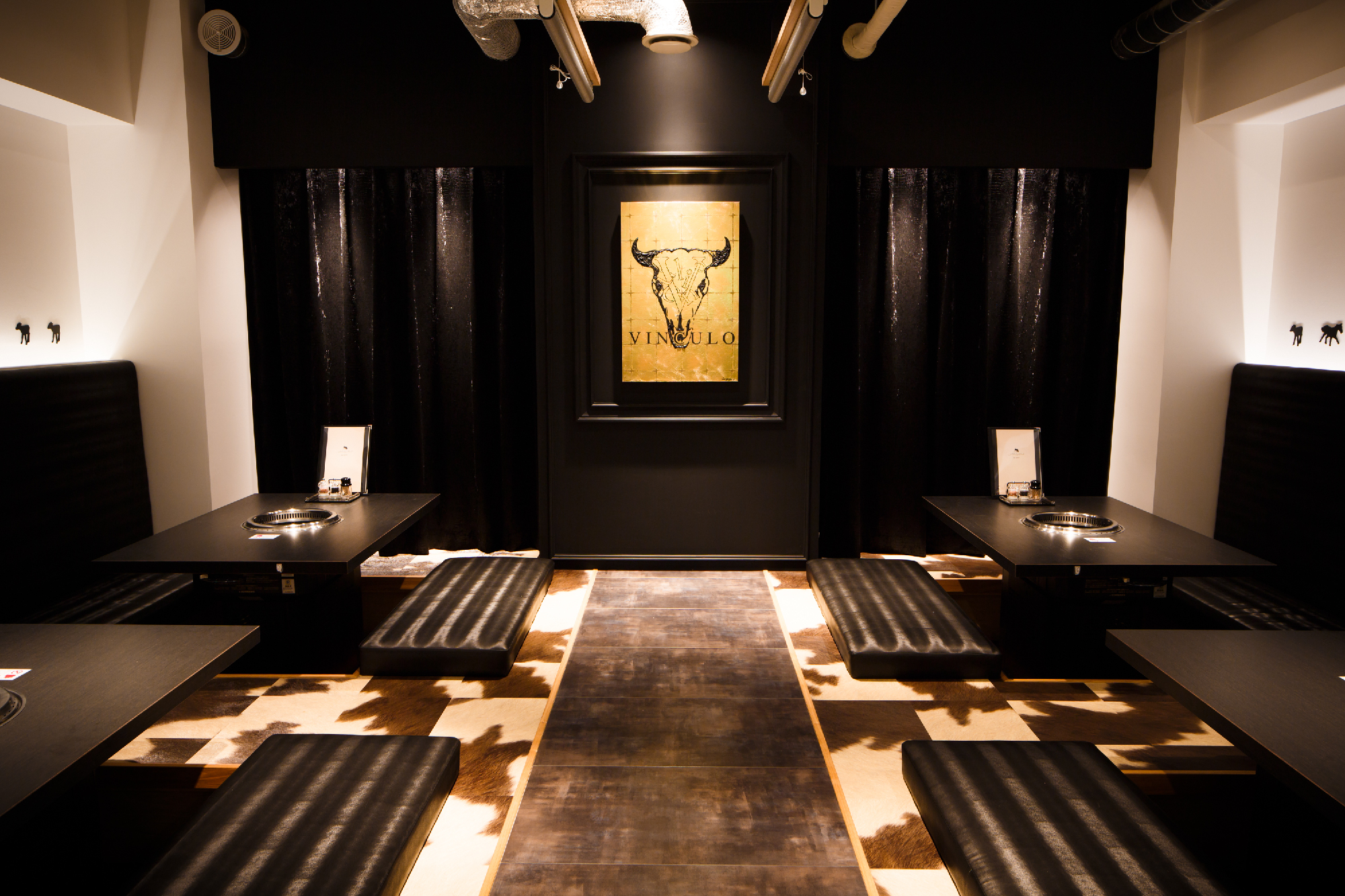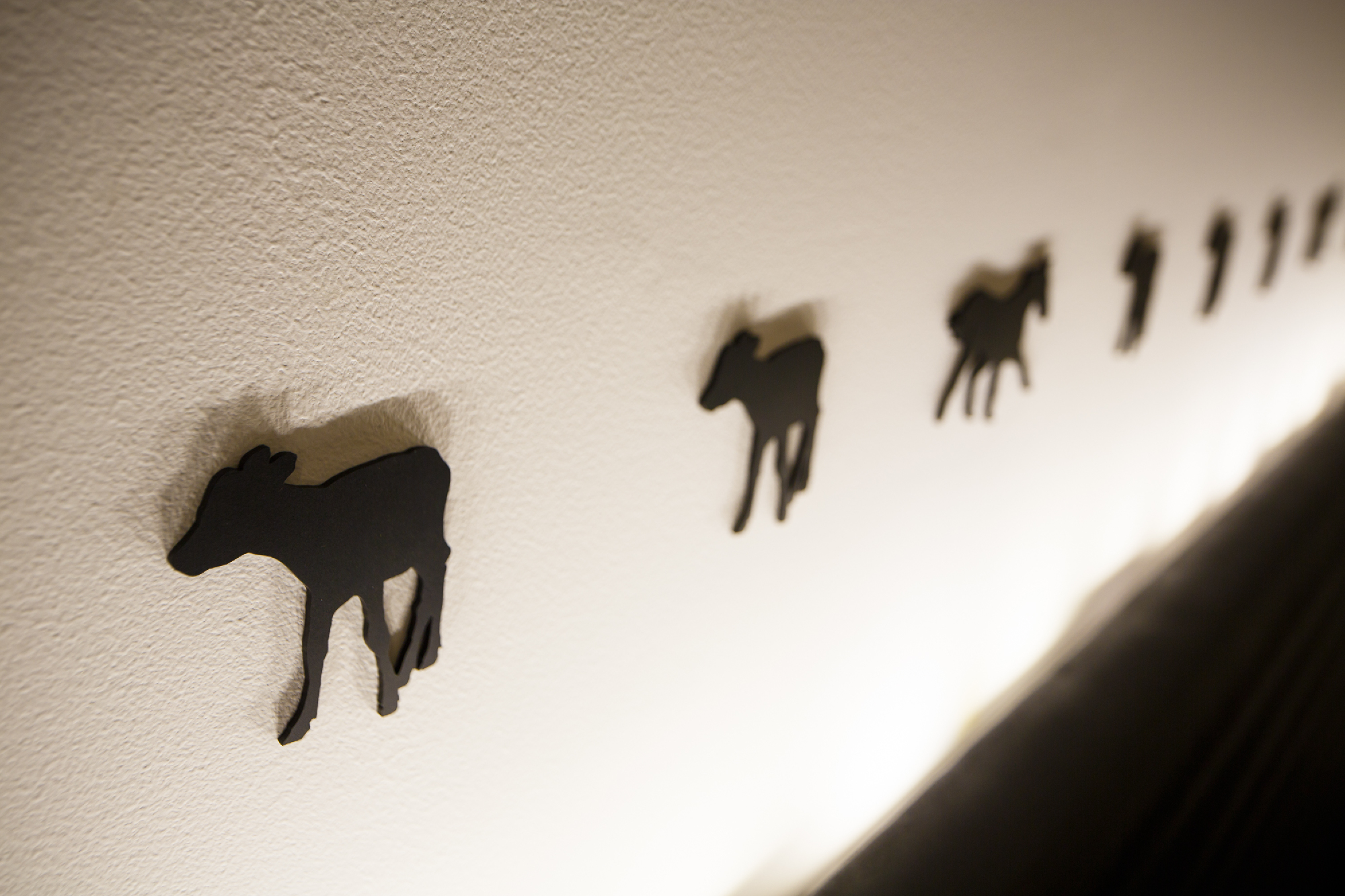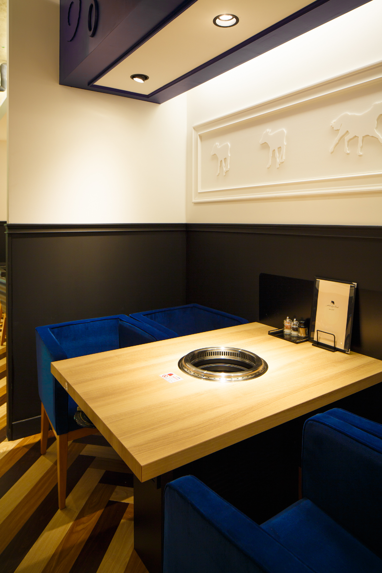 郊外の私鉄駅すぐ近くにカフェでもなくバーでもなく焼き肉店。ランクものの肉を郊外ならではの値段で食べてもらいたいというオーナーの願いがこもったお店。デザインは、カジュアルとアッパーとの間に位置し、焼肉店らしからぬイメージにと。木目、白、黒とシンプルな構成要素ながら、モールディングとアイキャッチな牛達により店内にいろいろな表情を持たせた。バーカウンターが入り口すぐのところにある為、工事中も「バーですか?ダイニングですか?」など聞かれる事も。お肉の他に樽生ワインをメインにしたこだわりのお酒も楽しめるお店という事を視覚的にもこっそりと演出している。