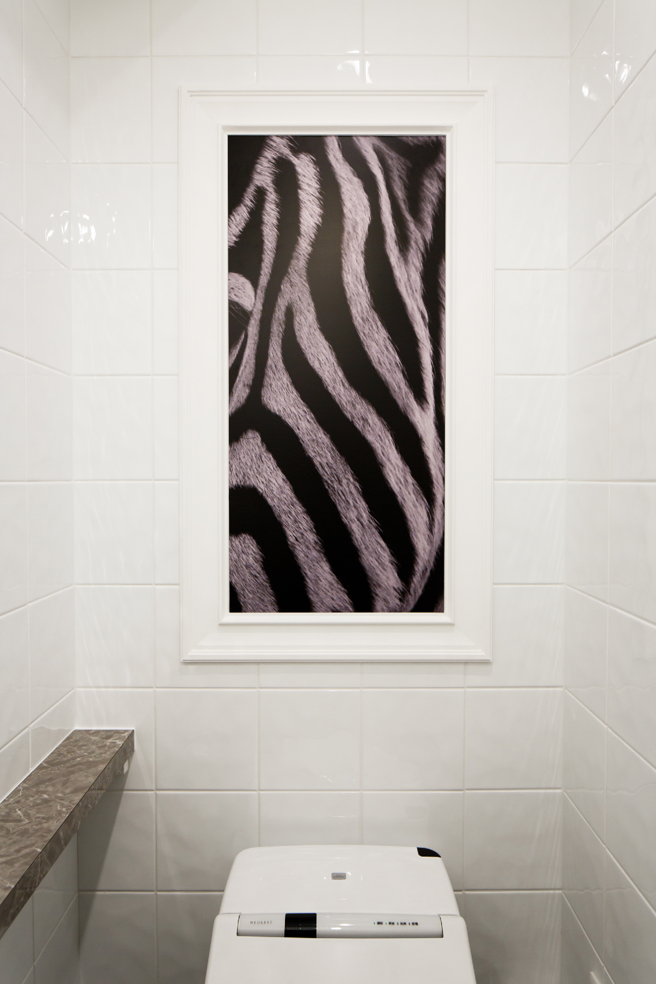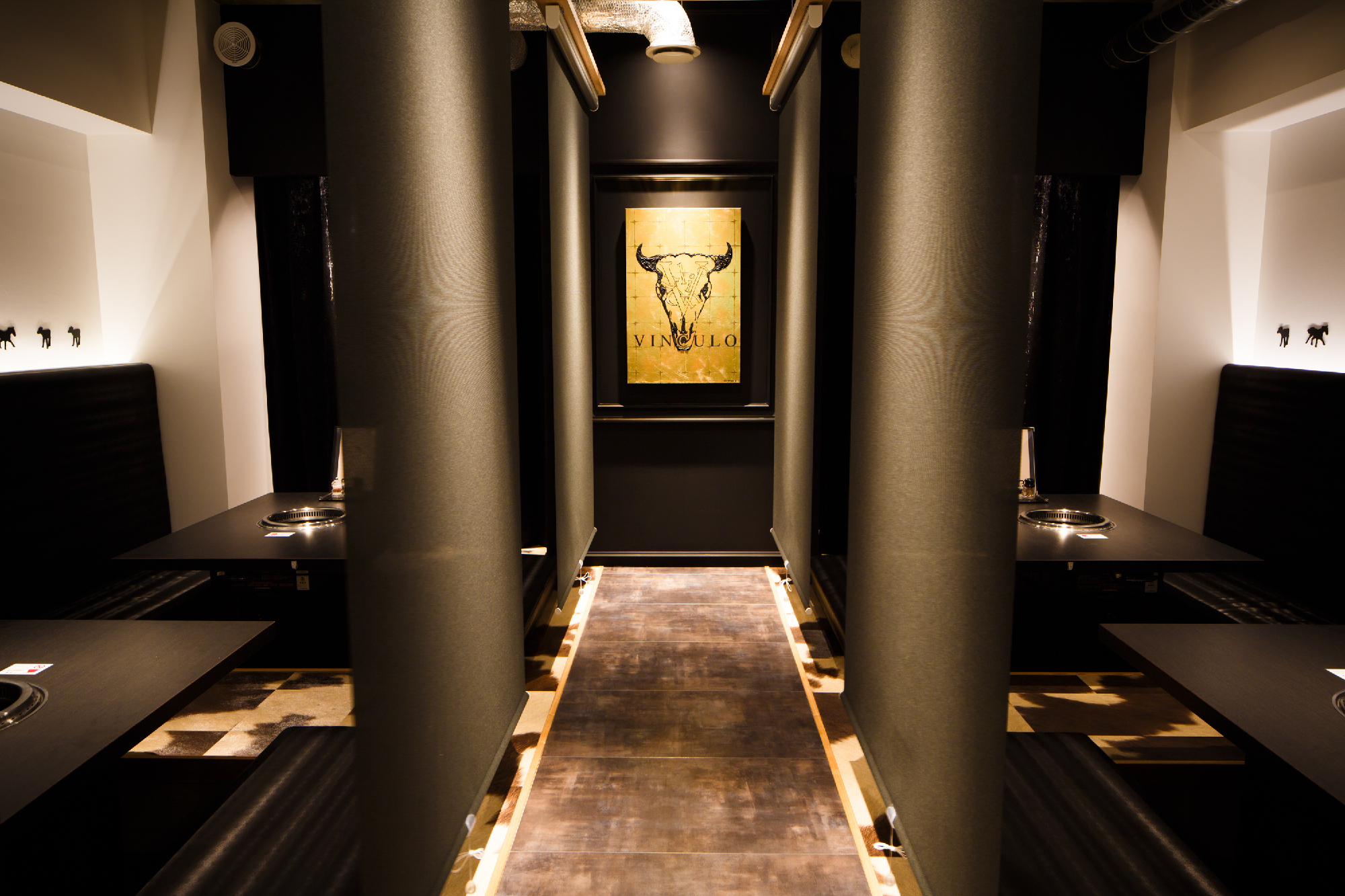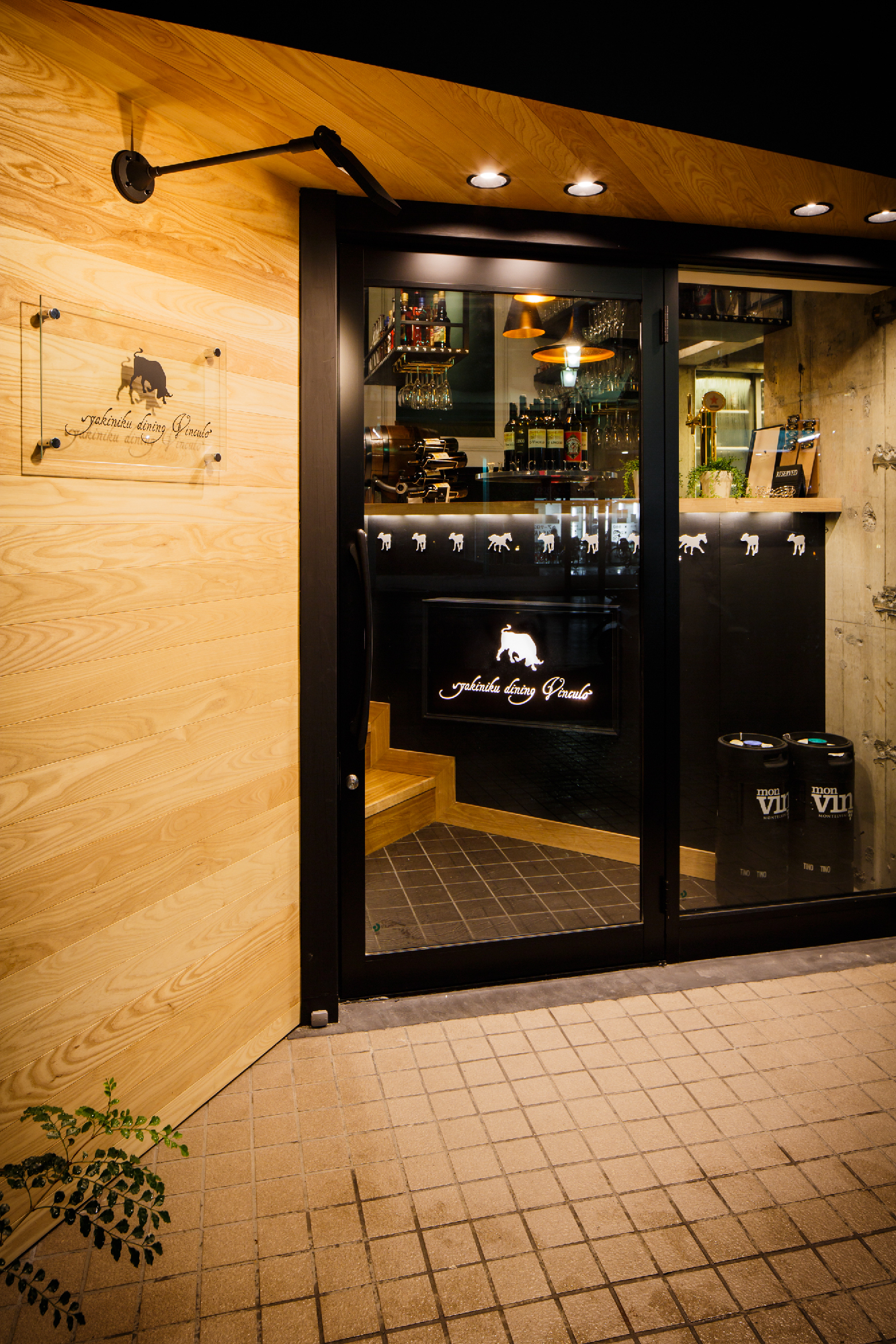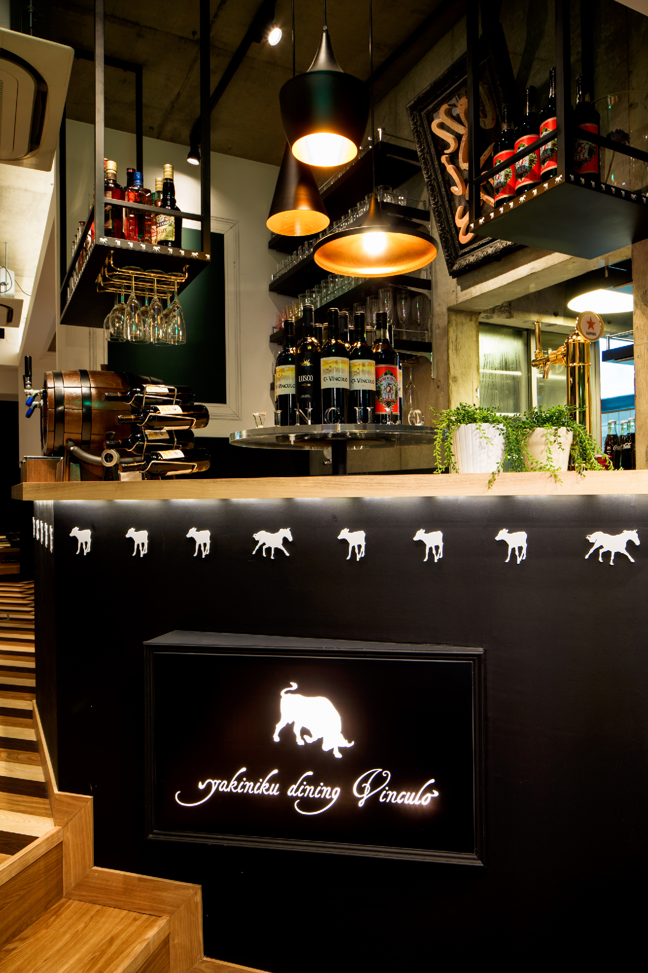 郊外の私鉄駅すぐ近くにカフェでもなくバーでもなく焼き肉店。ランクものの肉を郊外ならではの値段で食べてもらいたいというオーナーの願いがこもったお店。デザインは、カジュアルとアッパーとの間に位置し、焼肉店らしからぬイメージにと。木目、白、黒とシンプルな構成要素ながら、モールディングとアイキャッチな牛達により店内にいろいろな表情を持たせた。バーカウンターが入り口すぐのところにある為、工事中も「バーですか?ダイニングですか?」など聞かれる事も。お肉の他に樽生ワインをメインにしたこだわりのお酒も楽しめるお店という事を視覚的にもこっそりと演出している。