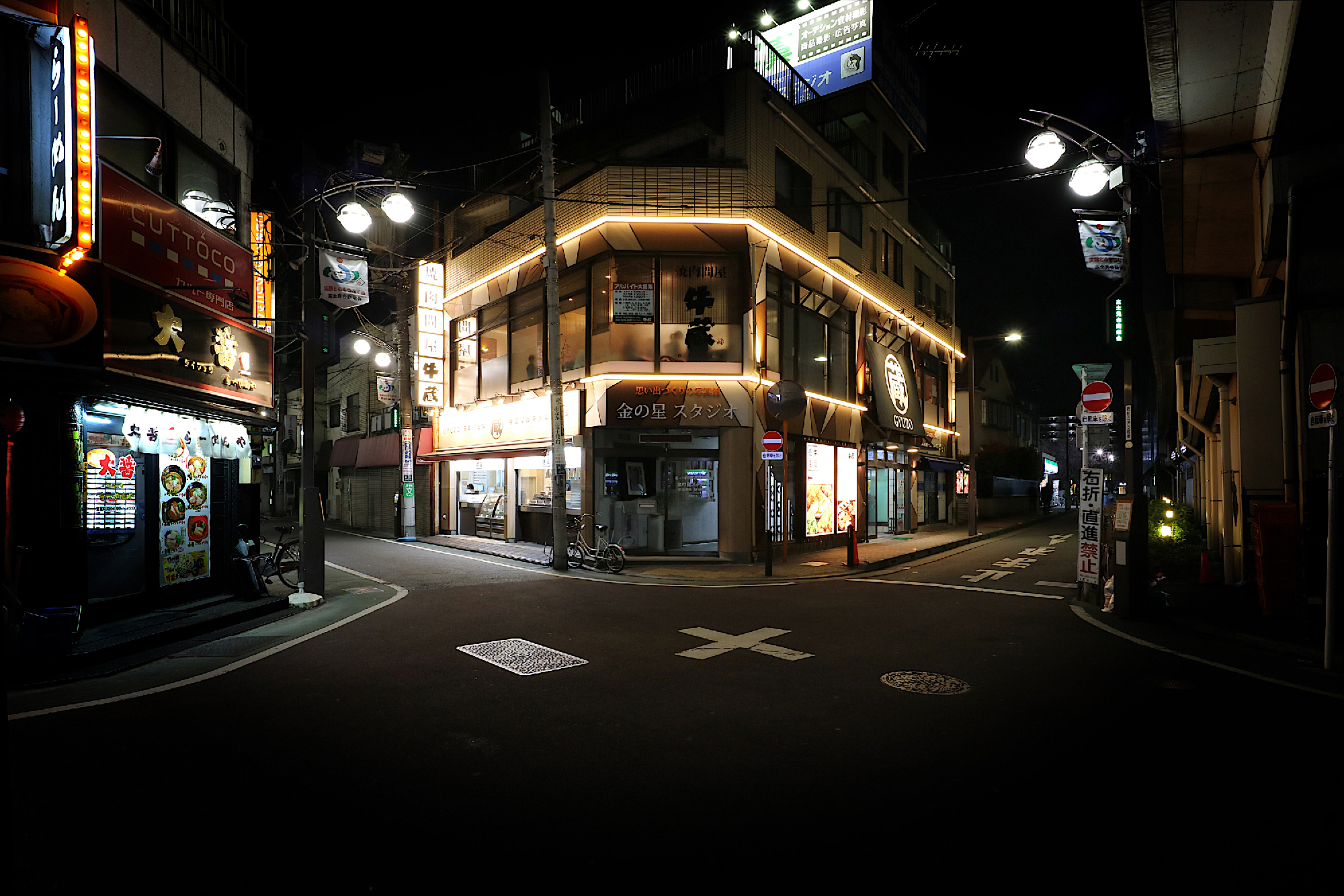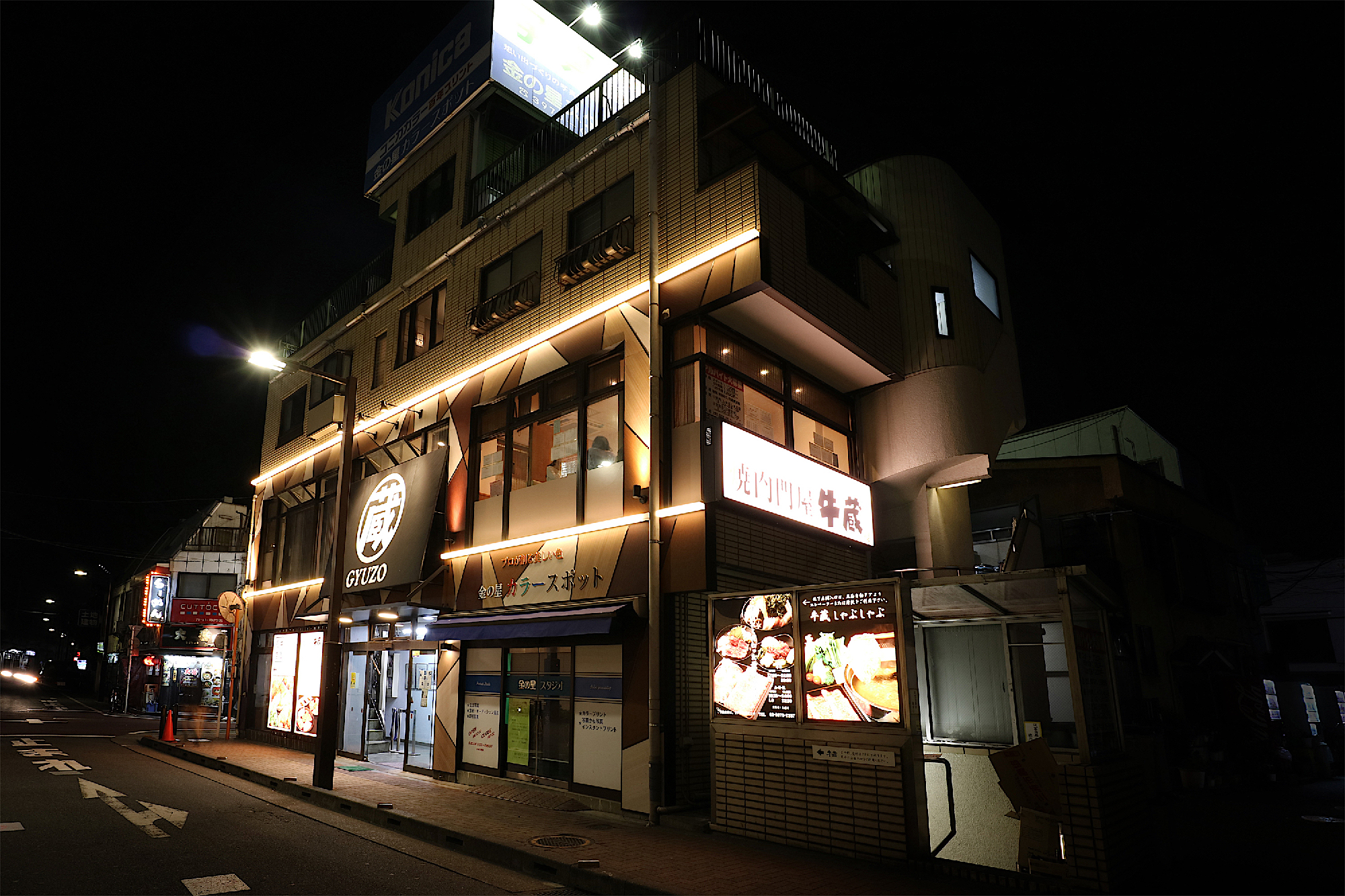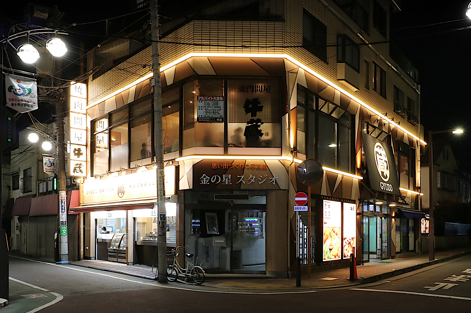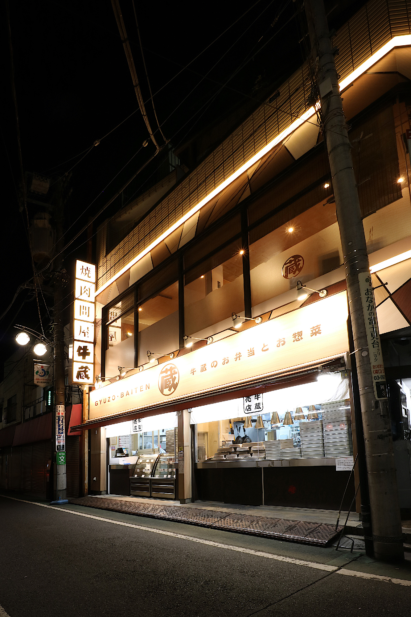 業界・界隈では「超」が付くほどの有名店、プレッシャー(笑)の中から始まったプロジェクト。B1、1F、2Fとビルのかなりの面積を同系列店で埋めているが、上手にその事をアピール出来ていないと言う課題があった。ビルオーナーさんのご理解の基、L字の外壁面に対してライン照明でビルの側面と正面とを繋げる事で分断されていた系列店同士を意識できる様にする事を狙い、またライン照明は前方・上下方向と光を拡散させ、光の分布面積を多くし、更に壁面にも間接光として光が伸びる様にこだわり、工夫した。駅前だが少し落ち着いた夕刻の中に伸びるライン照明の光と木目を幾何学的に配したデザインが柔らかく浮かび上がる、上質だがカジュアル感も感じる良い雰囲気に出来上がったと思う。