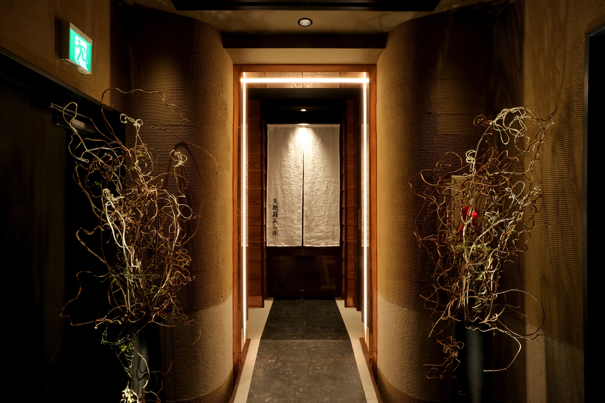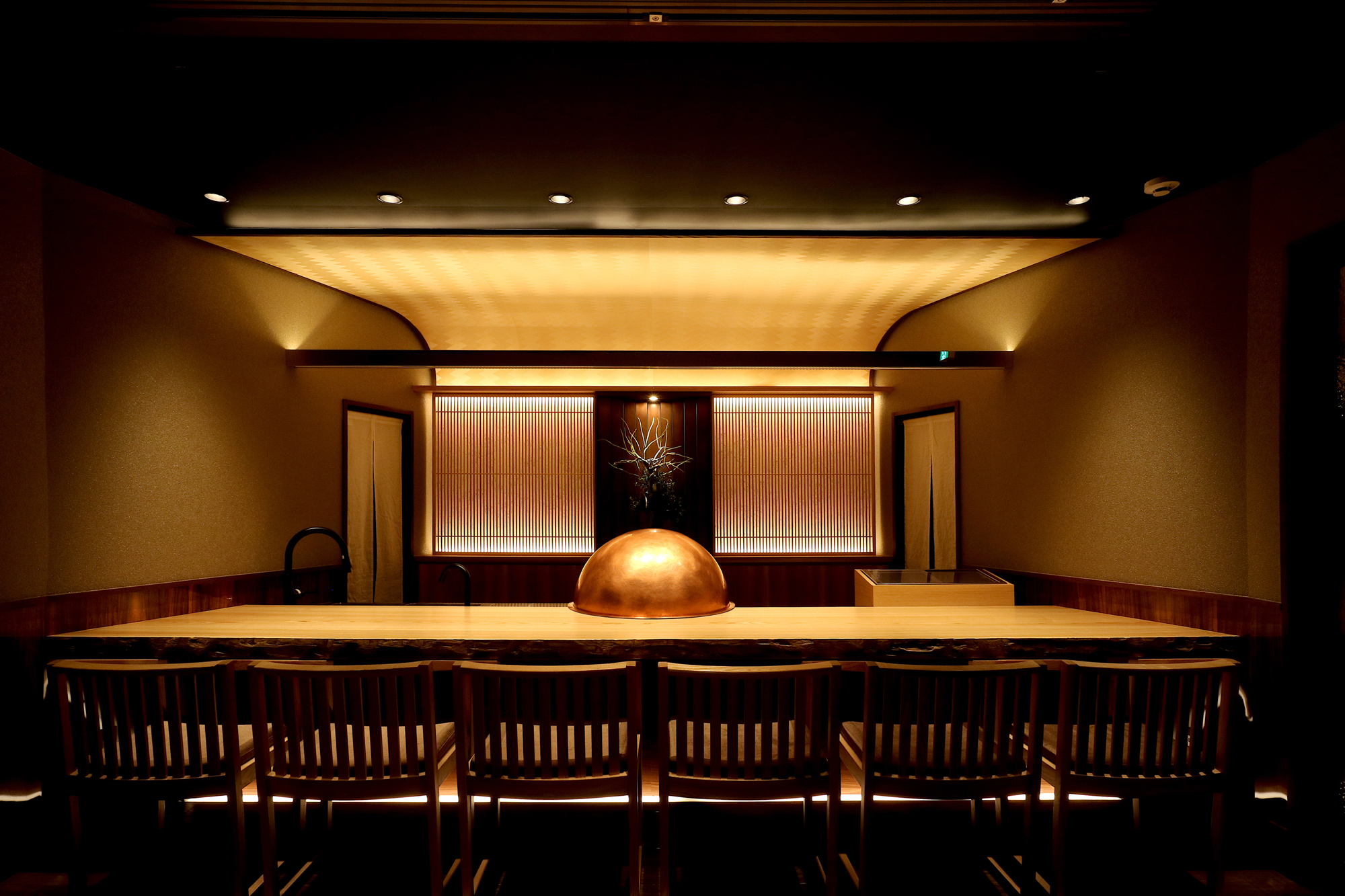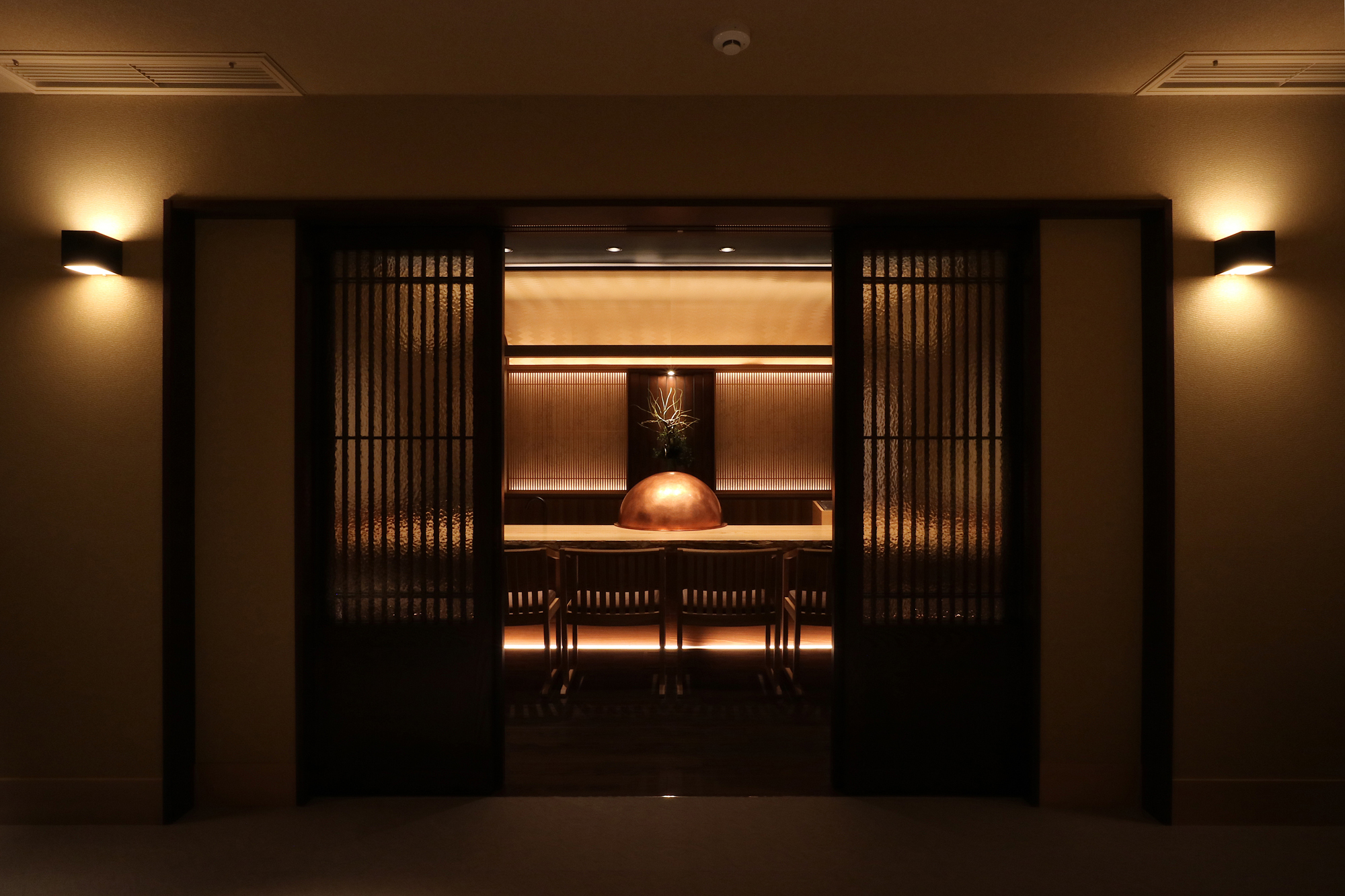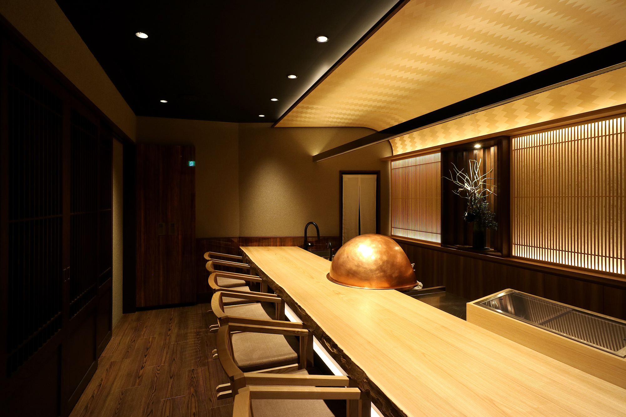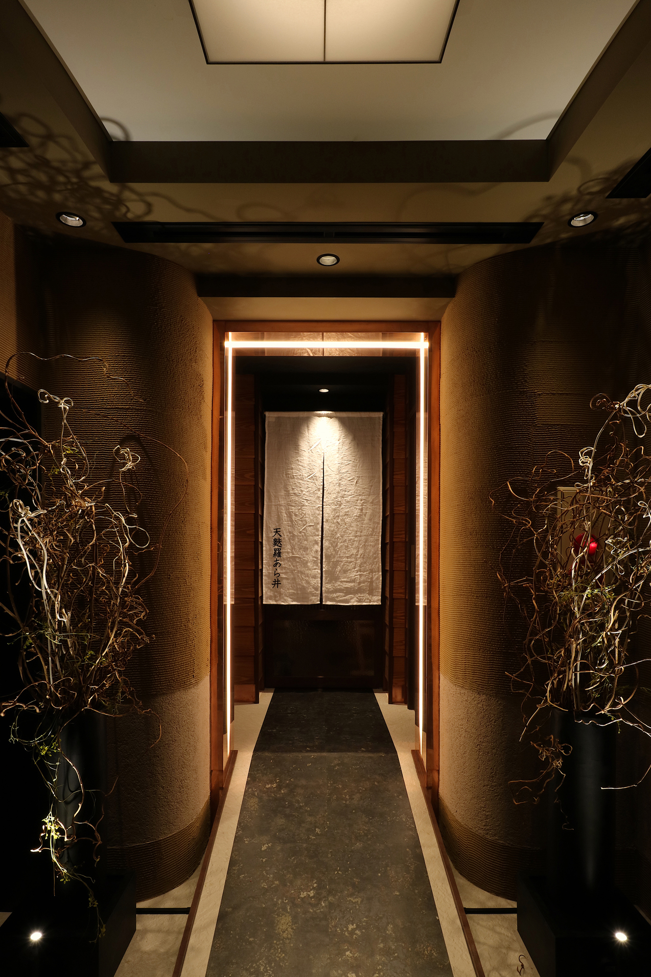 期限がタイトな中、「空間も料理も周りとは一線を画した店舗を。」と始まったプロジェクト。空間のデザインテーマは和モダン。天麩羅と寿司というと白木の雰囲気で清々しさが思い浮かぶが、他店との差別化が図れる様にダークトーンやグロス感を多く取り入れている。その中で天麩羅用の銅製フードがかなりの印象を与える為、「銅」という素材も中心にデザインを構築して行った。細かくは、個室腰板は艶光沢仕上げ、中空の間接照明バーは鏡面、カウンターバックのディスプレイ台も銅板特殊仕上げとブラックミラー、入口アプローチ部の間接照明三方枠は銅、巾木にも銅を使用するなど。最終的には、予算も期限も少しだけ足を出てしまったが、和の清々しさや凛とした雰囲気を残しながらも、モダンな印象の、他店とは一線を画した店舗が出来上がったと思う。