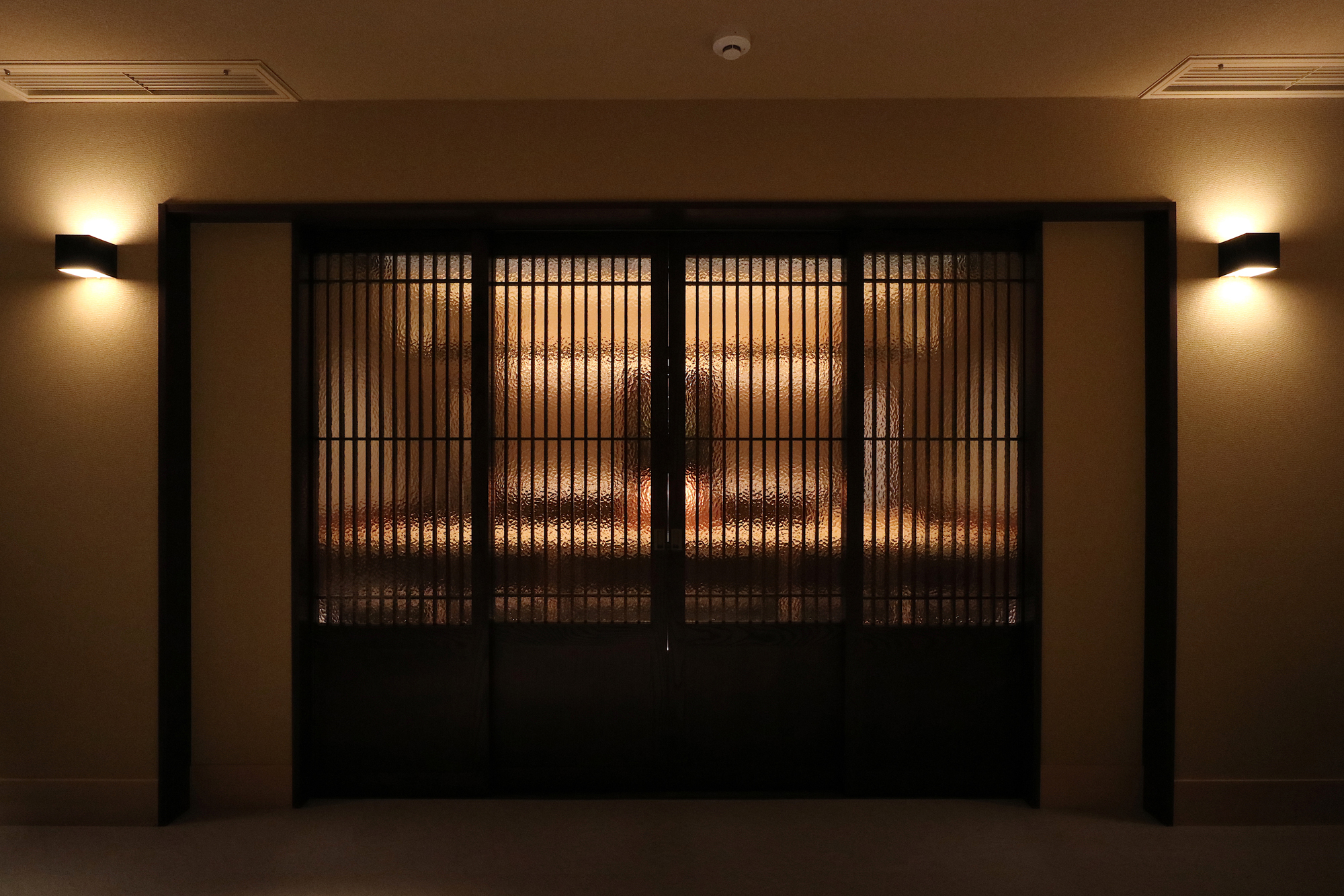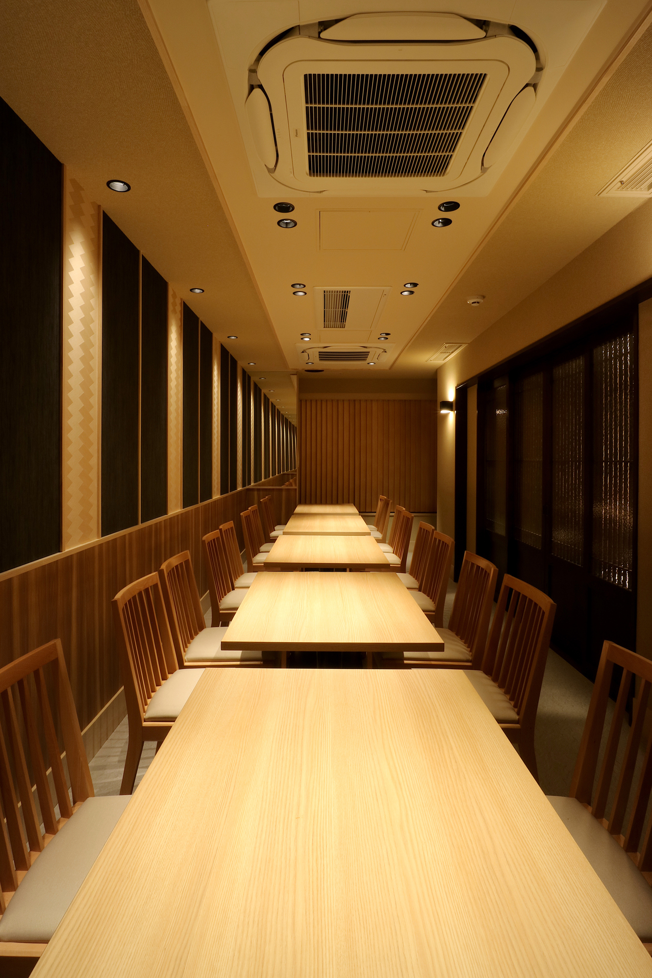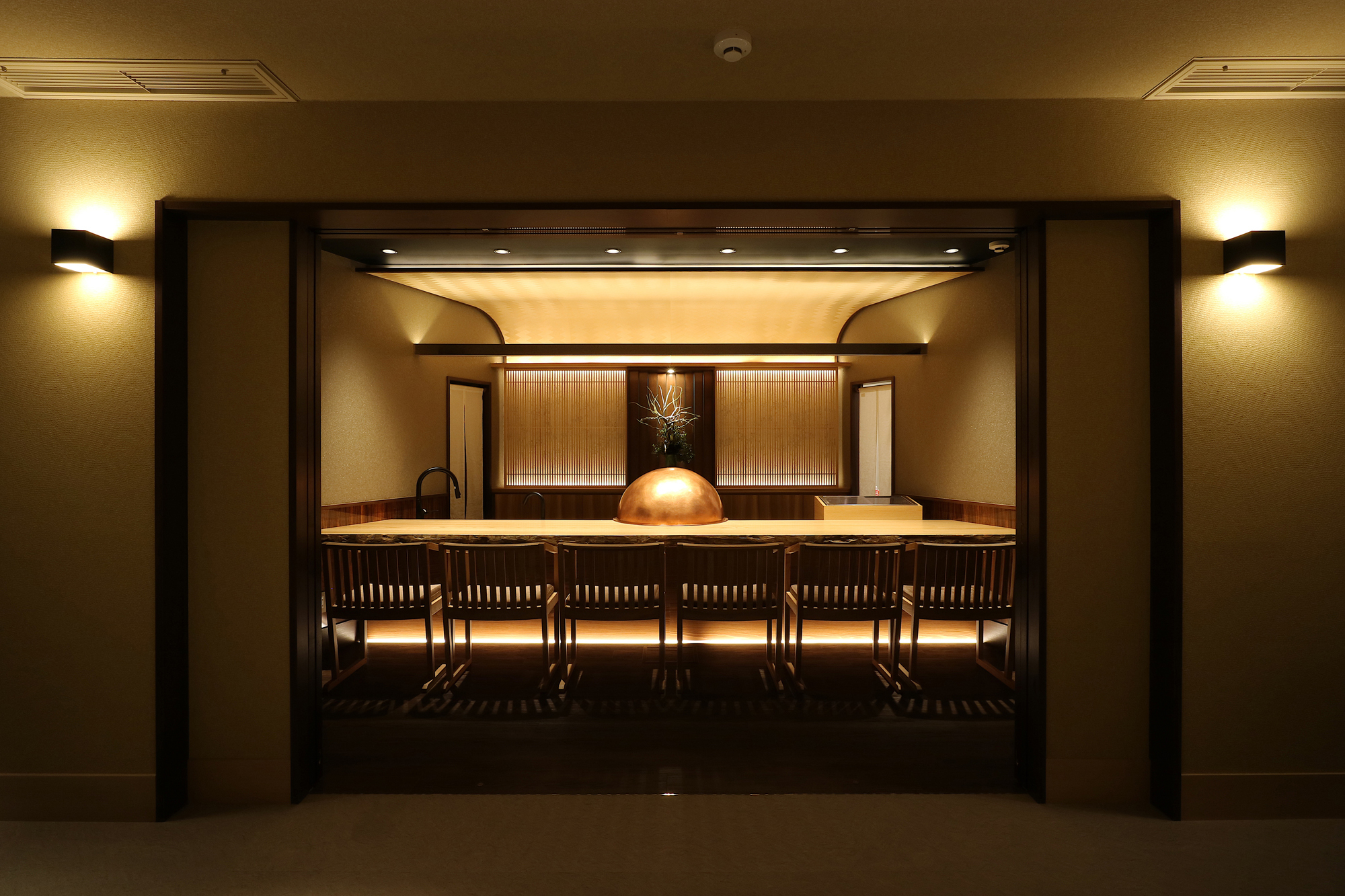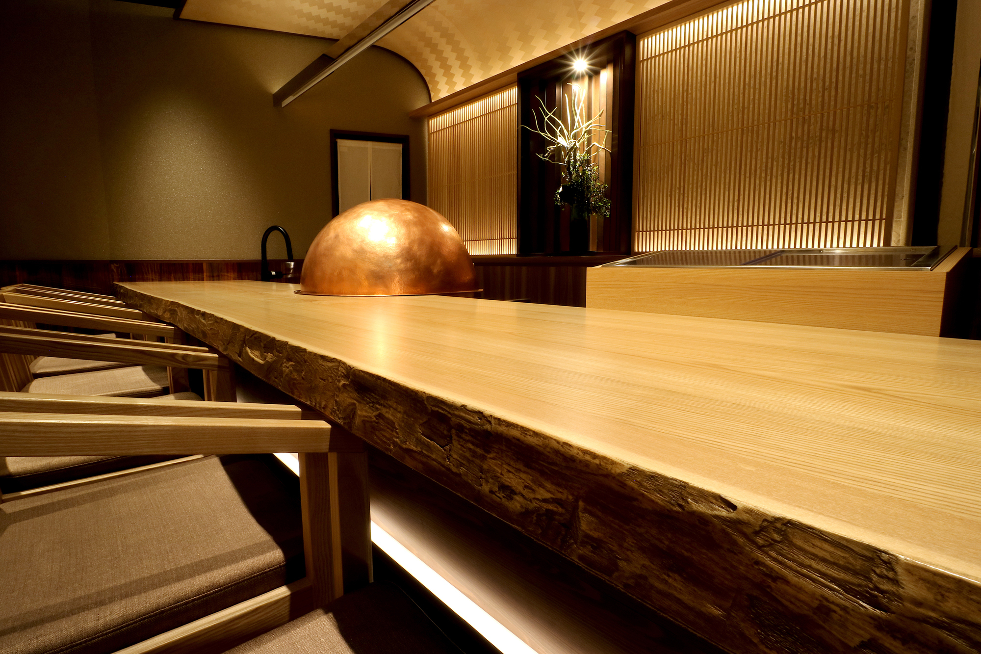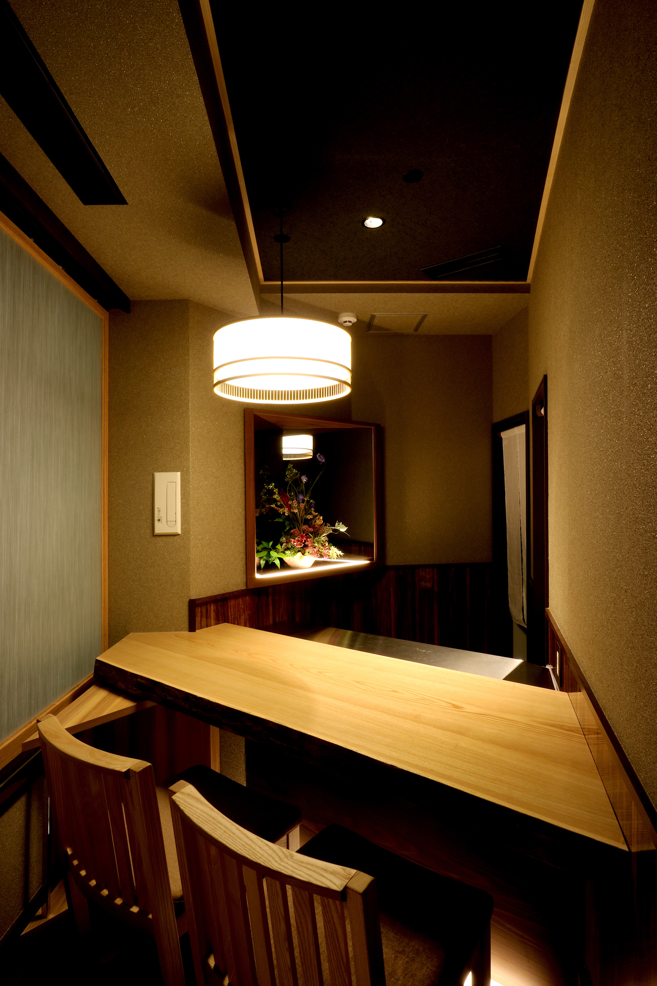 期限がタイトな中、「空間も料理も周りとは一線を画した店舗を。」と始まったプロジェクト。空間のデザインテーマは和モダン。天麩羅と寿司というと白木の雰囲気で清々しさが思い浮かぶが、他店との差別化が図れる様にダークトーンやグロス感を多く取り入れている。その中で天麩羅用の銅製フードがかなりの印象を与える為、「銅」という素材も中心にデザインを構築して行った。細かくは、個室腰板は艶光沢仕上げ、中空の間接照明バーは鏡面、カウンターバックのディスプレイ台も銅板特殊仕上げとブラックミラー、入口アプローチ部の間接照明三方枠は銅、巾木にも銅を使用するなど。最終的には、予算も期限も少しだけ足を出てしまったが、和の清々しさや凛とした雰囲気を残しながらも、モダンな印象の、他店とは一線を画した店舗が出来上がったと思う。