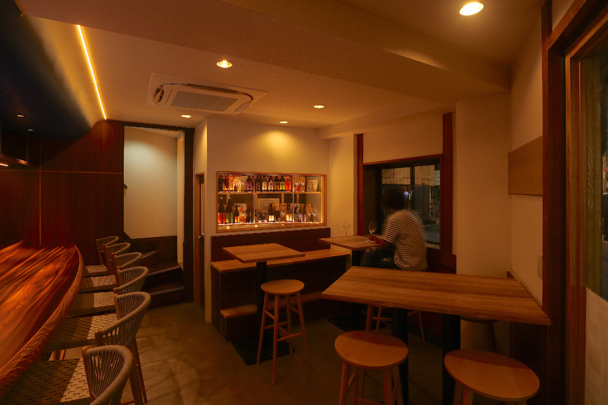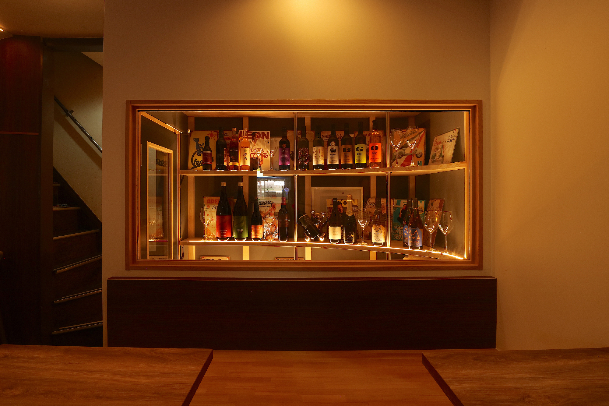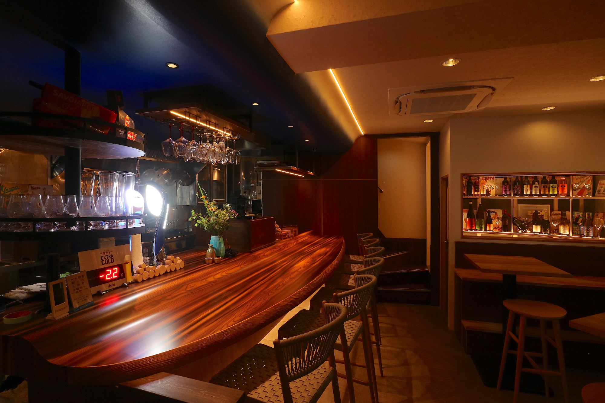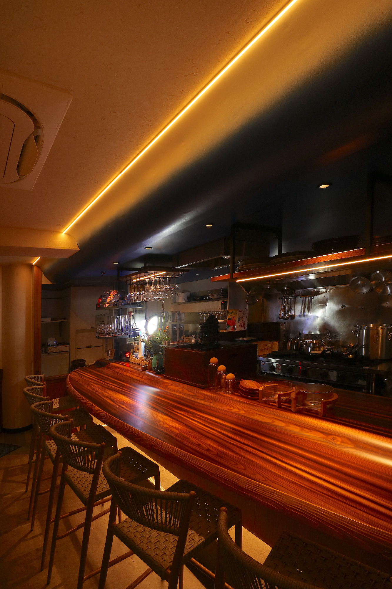 一棟貸し物件でのリニューアルプロジェクト。イメージは長野ご出身のオーナー様らしい「八ヶ岳」を感じるものにとのこ事。早速ネット検索したら予想通り大自然の山々の風景写真ばかり!もう一択です。新色?八ヶ岳ブルーを採用!元の木目が濃目だったのでカウンターの色味も少し濃目とし八ヶ岳の青空はスカイブルーですが、そこは調整させて頂いた。リニューアルポイントがカウンター部分であったが既存床との関係から、どうしても厨房側と客席側のカウンター高さが合わなかった。そこで厨房側の作業面を確保し「くびれ」を描いて高さを落とし込みカウンター形成する事で2段カウンターではないスッキリとした印象のフラットカウンターを創り上げた。奥行き約1.2mの長さが約4.5mのなかなかのカウンターである。八ヶ岳ブルーの天井と濃い目の強調された木目のカウンターがシックでもあり、カッコつけすぎない印象を与えられた空間になったと思う。