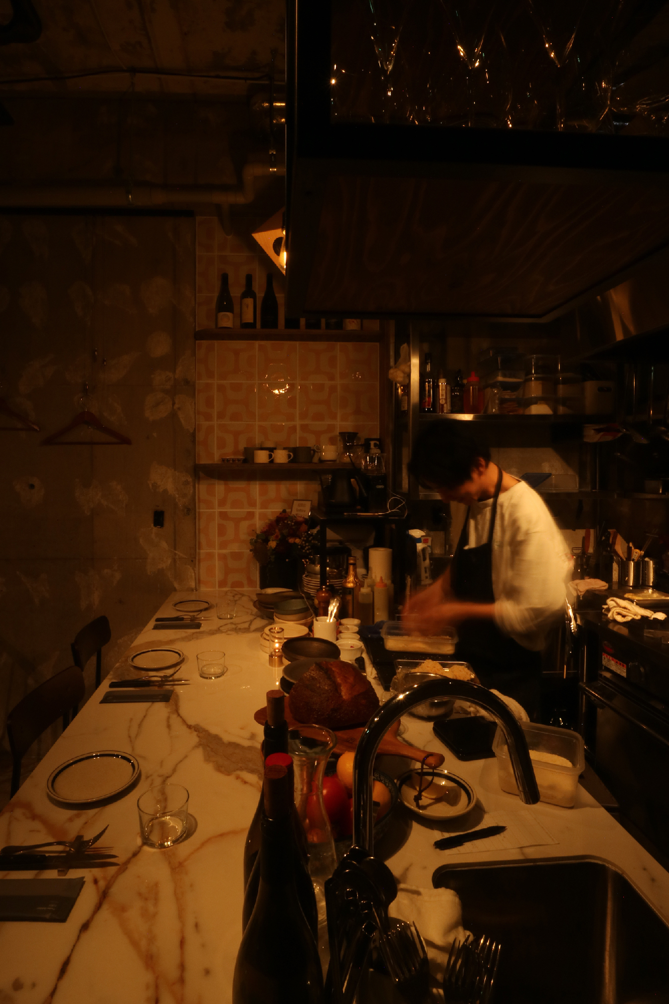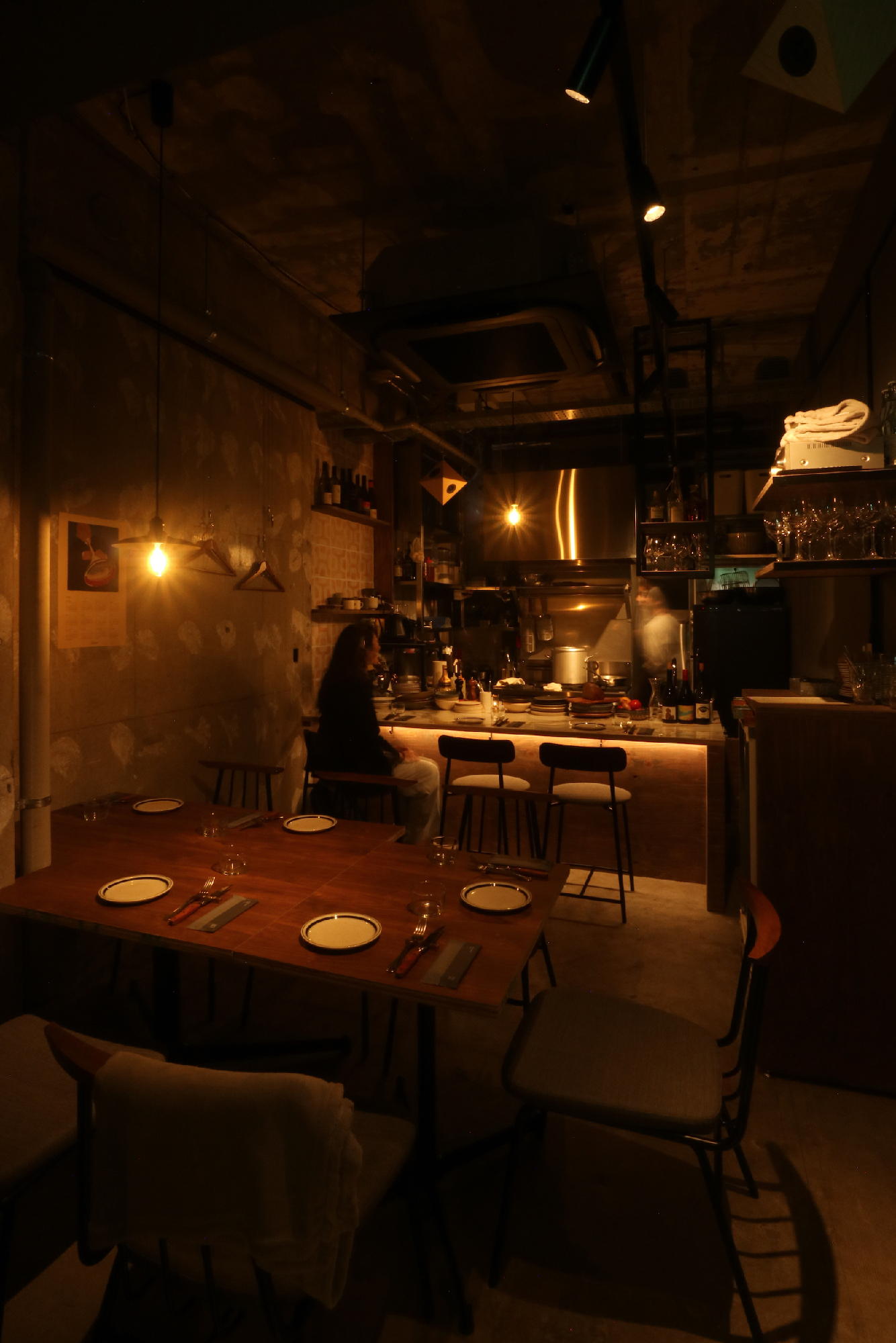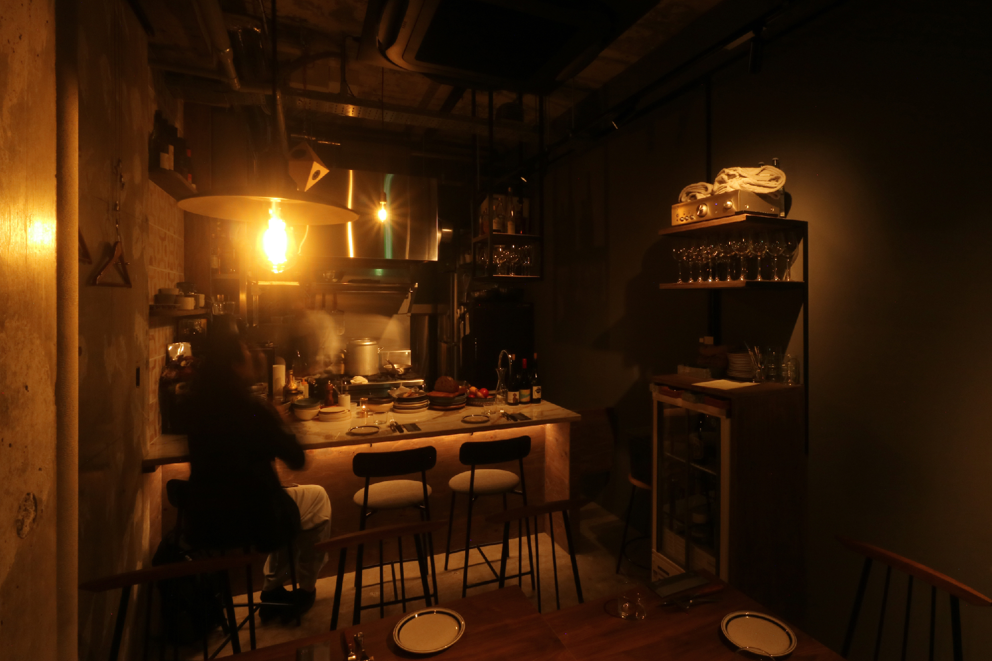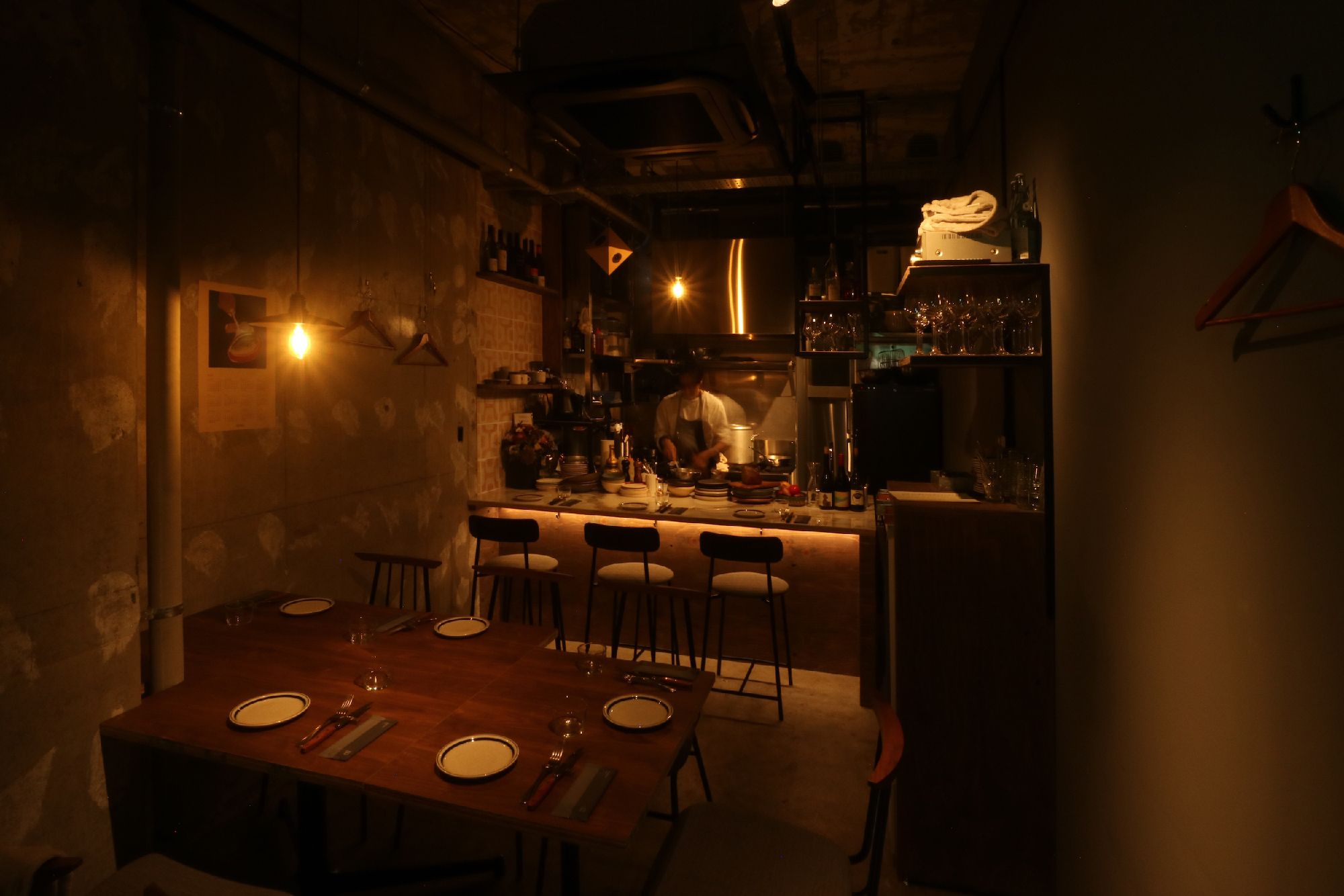 リノベーションしたばかりのビル1階テナントで元々の部屋をいくつかに分割した1区画。インフラも元の部分から分割してありテナントの中を横断している。特に悩ましかったのが排水管で隣からここへ、さらに隣へと渡っていた。こういう場合は床上げをするのがセオリーなんですが。どうにか出来ないかと考え、シンク脚を排水管と干渉しない位置に特注で設置。グリストラップはその分、小さめだが床上げしないレイアウトにはこの方法しかなくそのプランでご提案。最初は悩まれていましたがそのプランとなった。食事に伺った時、入口ガラスドア越しにカウンター向こうで料理していたオーナー様と目があって挨拶をした。勿論、目線の高さは一緒だった。これが一段上がっていたらどうなっていたのか。と想像をした。6坪という小さな空間だが、空間(高さ)をデザインするということの難しさや大切さを改めて感じるプロジェクトになった。