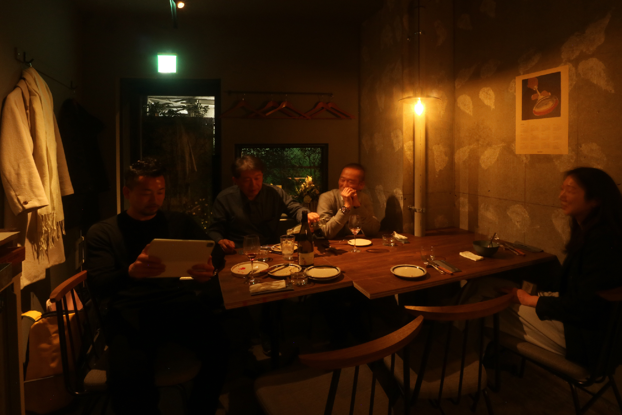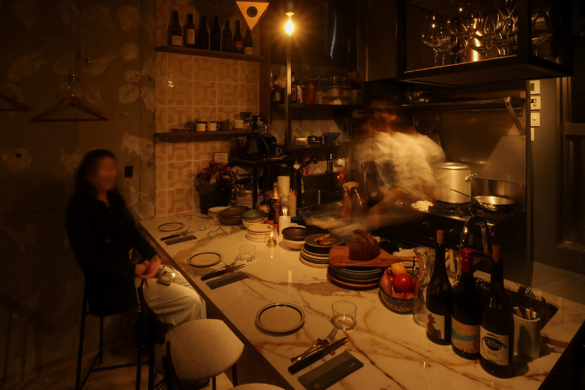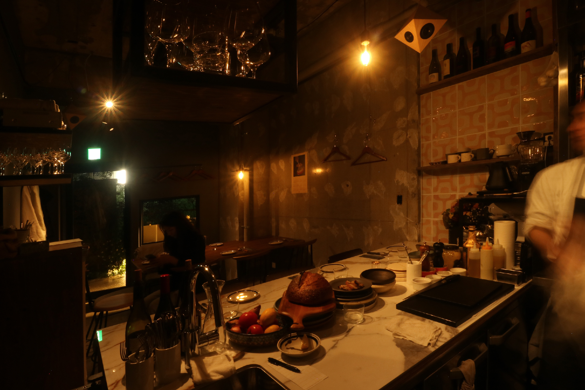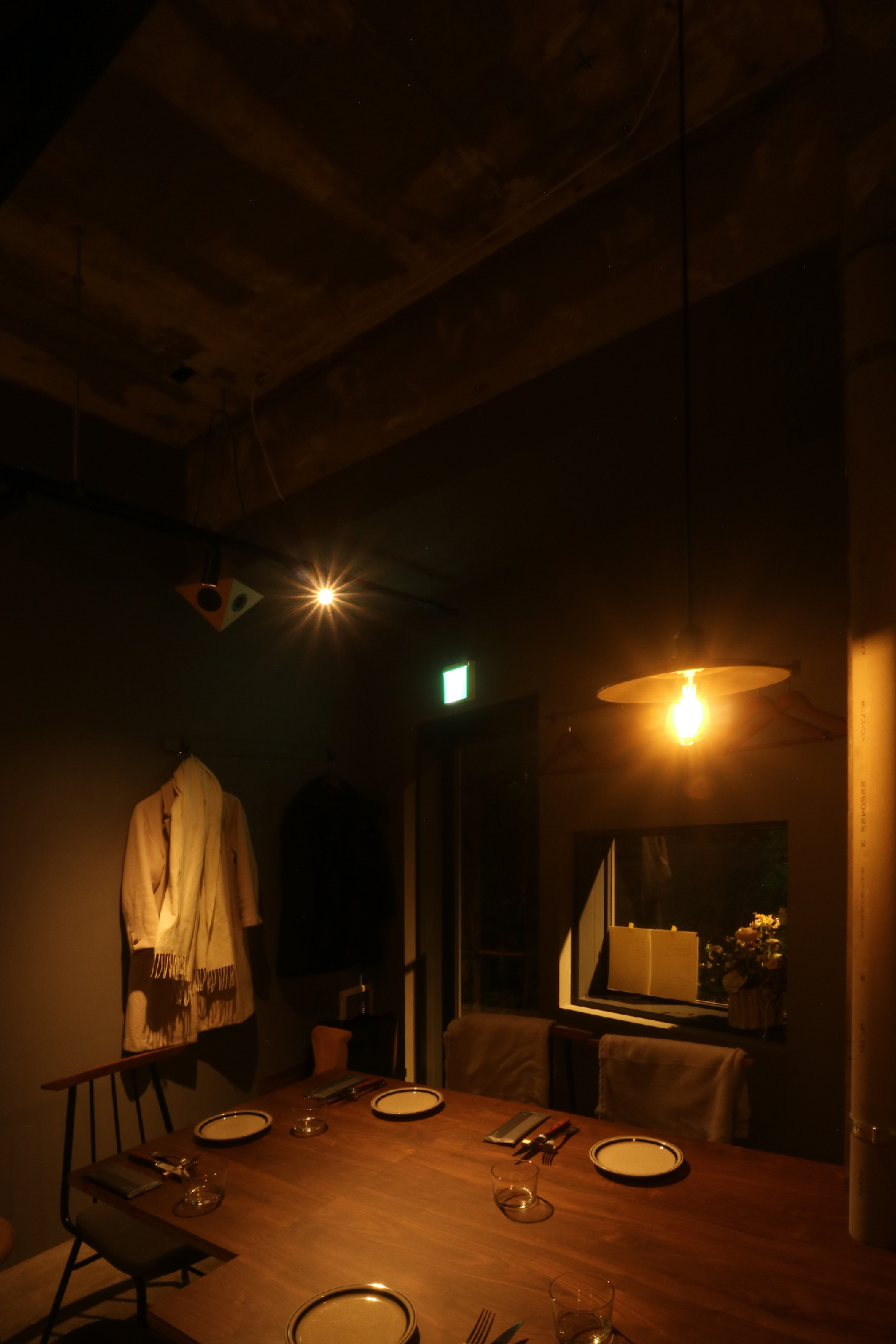 リノベーションしたばかりのビル1階テナントで元々の部屋をいくつかに分割した1区画。インフラも元の部分から分割してありテナントの中を横断している。特に悩ましかったのが排水管で隣からここへ、さらに隣へと渡っていた。こういう場合は床上げをするのがセオリーなんですが。どうにか出来ないかと考え、シンク脚を排水管と干渉しない位置に特注で設置。グリストラップはその分、小さめだが床上げしないレイアウトにはこの方法しかなくそのプランでご提案。最初は悩まれていましたがそのプランとなった。食事に伺った時、入口ガラスドア越しにカウンター向こうで料理していたオーナー様と目があって挨拶をした。勿論、目線の高さは一緒だった。これが一段上がっていたらどうなっていたのか。と想像をした。6坪という小さな空間だが、空間(高さ)をデザインするということの難しさや大切さを改めて感じるプロジェクトになった。