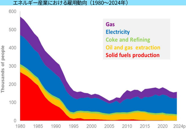 エネルギー生産および供給産業における雇用は、1980年代から1990年代半ばにかけて、主に炭鉱の閉鎖により急速に減少しました。1995年から2000年代半ばにかけては、雇用の減少は緩やかでしたが、2006年以降は、主に電力およびガス部門の成長に牽引され、徐々に増加しました。しかし、2020年以降、エネルギー産業の雇用は概ね減少しています。2024年の雇用は前年比1.9%増の158,400人となり、2005年の水準を45%上回り、全産業雇用の5.6%を占めました。2024年のエネルギー総量のうち、電力(再生可能エネルギーを含む)は56%、ガスは22%、石油およびガス採掘は16%を占めました。