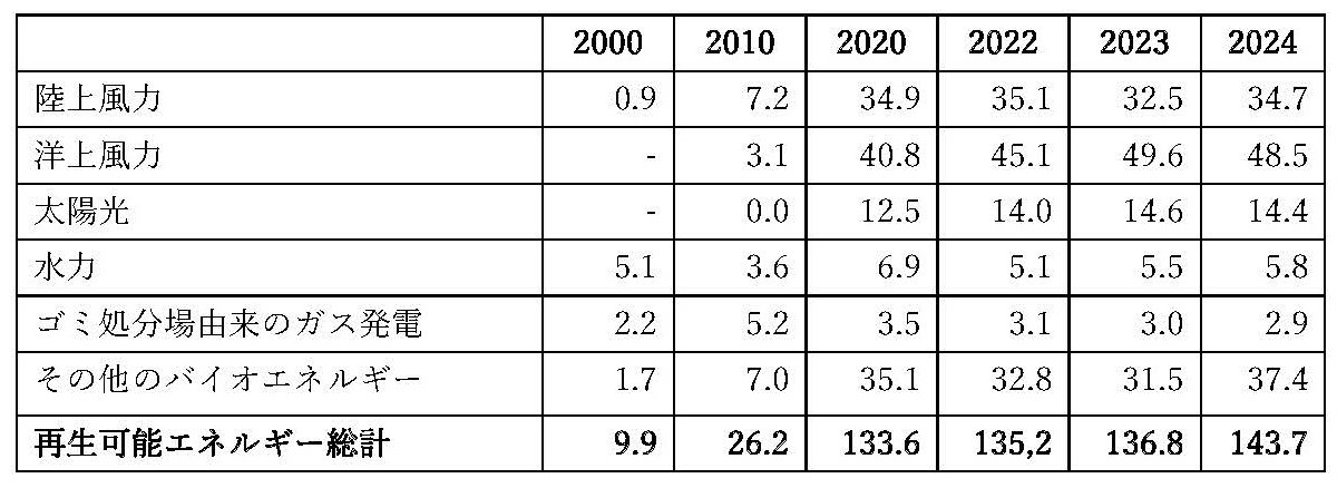 陸上風力発電は、2023年の停電や出力抑制、容量増加、そして平均風速の若干の上昇などにより、2024年には6.9%増加する見込みです。一方、洋上風力発電は、計画的な保守、計画外の停電、出力抑制の影響で、2023年比2.2%減少しました。太陽光発電は、平均日照時間の減少により1.9%減少しました。2024年は、2001年の時系列データ開始以来、最も日照時間の少ない年となりました。木質系バイオマスは最大の増加率(27%)を記録し、バイオガス発電 (嫌気性消化処理)と廃棄物発電も記録的な増加となりました