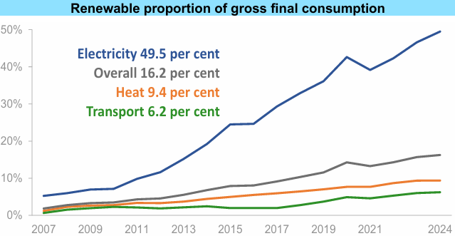 再生可能エネルギー全体の指標において再生可能電力が優位であることを考慮すると、2020年の再生可能電力供給の増加の影響により、全体の指標は2023年の15.7%から2024年には16.2%に上昇することになります。
