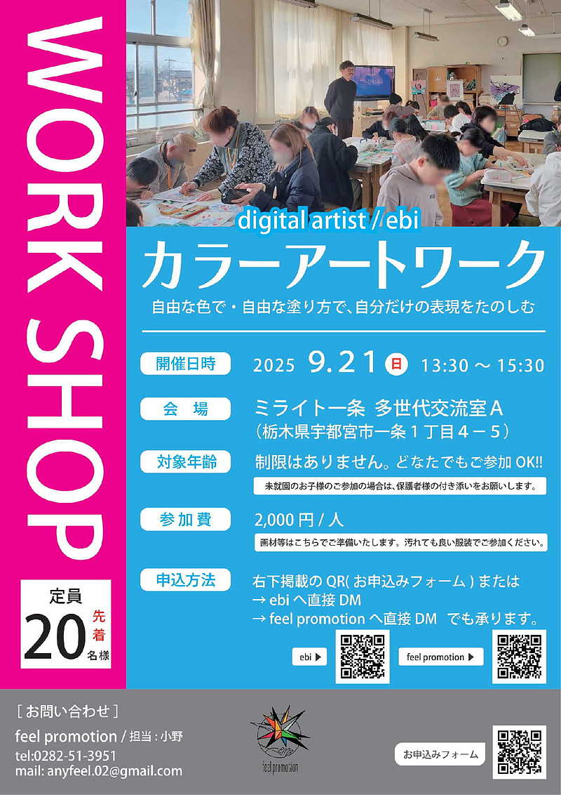 この日のために私ebiが制作する線画に、用紙された画材を使って一人一人自由な表現を楽しみましょう!
