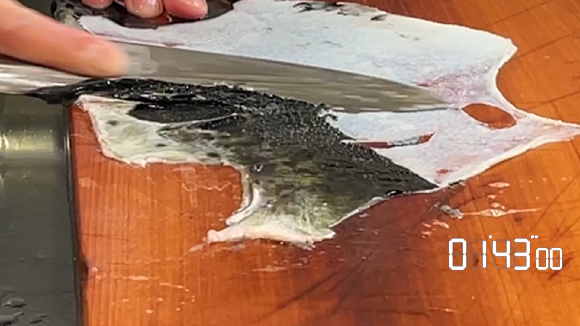 捌く板前の技術として、ふぐだけに必要な技術、ふぐ皮の皮引きをお見せしております。