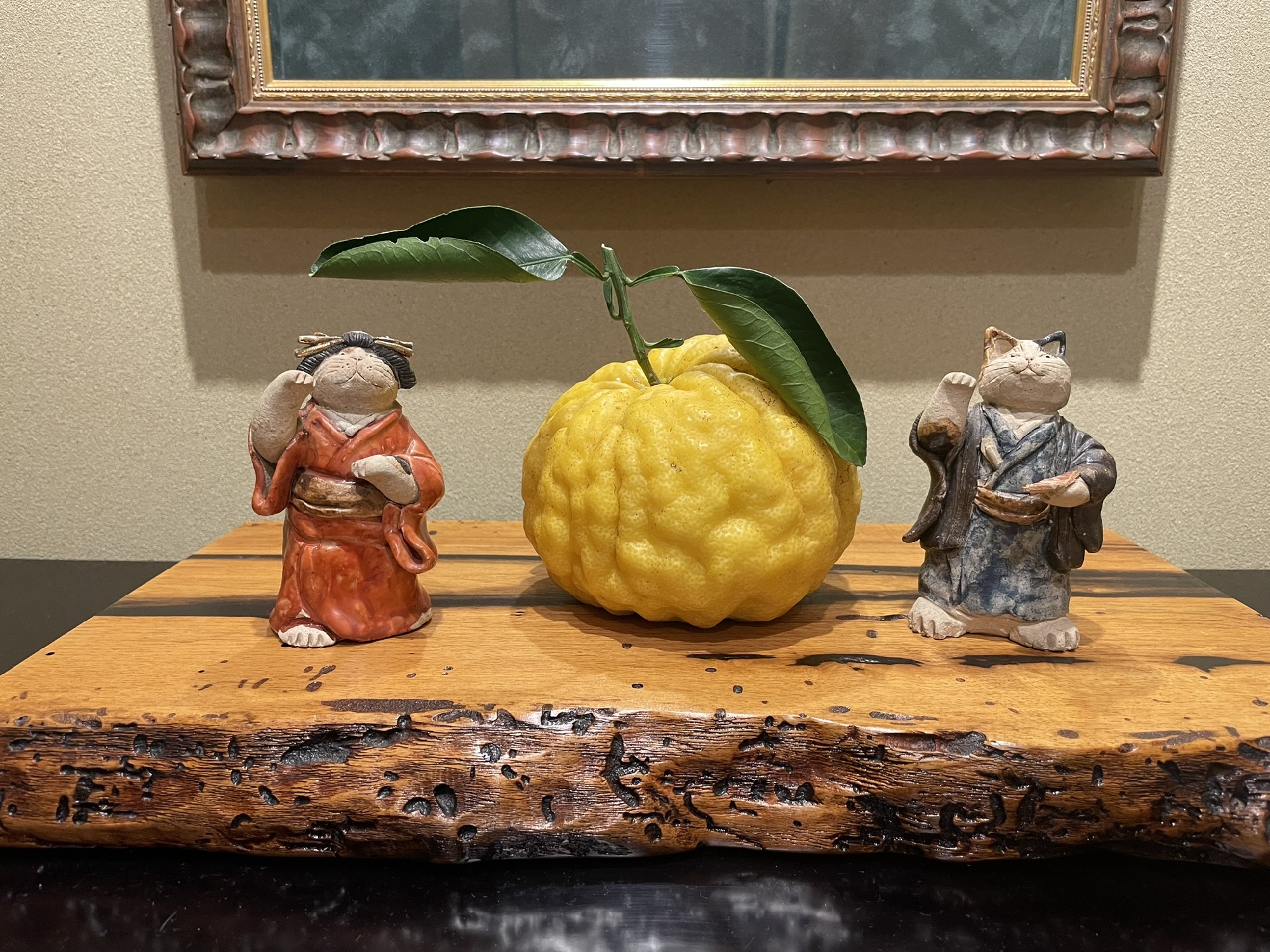 先日、足柄山の麓のお店で見つけた、獅子柚子の画像を飾ってみました。