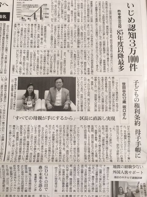 小5の時、坂口さんから、保坂世田谷区長への直接的な働きかけで、世田谷区の母子手帳には「子どもの権利条約」が掲載されています。
