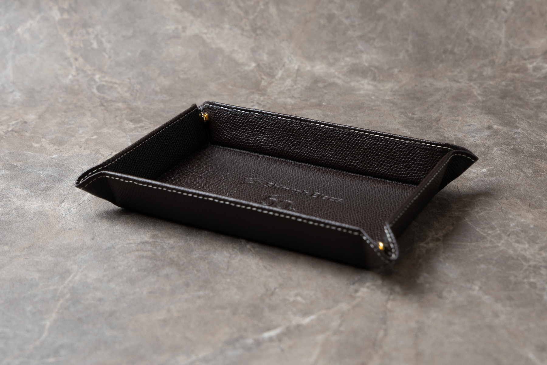 法人記念品をスタートして間もない頃、30個の注文をいただいたのが最初でした。それがいつしか100個、300個、500個、1,000個、、と注文をいただくようになり、毎年需要が途絶えないアイテム。それが「本革ウォッチトレー」です。とくにダークブラウンとブラックが人気色で、法人記念品のロングセラー商品と言っても過言ではないでしょう。