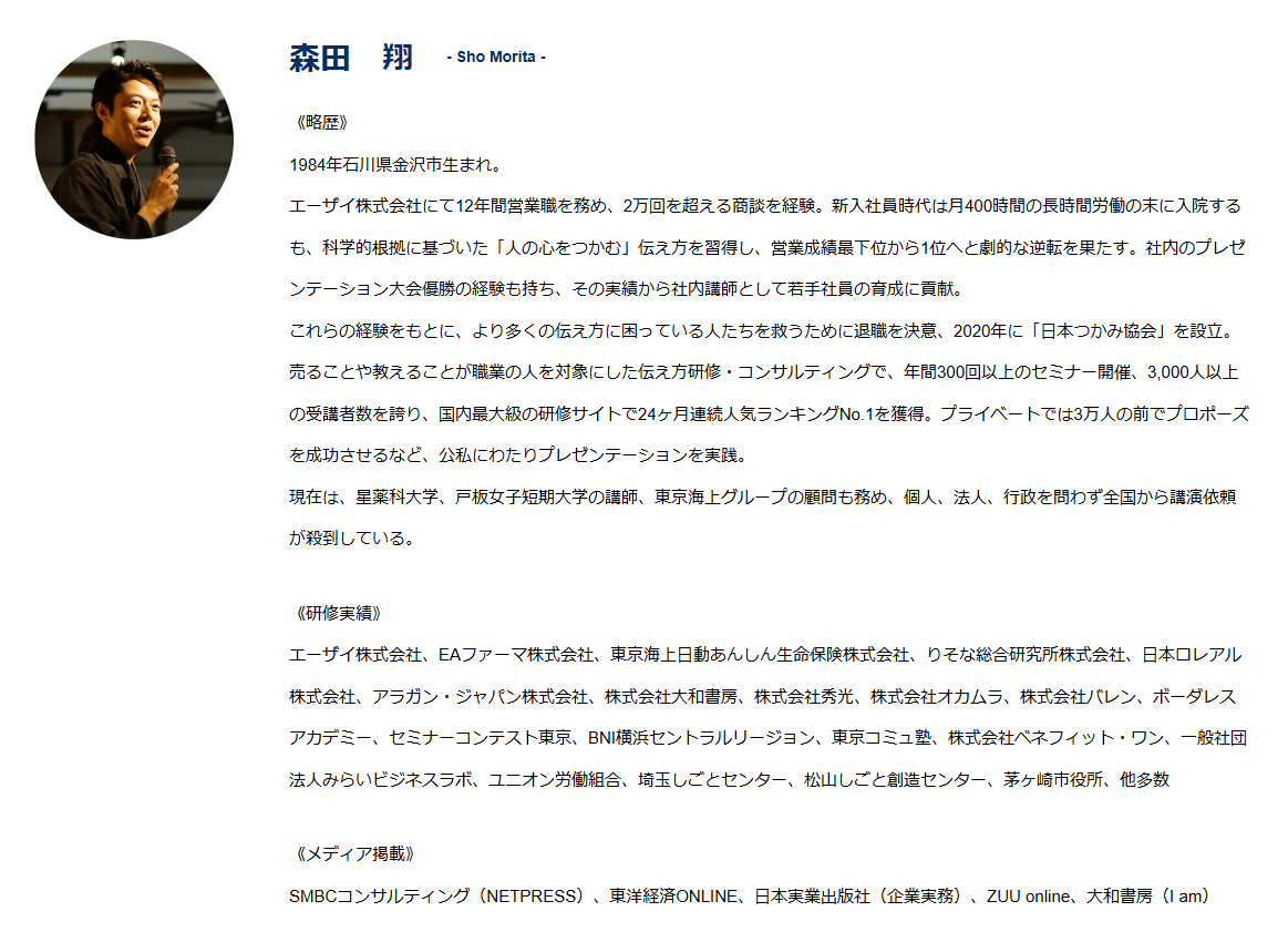 累計3000人以上が受講した「つかみ」の専門家。プレゼンテーションや商談、さらには日常生活において、相手の注意を引き、興味を持たせ、行動を促す「つかみ」の技術を体系化し伝授している。その指導を受けた多くの受講生が、ビジネスや人間関係において劇的な成果を出しています。