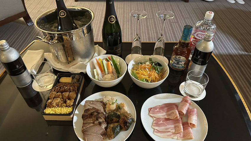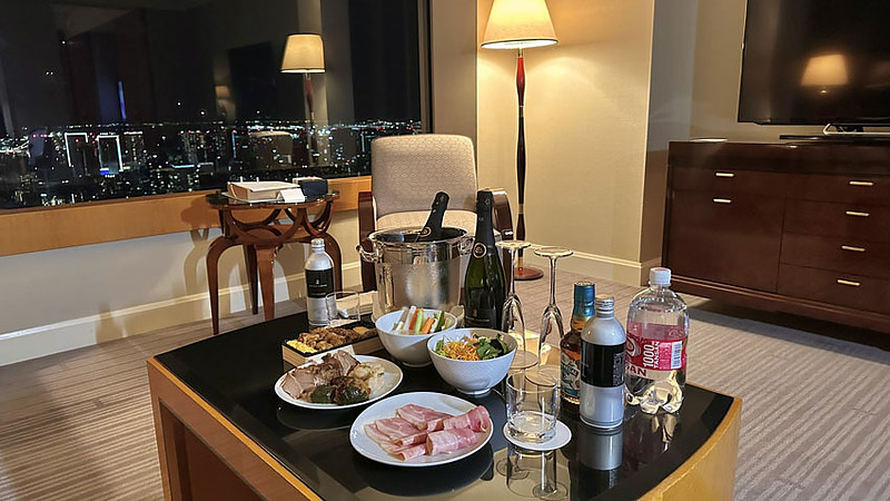 こんなリッチなラグジュアリーホテルでの年越しですが、ディナーはホテルが入居しているミッドタウン東京内にあるスーパーで買い出しした食材と、アメニティでいただいたシャンパン、持参したウィスキーで夫婦二人でっひっそりパーティーしました。