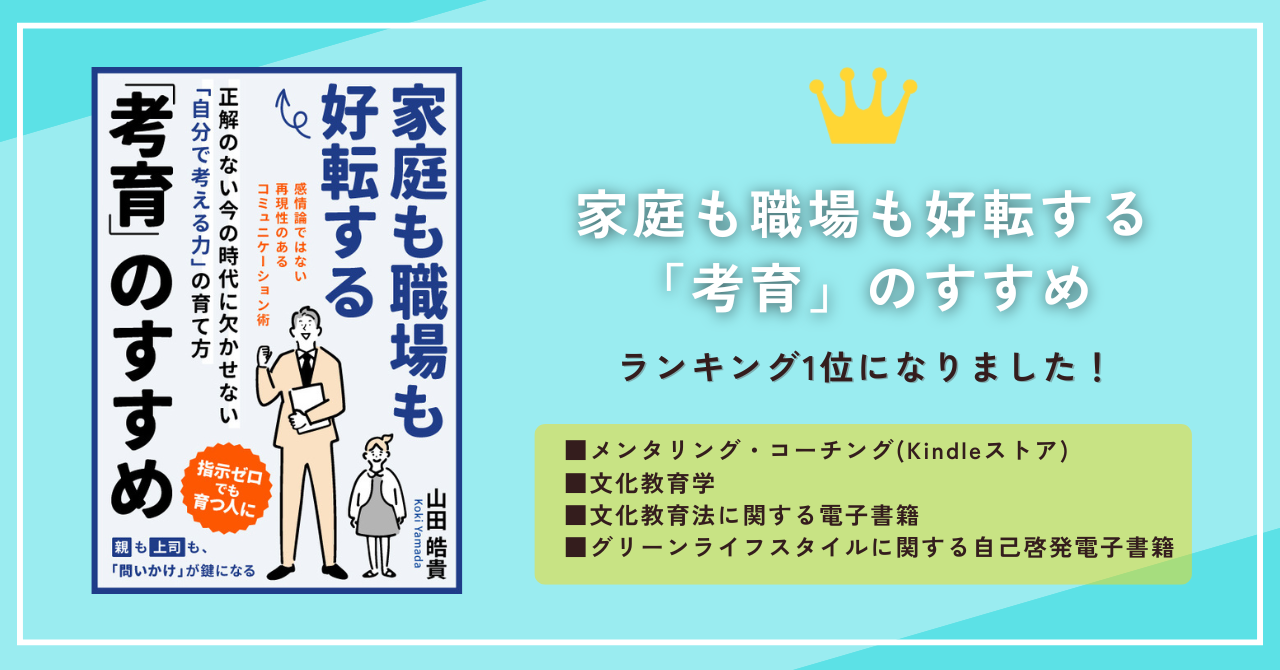 先日発売した電子書籍【家庭も職場も好転する「考育」のすすめ】が、みなさんの応援のおかげで、なんと以下の4部門で1位を獲得いたしました…!