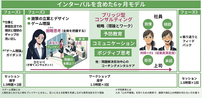 「実践」を重視しているため、次のコンサルティングまで2週間ほど空けることが有効ですので、概ね6ヶ月ほどで終了する内容です。