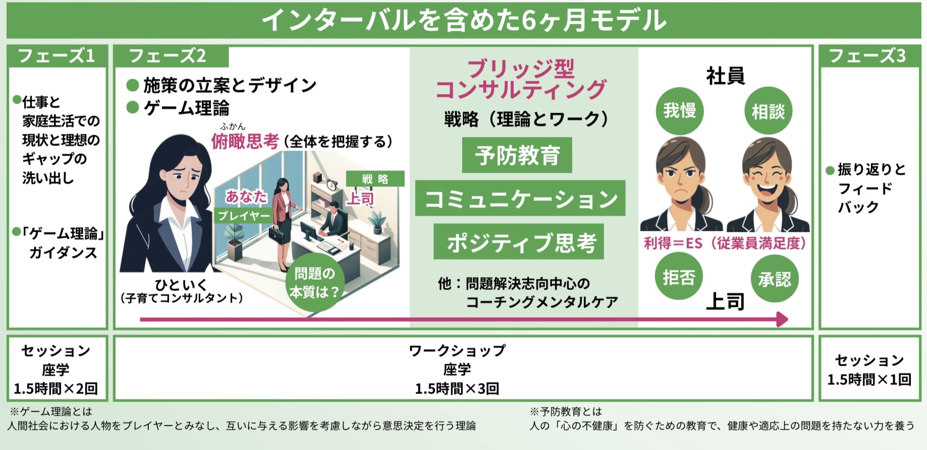 プログラムのフェーズは3つ全6回(1回75分程度)で、3〜6人ほどを1グループとし、グループワークを進めていきます(個別でも対応いたします)。
