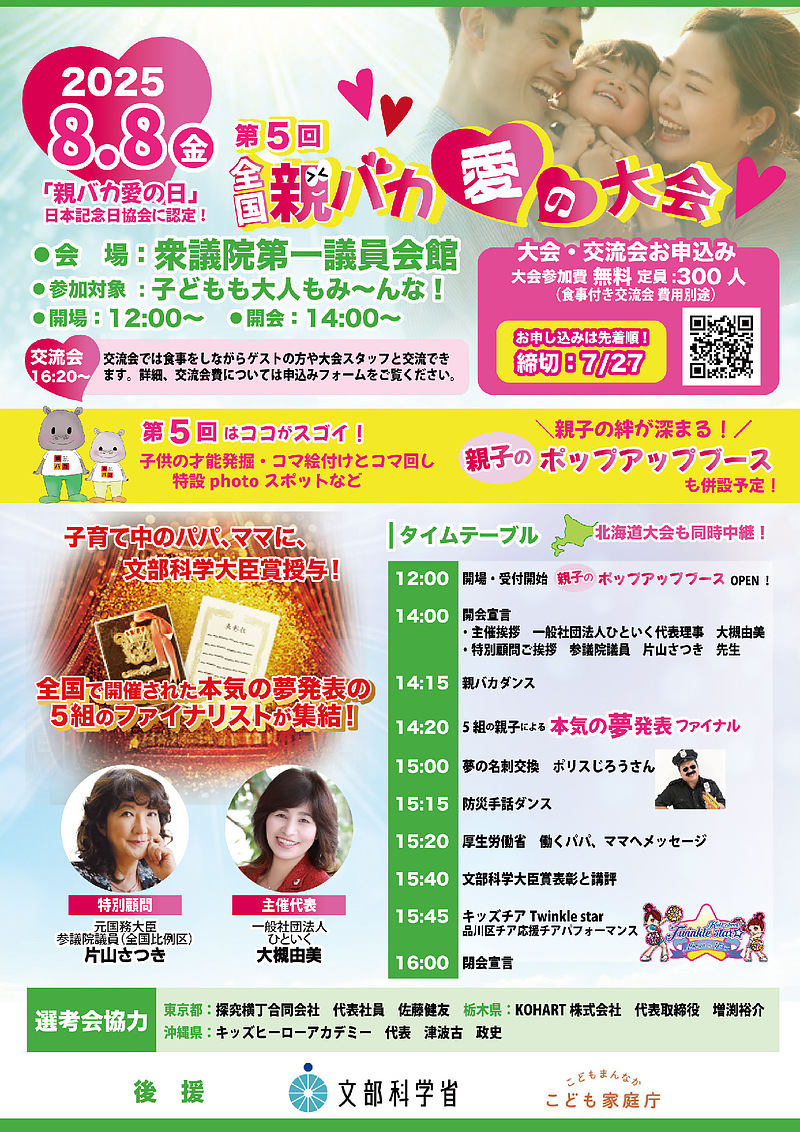 親子の夢を本気で応援する感動のイベント、「全国親バカ愛の大会」が、2025年8月8日に衆議院議員会館にて開催されます。この大会は、文部科学省とこども家庭庁の後援を受けて実施され、全国の親子がそれぞれの夢をプレゼンテーションし合い、その“親バカ愛”を分かち合うというものです。