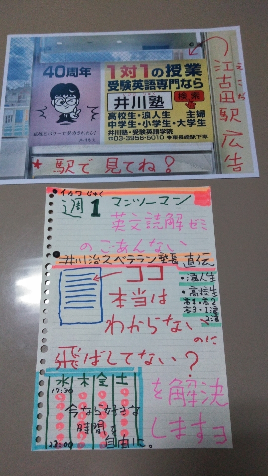 【駅広告】・・・・・・西武池袋線のお隣駅「江古田駅」の「改札口の鏡」に、当塾「井川塾・受験英語学院」の「駅広告」を掲示中です。