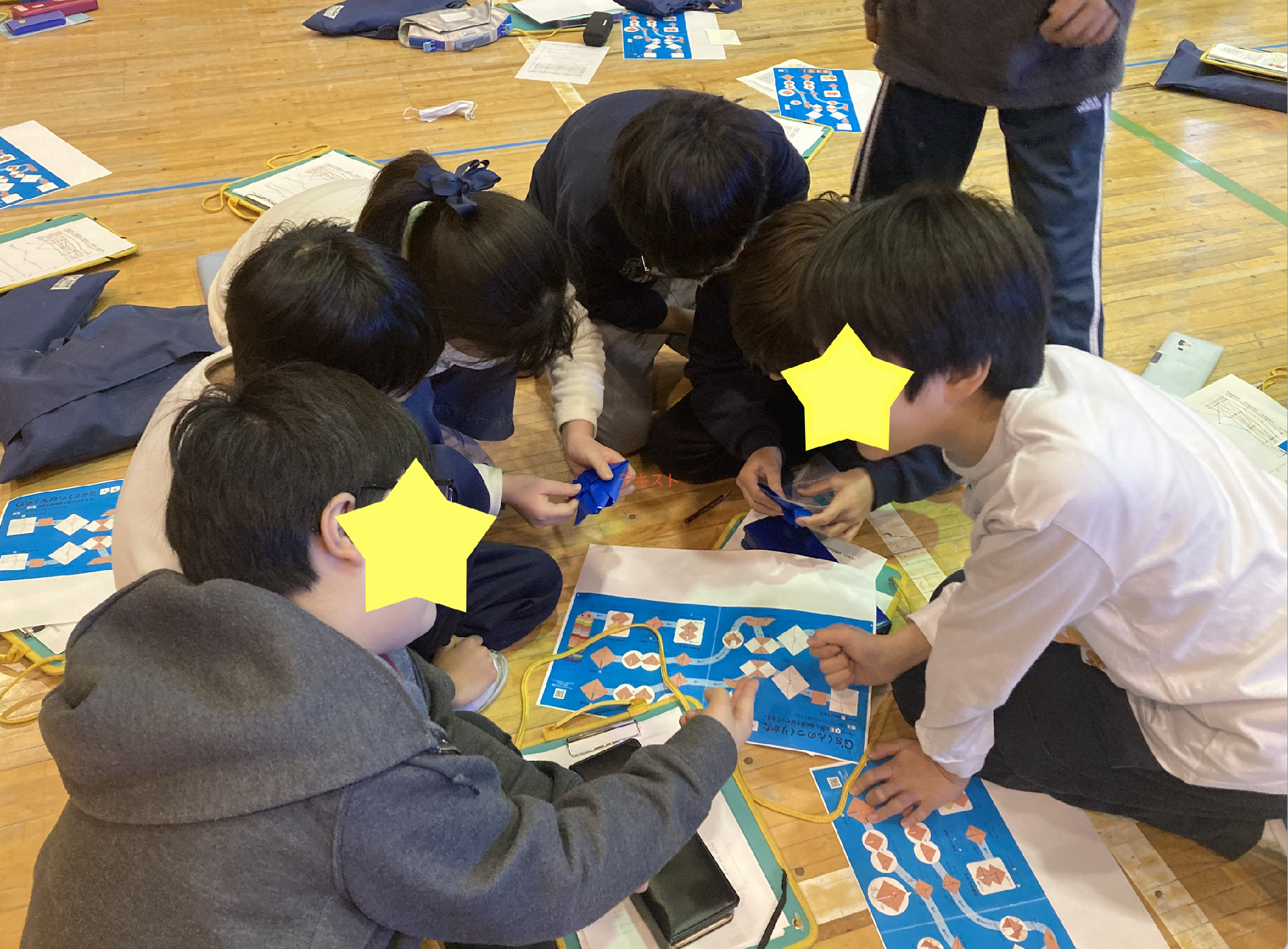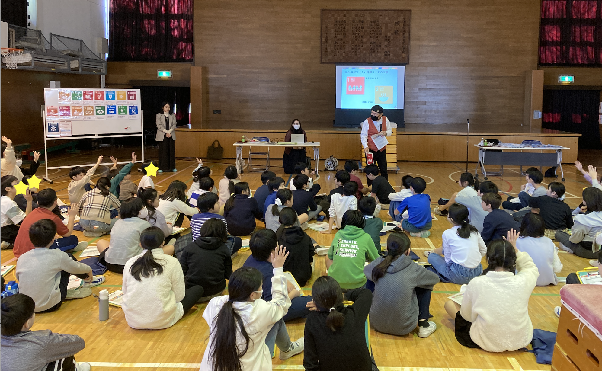 これまで実施した、SDGs出張授業などの様子を写真でお伝えします。まずは直近、2024年12月23日に伺った東京都茗荷谷の小学校にお招きいただいたときの様子です。この学校さんは昨冬に続けて2回目。SDGsについてはこれから勉強する5年生に、2時間続けての授業です。はじめはクイズから。「SDGsの目標『貧困をなくそう』のロゴマークに描かれているのは何?」「目標14『海の豊かさを守ろう』、目標15『陸の豊かさも守ろう』、なぜ「陸の豊かさ『も』なの?」こんな調子ではじめ、少し話題も皆さん真剣に聞いています。最後は、動く折り紙のSDGsキャラクター「G'sくん」づくりを。折り紙でパーツをつくり、隣の人と組み合わせて長くヘビのようにつなげます。それをグルっと丸めると? G’sくんを作る意味を説明して、終了です。