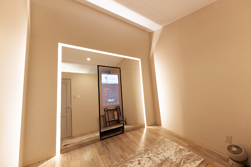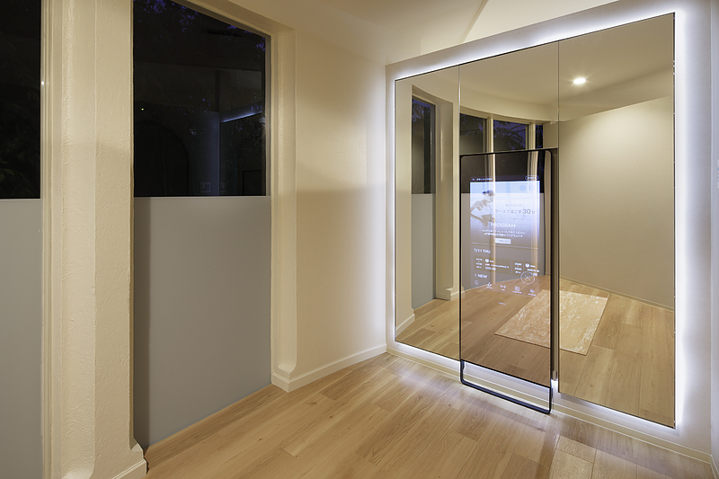 当初より、体の変化を確認できたり運動のポーズが合っているかの確認の為に、大きな鏡を設置する事をご提案していましたが、ミラーフィットブースに入るとそこには大きな鏡と共に、壁に設置された鏡に埋め込まれたミラーフィットデバイスが現れます。デバイスだけだと運動中に鏡から体が見切れたり、やはりジムなので鏡で全身を確認できると言うのは必要という事で、この案は採用される事となります。